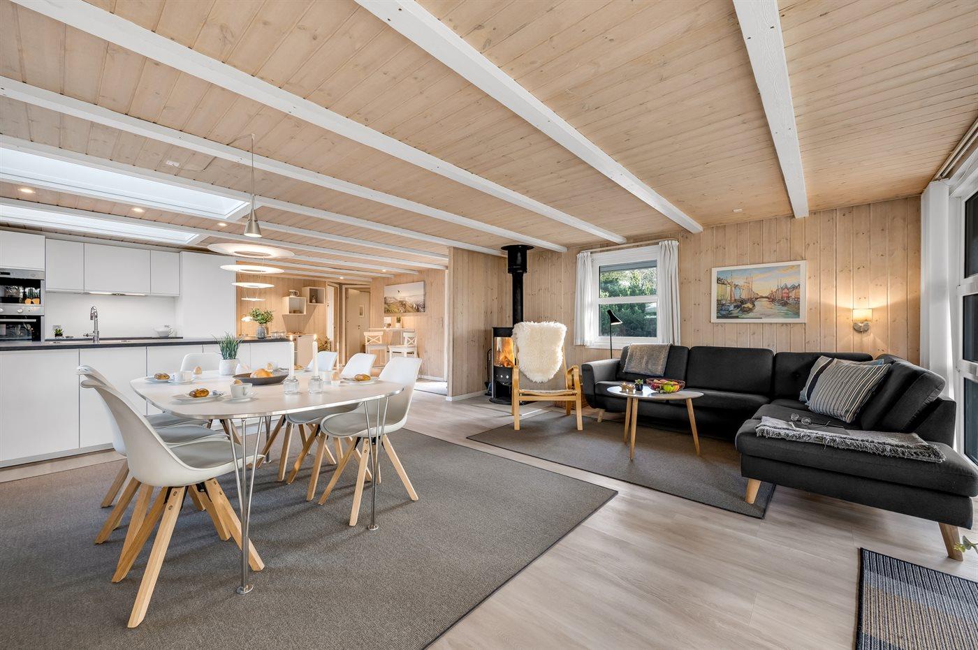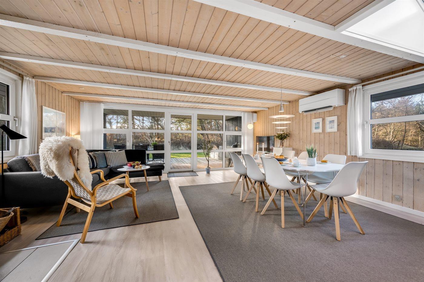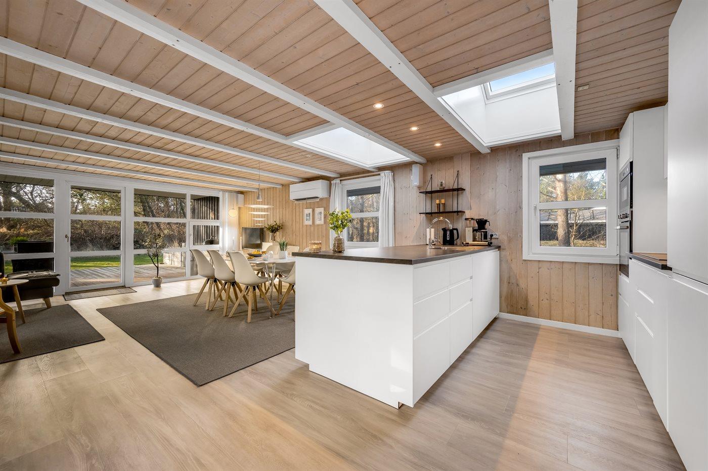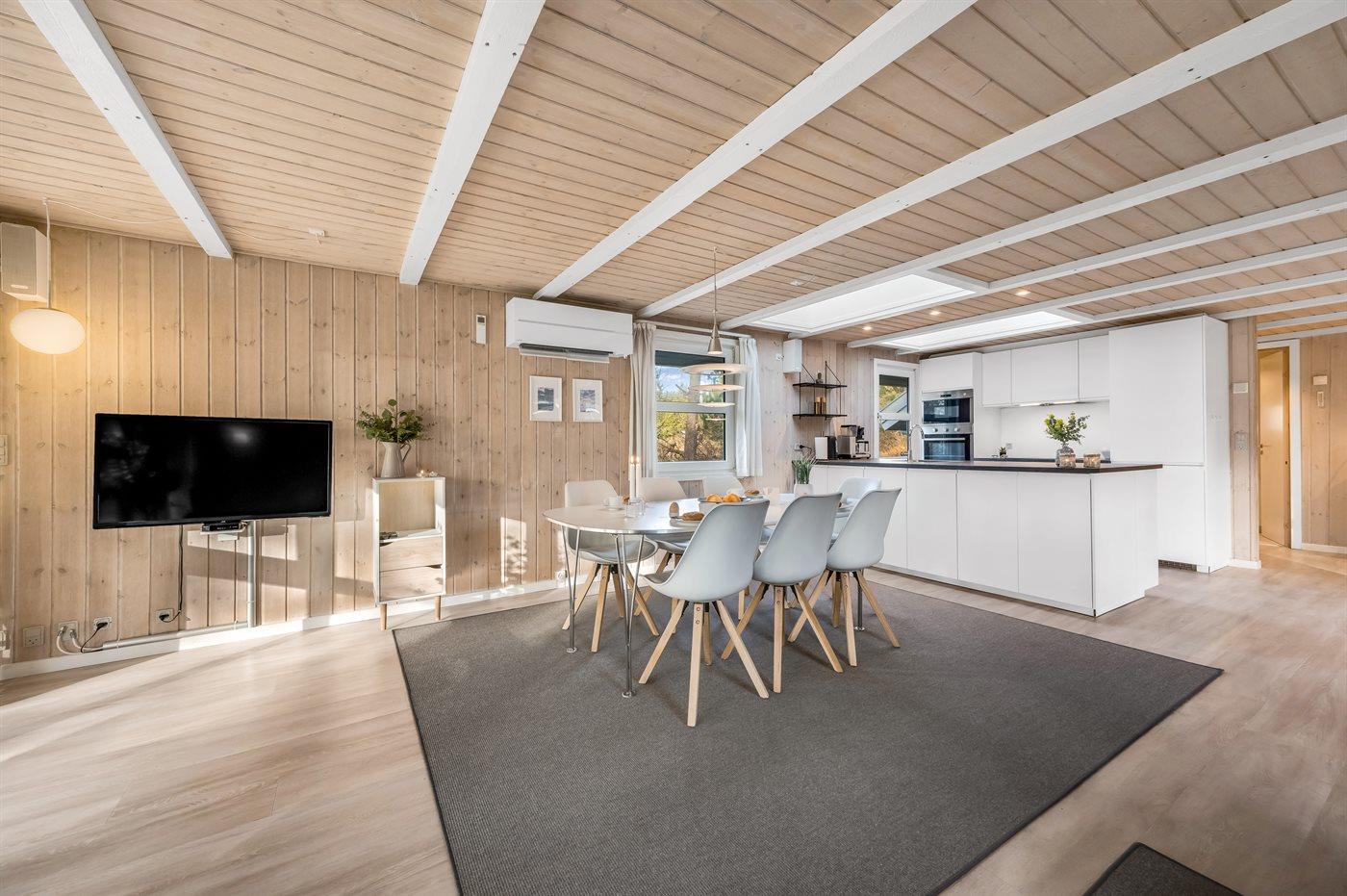 Dejligt lyst og vedligeholdt sommerhus med spa og sauna og rigtig ferieatmosfære. Huset er beliggende på en ugenert grund med græsplæne og omkranset af nåletræer. I 2020 har ferieboligen gennemgået en gennemgribende indvendig renovering. Ferieboligen er indrettet med åben køkken/alrum og stue, hvor ovenlysvinduer og det store vinduesparti mod den overdækkede terrasse giver et godt og lyst indtryk.