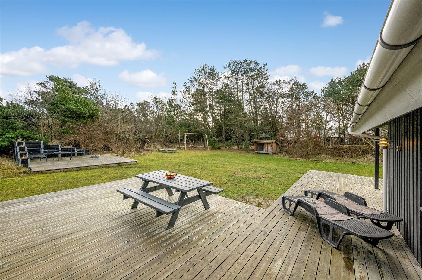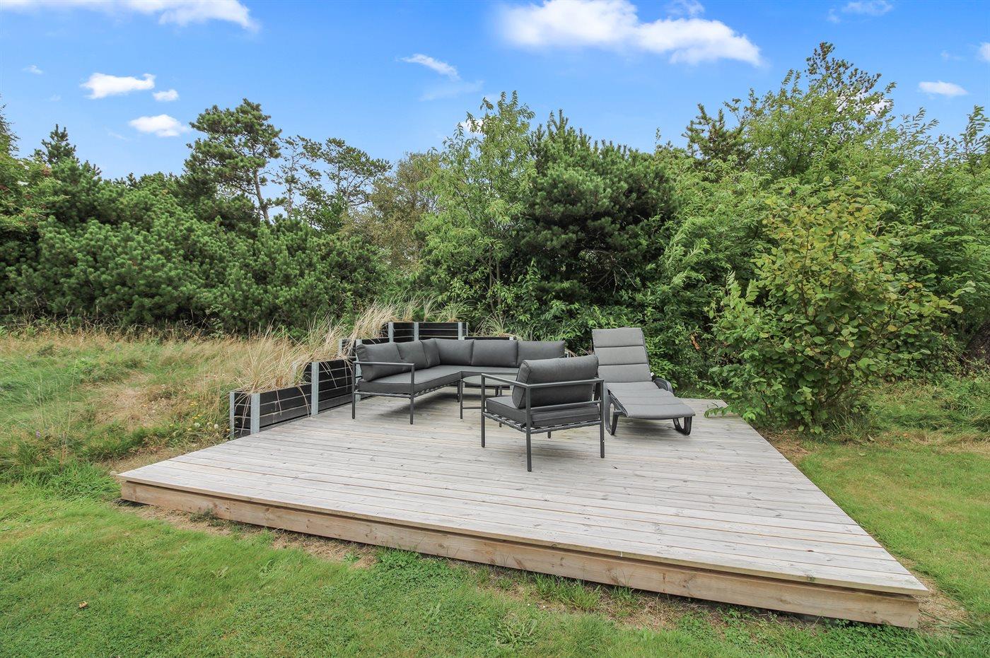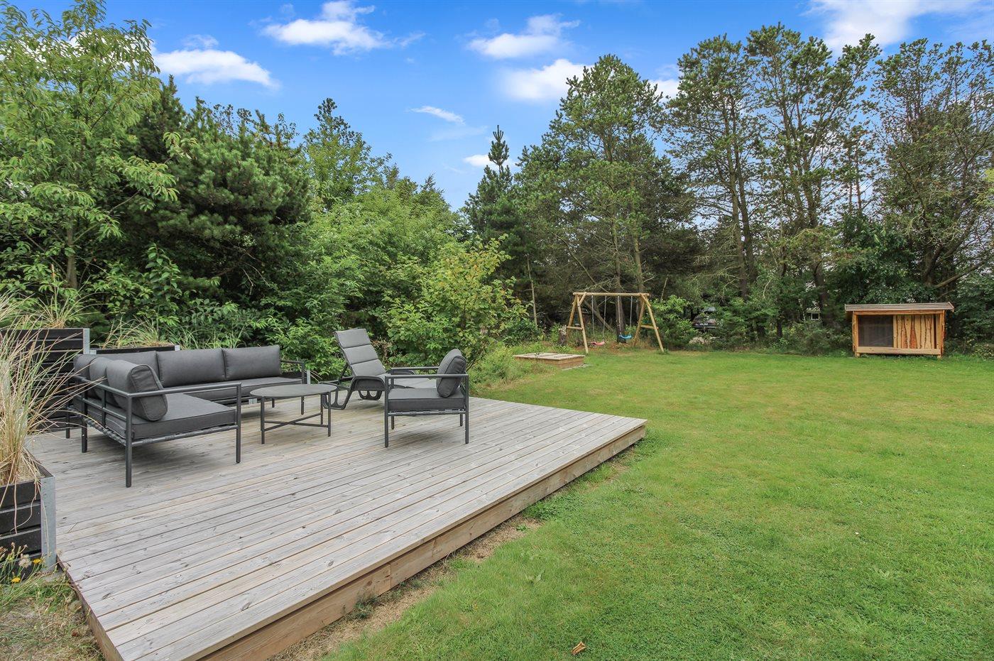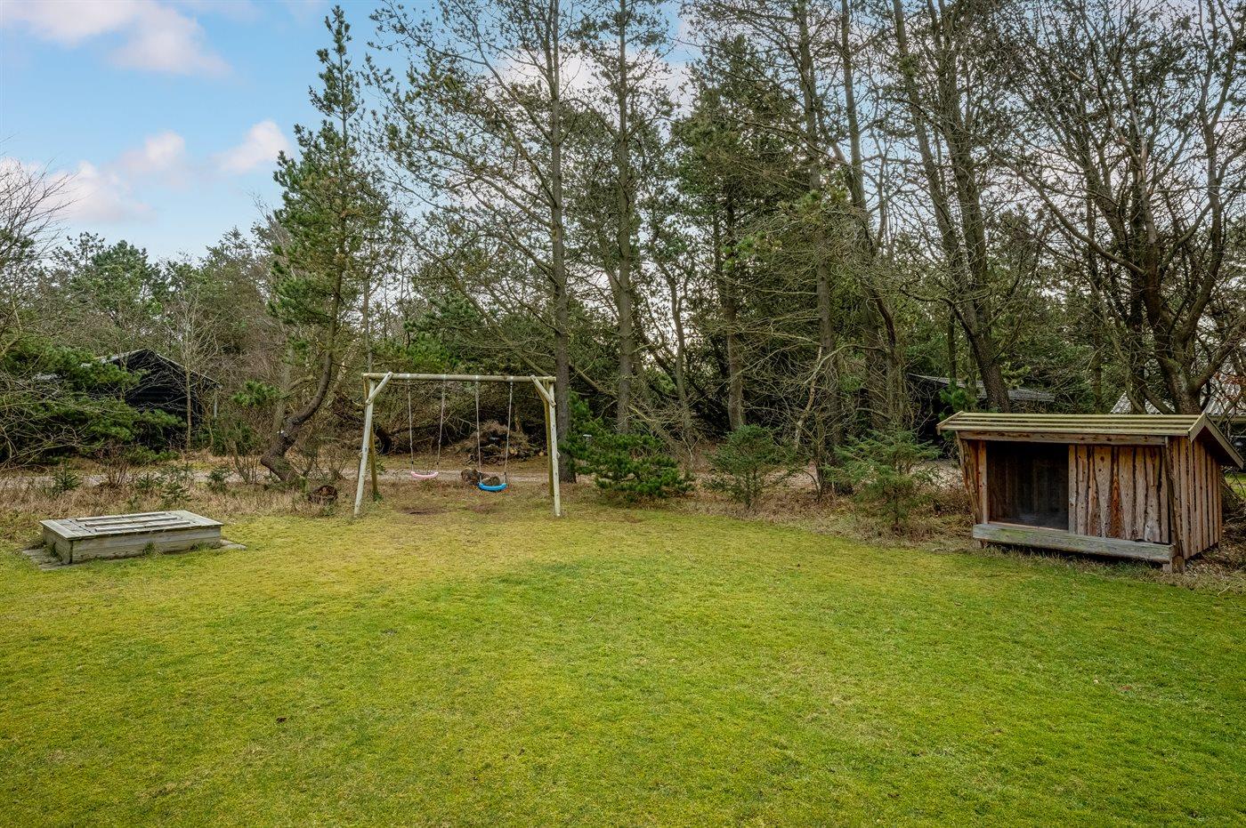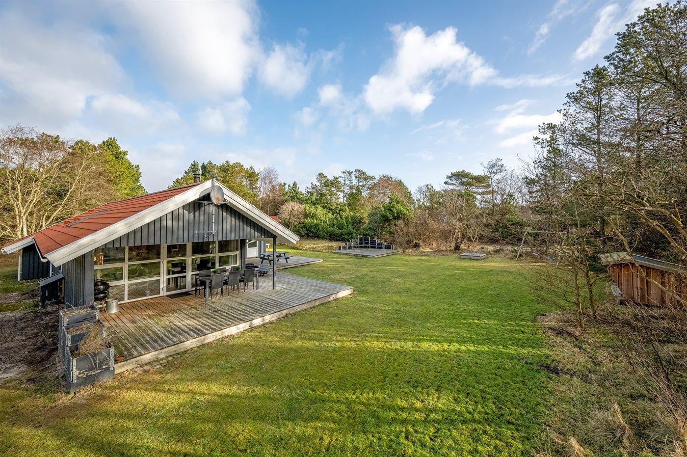 Ferieboligen er beliggende på en 1864 m² stor naturgrund. Der er 1000 m til havet. 200 m til fredelig skov- og naturområder med et rigt dyreliv. Nærmeste forretning er beliggende i en afstand af 400 m. Til ferieboligen hører 100 m² terrasseareal. Desuden er der 20 m² overdækket terrasse. Der er redskabsrum. Gynge. Sandkasse. Der er carport til rådighed. Der er installeret stik til opladning af elbil. Parkering ved ferieboligen.