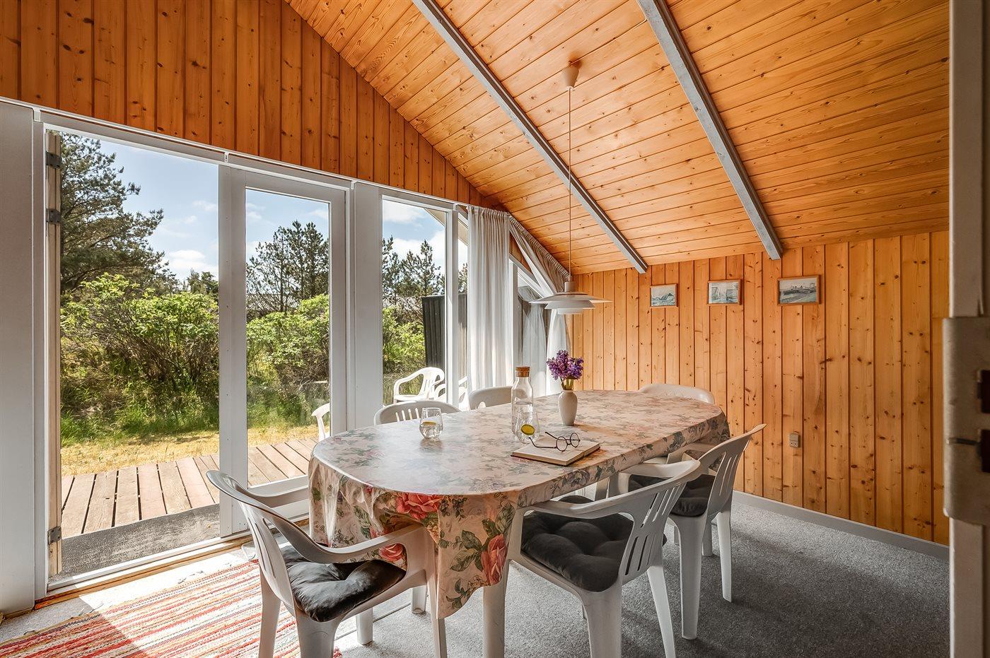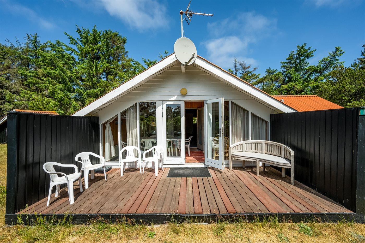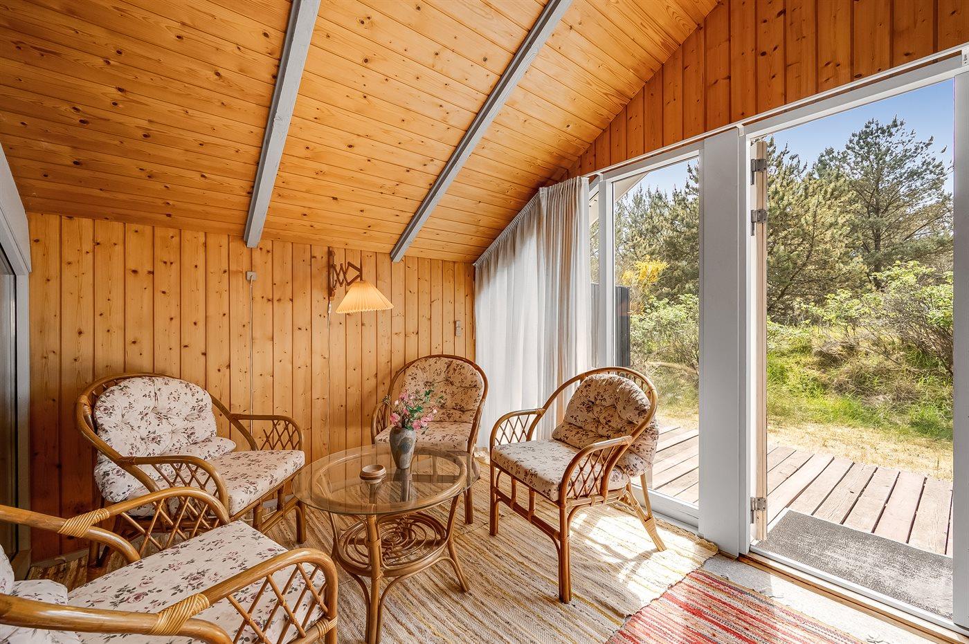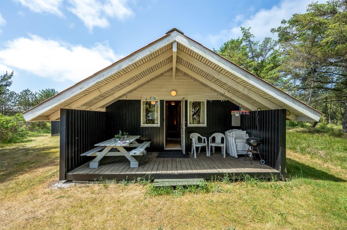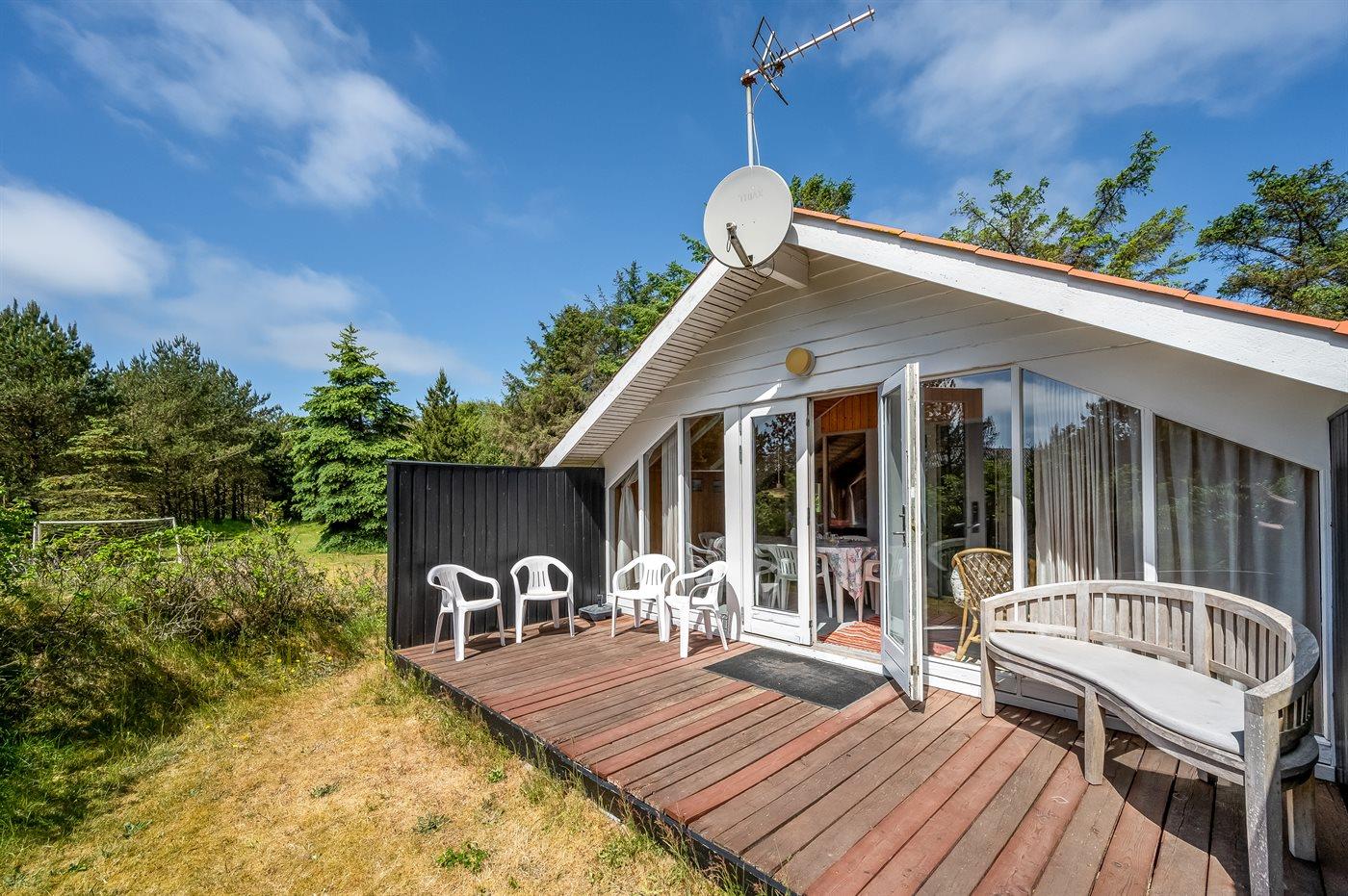 Familie feriehus kun 800 meter fra stranden, beliggende på en stor naturgrund. Udendørs er der 2 terrasser: 1 på 8 m2 overdækket østvendt terrasse med havebænk og 1 sydvestvendt med havemøbler. Stor grund med sandkasse og plads til boldspil.
