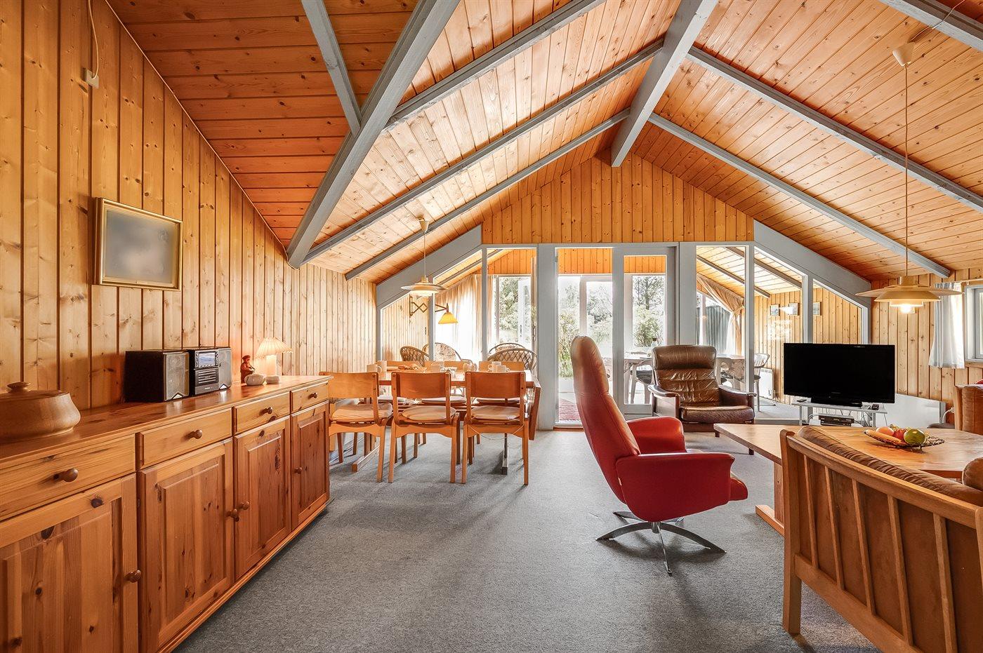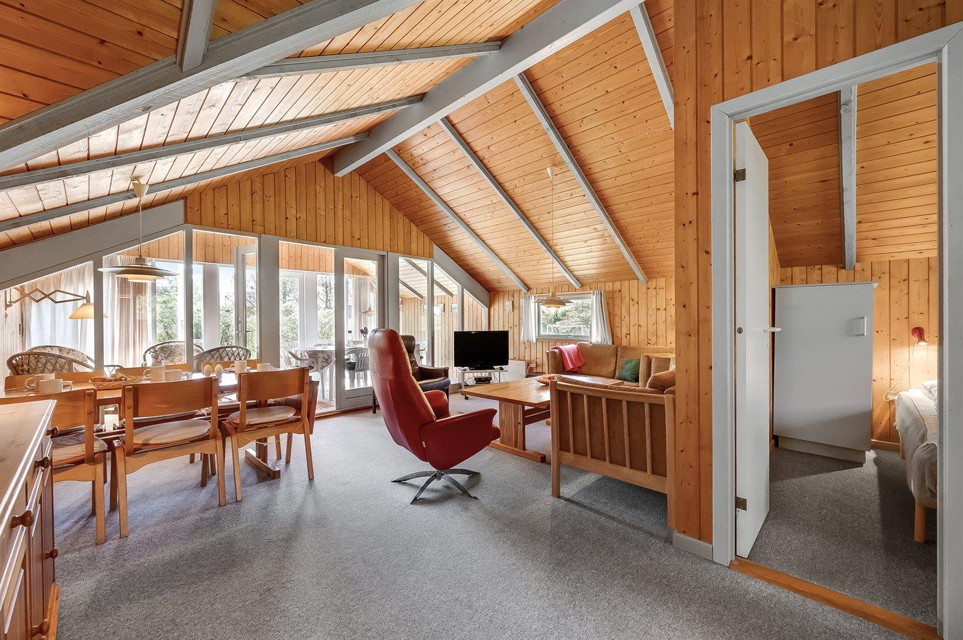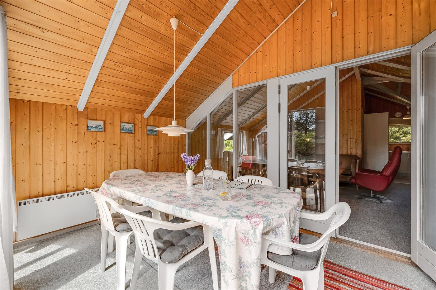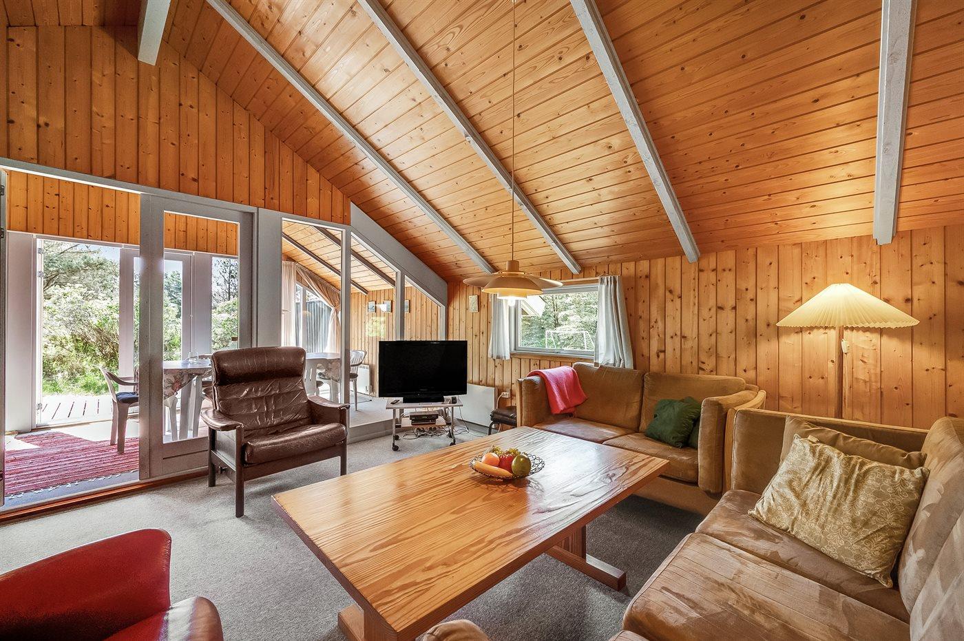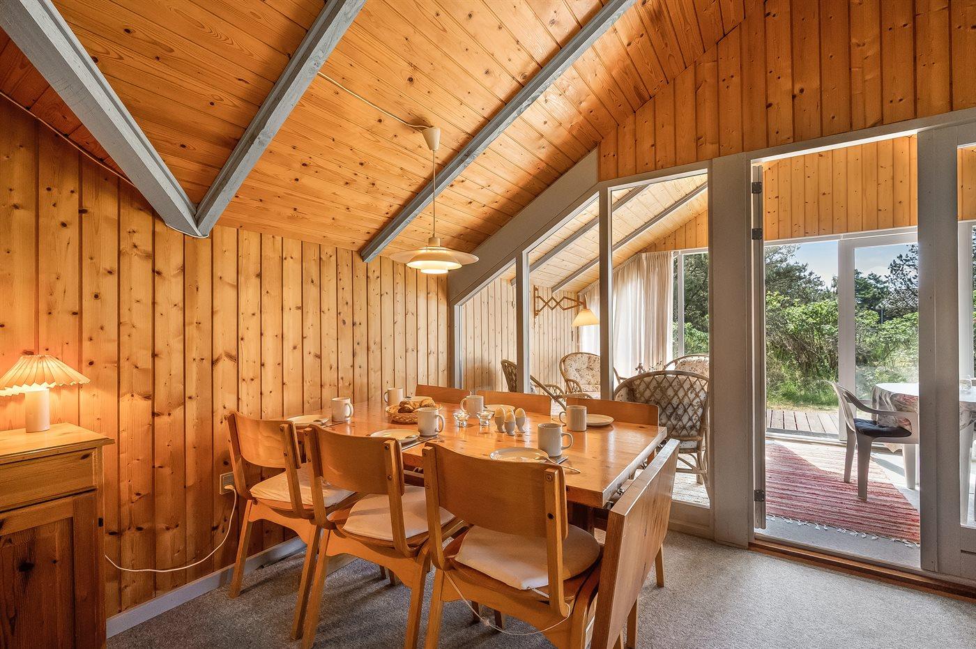 Familie feriehus kun 800 meter fra stranden, beliggende på en stor naturgrund. Udendørs er der 2 terrasser: 1 på 8 m2 overdækket østvendt terrasse med havebænk og 1 sydvestvendt med havemøbler. Stor grund med sandkasse og plads til boldspil.