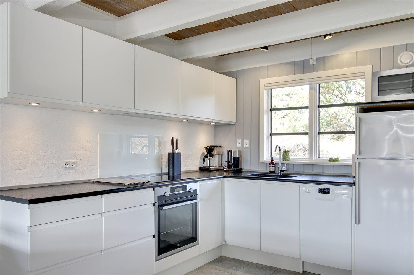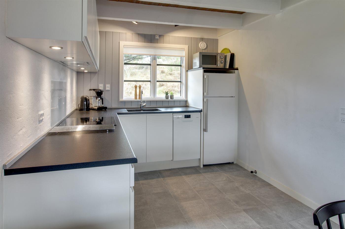Huset har en veludstyret køkkenafdeling med 4 keramiske kogeplader, emhætte, varmluftovn, mikroovn, 160 liter køleskab, 41 liter fryser, kaffemaskine og el-kedel. I badeværelset er der klinkegulve med varme, bruseniche, håndvask, toilet, samt indgang til en dejlig sauna, hvor man rigtig kan slappe af.