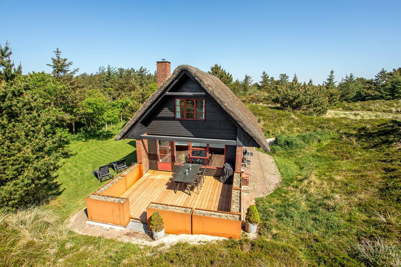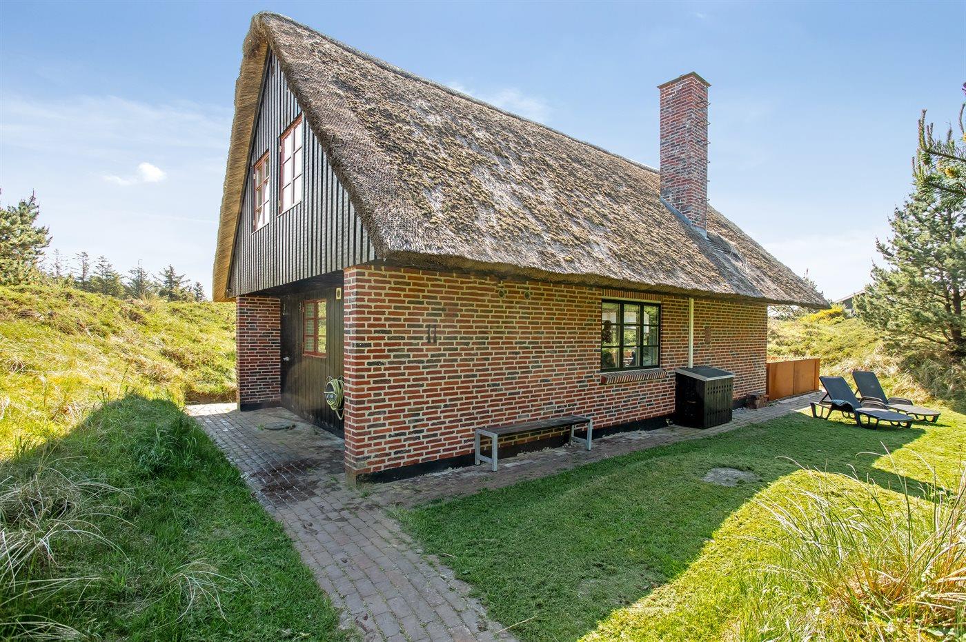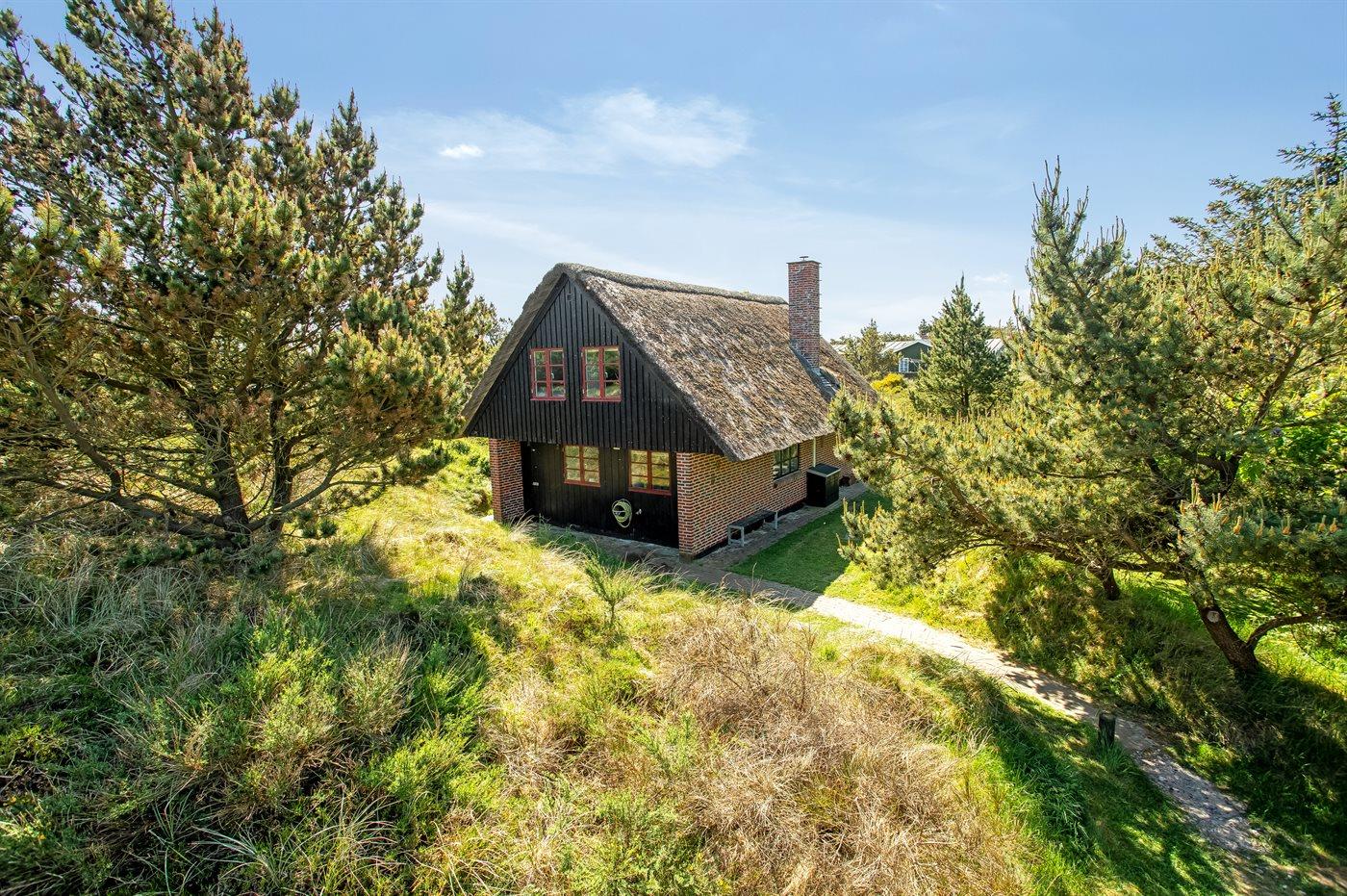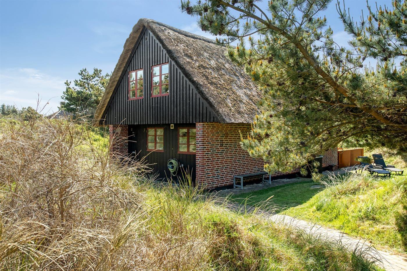Dette hyggelige stråtækte feriehus ligger på en 2.857 m² stor og lyngklædt klitgrund, med havkig fra klittoppen. Der er kun 500 meter til havet og indkøbsmuligheder.