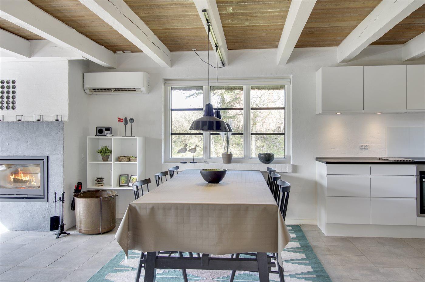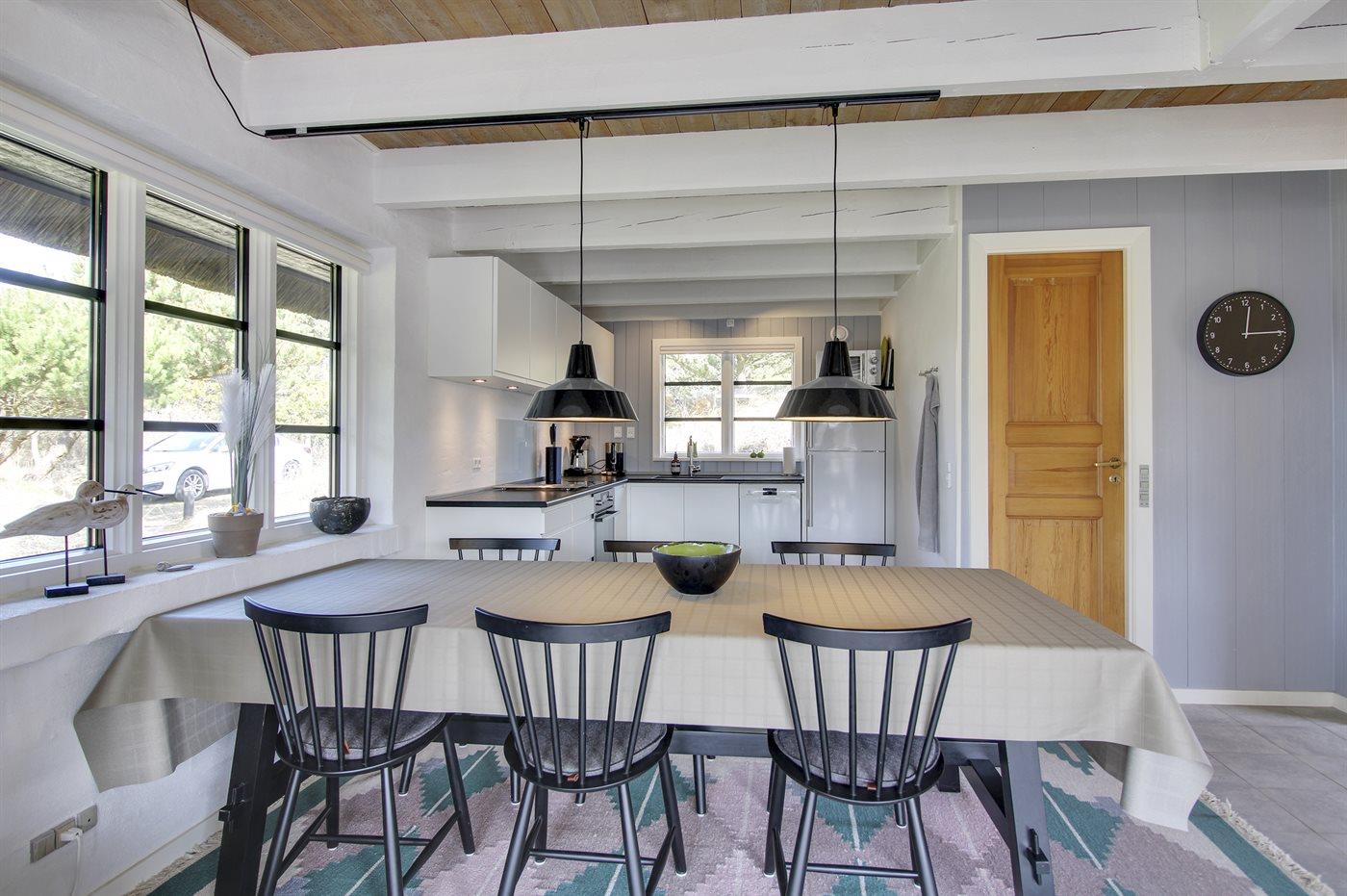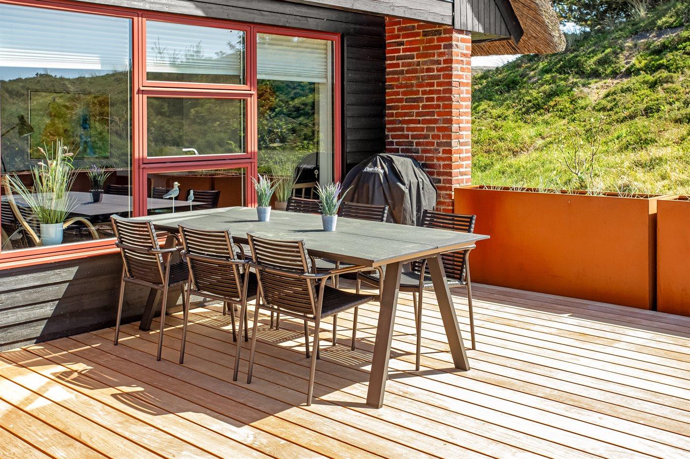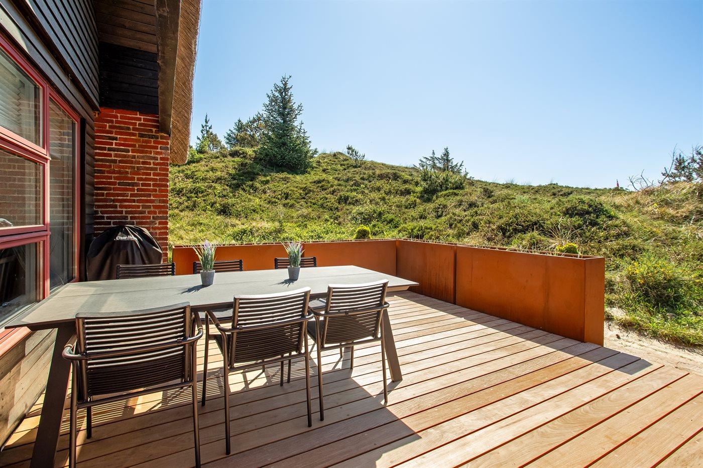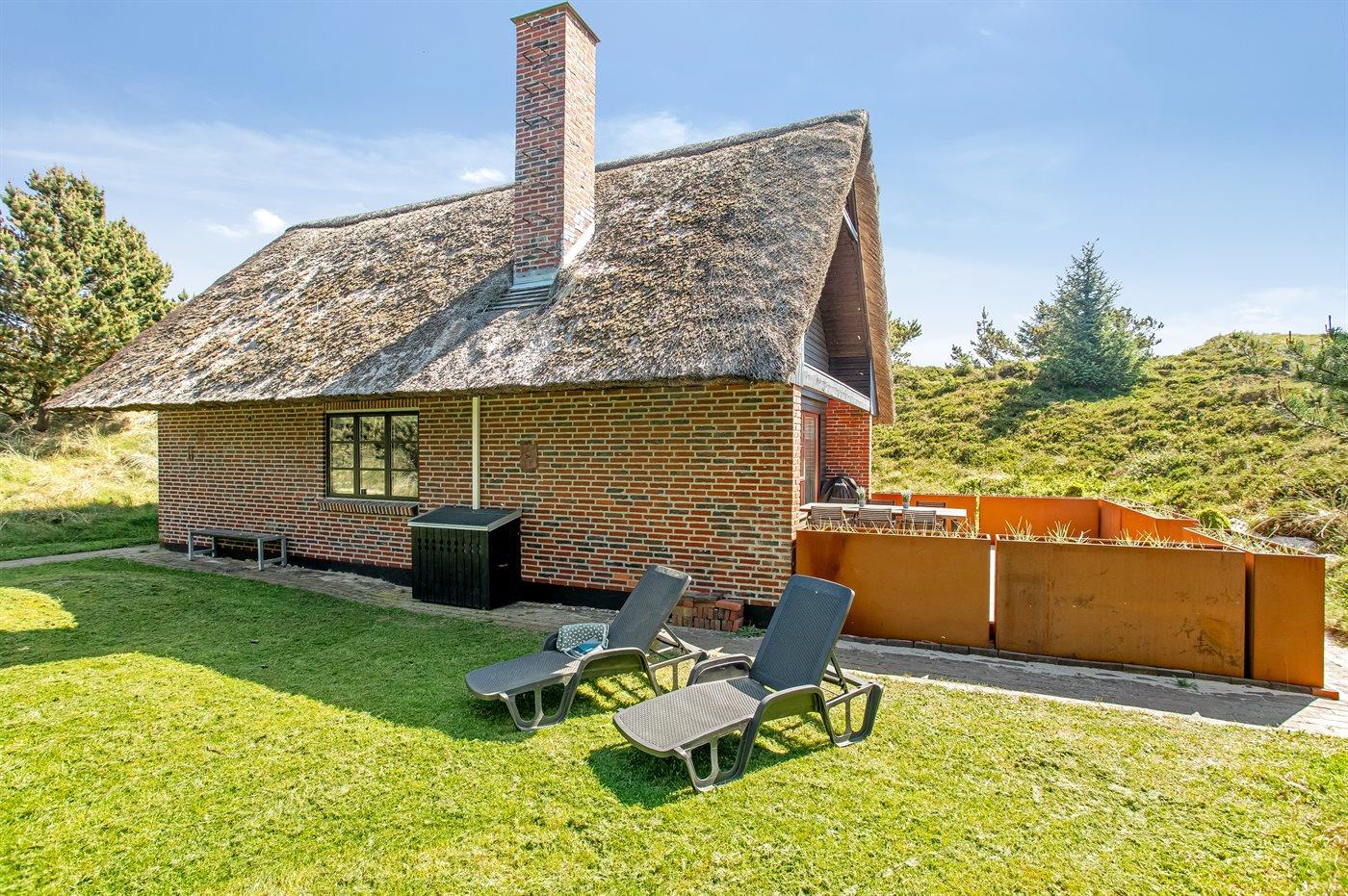 Dette hyggelige stråtækte feriehus ligger på en 2.857 m² stor og lyngklædt klitgrund, med havkig fra klittoppen. Der er kun 500 meter til havet og indkøbsmuligheder.