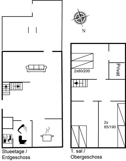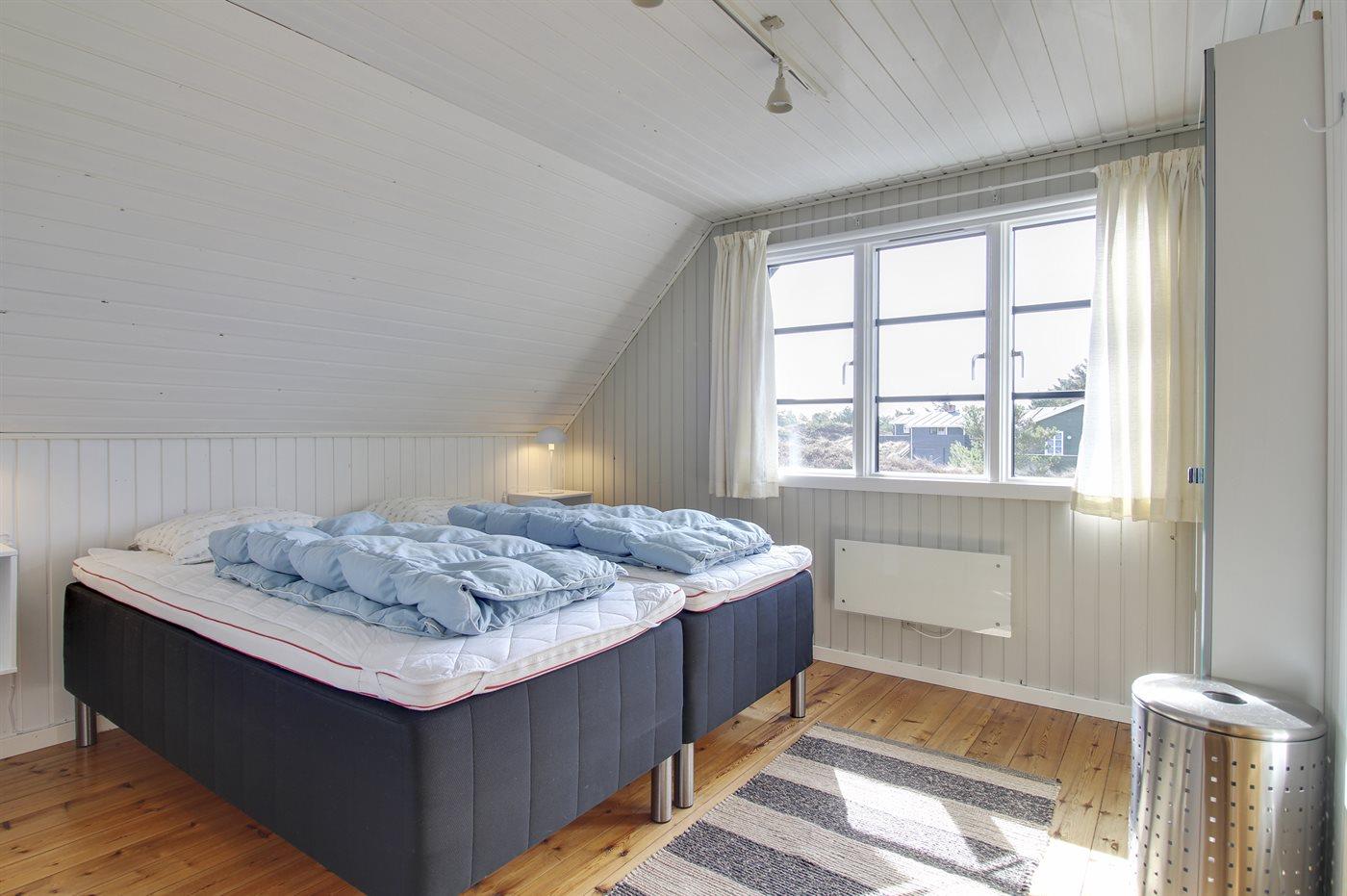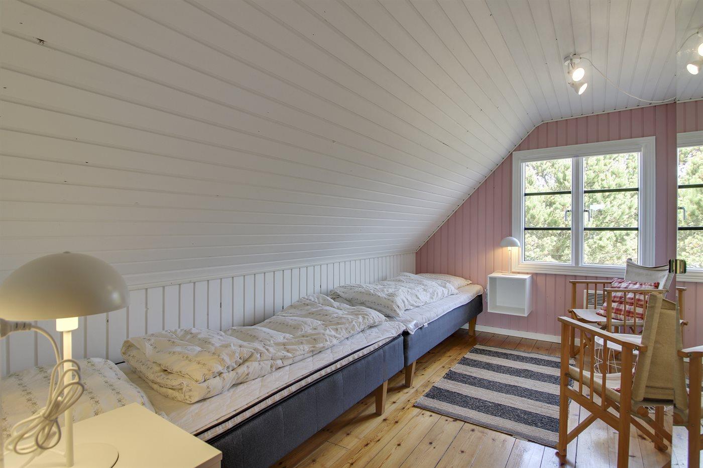 På 1. sal, hvor gulvene er af massive fyrtræsplanker, er der et dejligt arbejdsbord på den åbne repos og 3 soveværelser. 2 soveværelser med dobbeltseng til 2 personer og 1 soveværelse med 2 enkeltsenge.