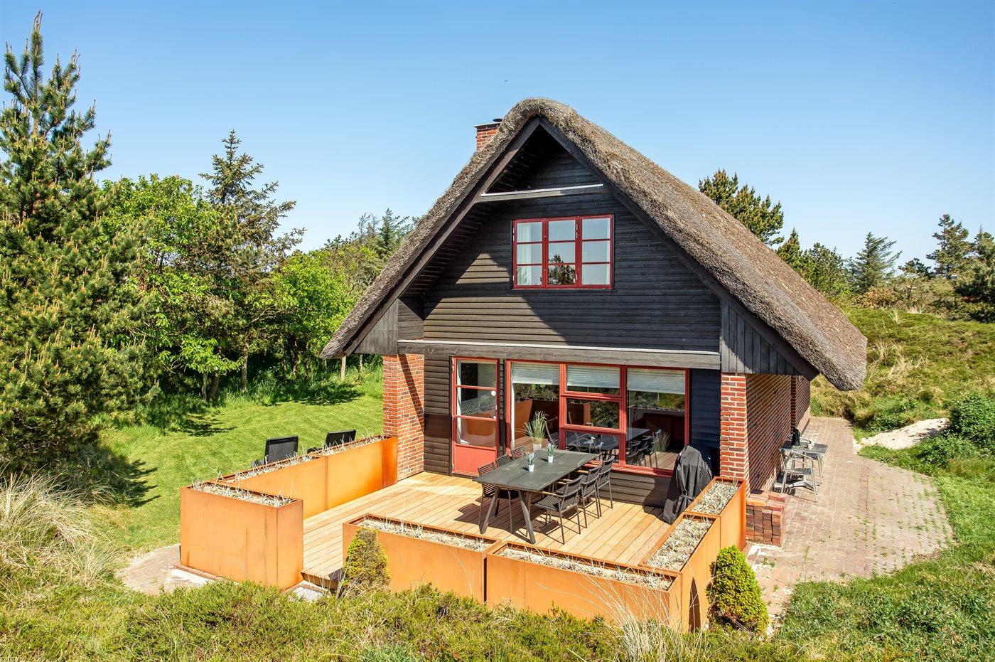 Hyggeligt stråtækt feriehus nær Vejers Strand med havkig, sauna og lukket terrasse.
