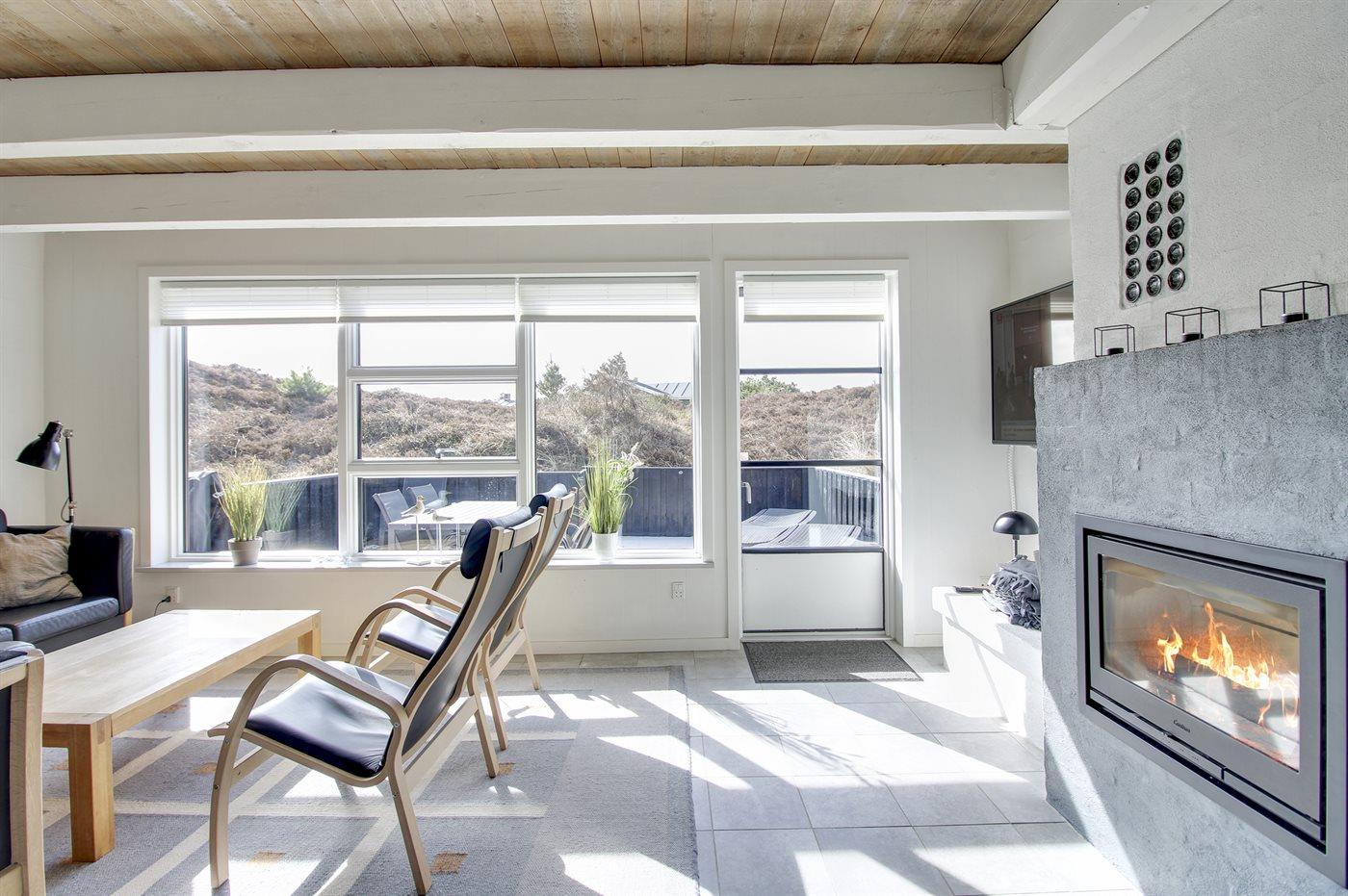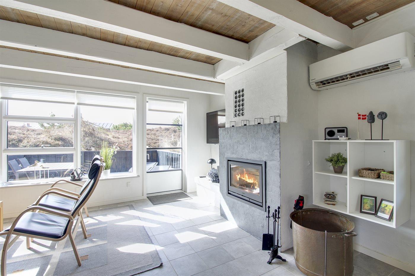 Stuen er med klinkegulve, løse tæpper og behagelige møbler. I stuen findes der ny, godkendt og miljøvenlig pejseindsats og energibesparende varmepumpe. Der er TV med danske programmer samt enkelte tyske programmer. Der er internet-radio og der er installeret gratis trådløst internet (200/200 Mbit).