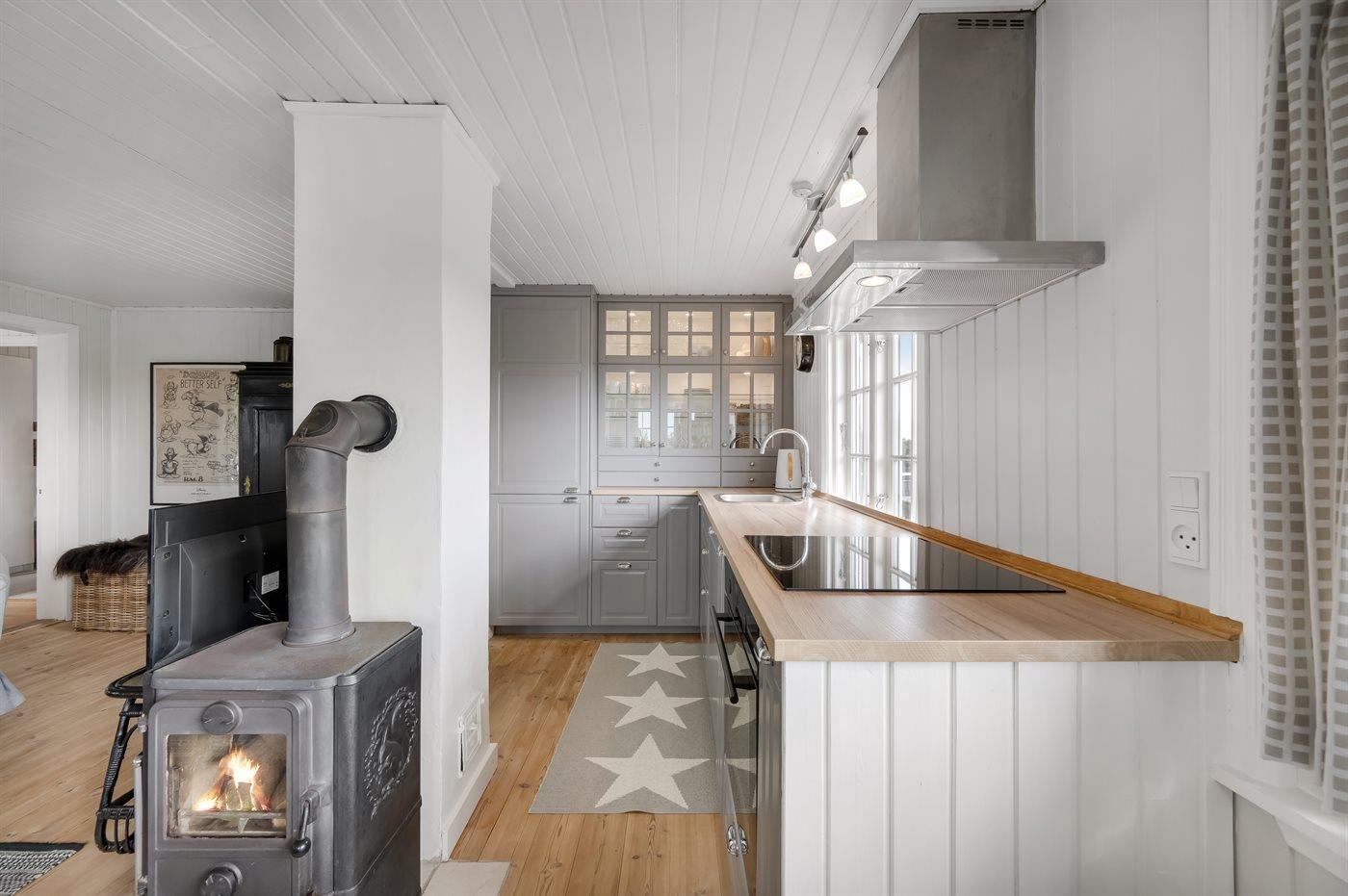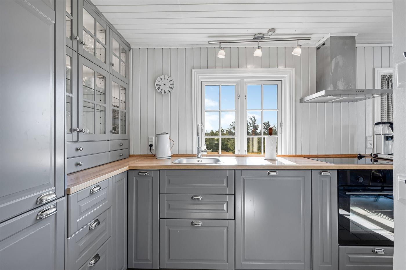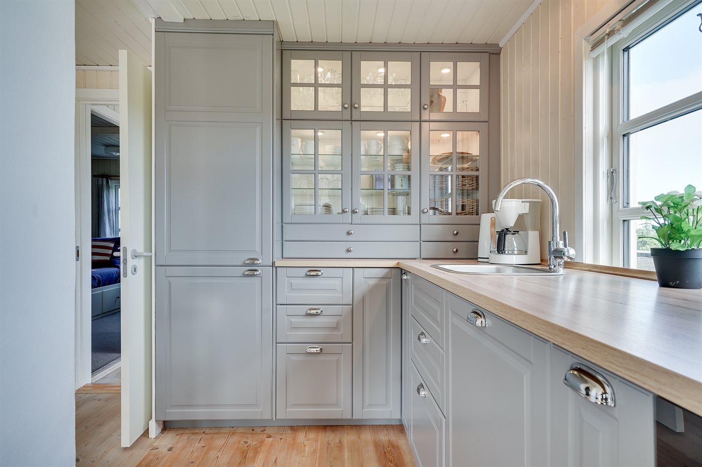 Køkkenet er udstyret med 1 køleskab. Der er 4 keramiske kogeplader, bageovn, mikrobølgeovn samt opvaskemaskine.