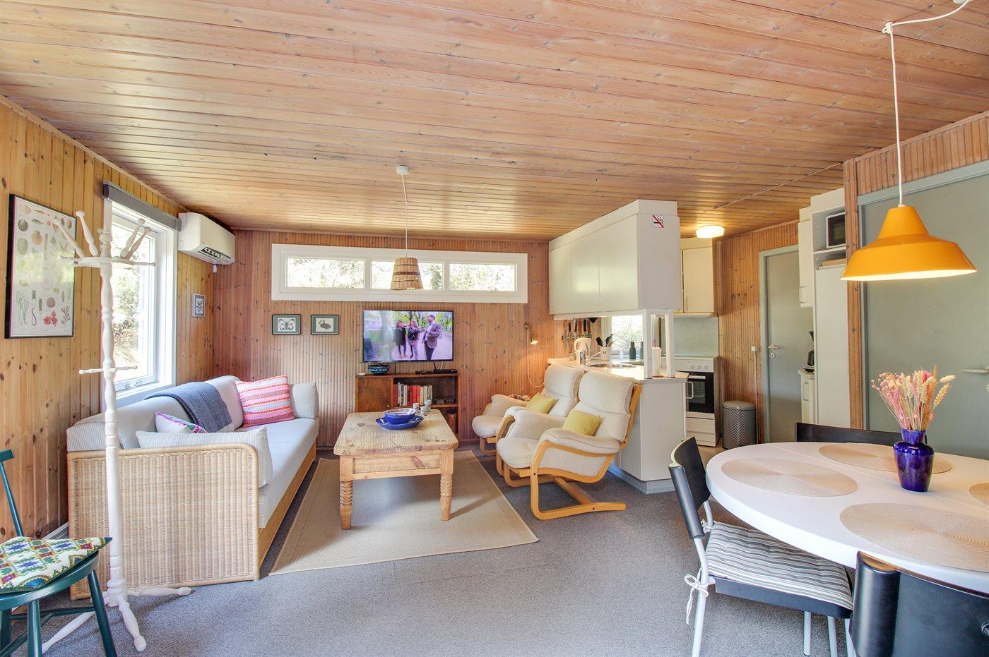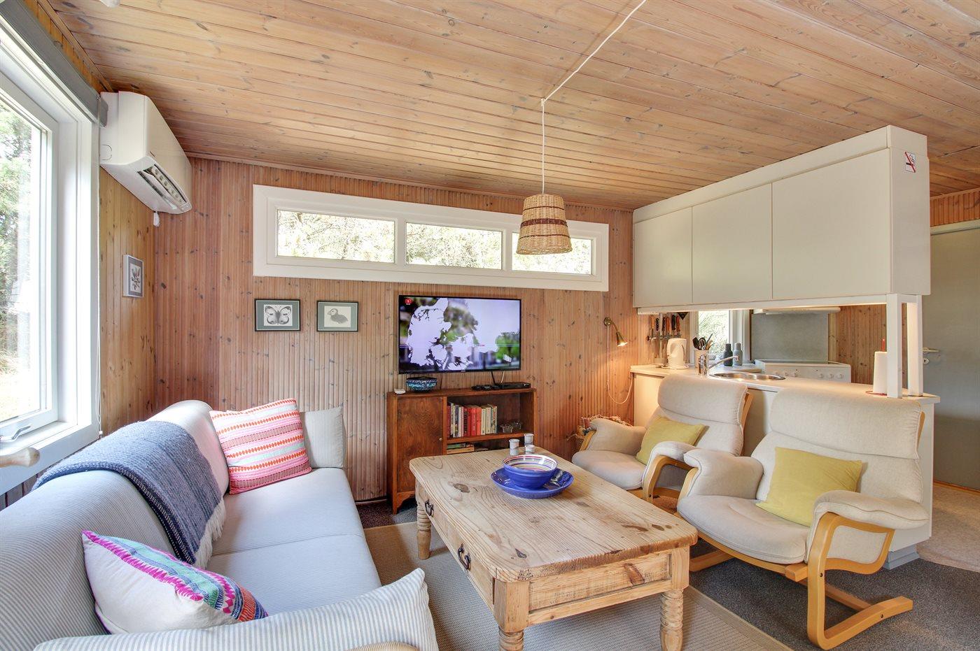 Hyggeligt og velholdt sommerhus beliggende meget privat og lidt gemt i klitterne på en ugenert grund ved enden af blind vej. Til huset hører et solrigt terrasseareal i læ for vinden.