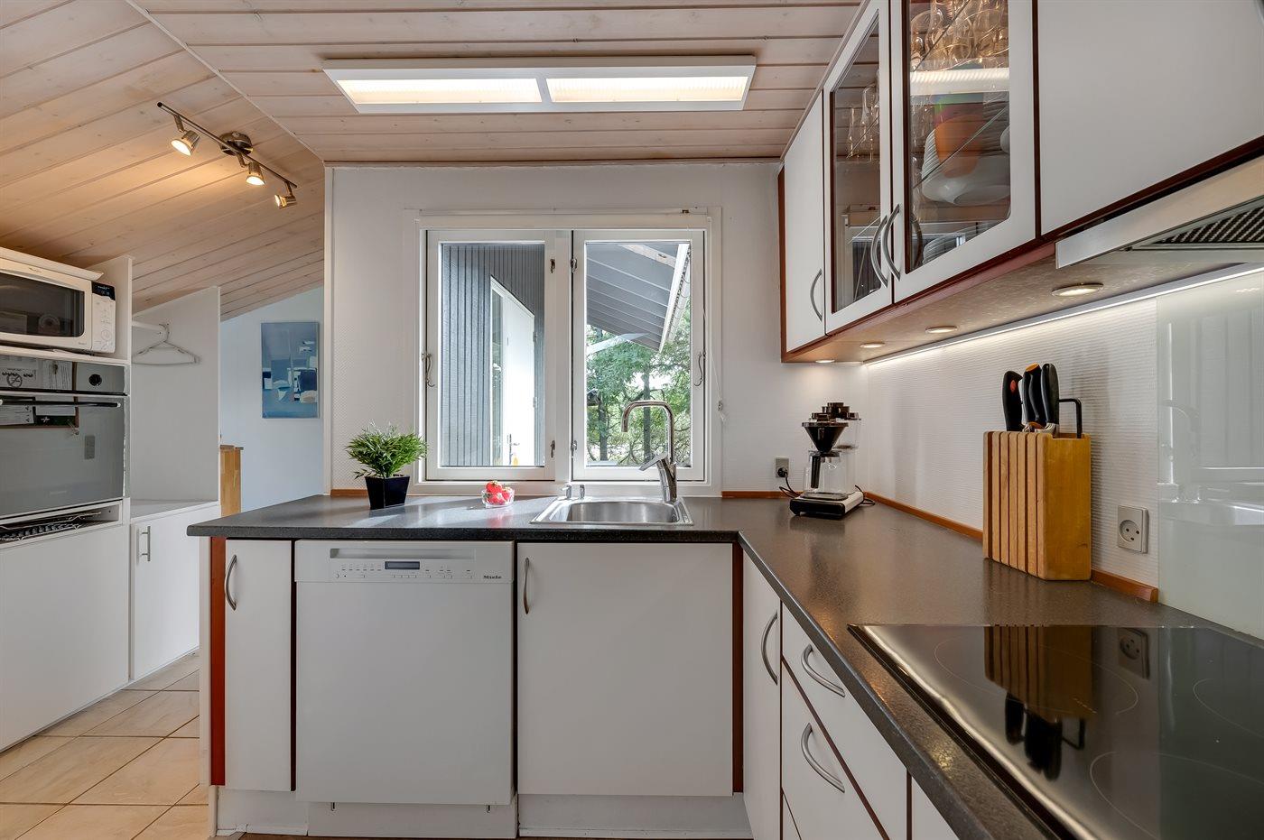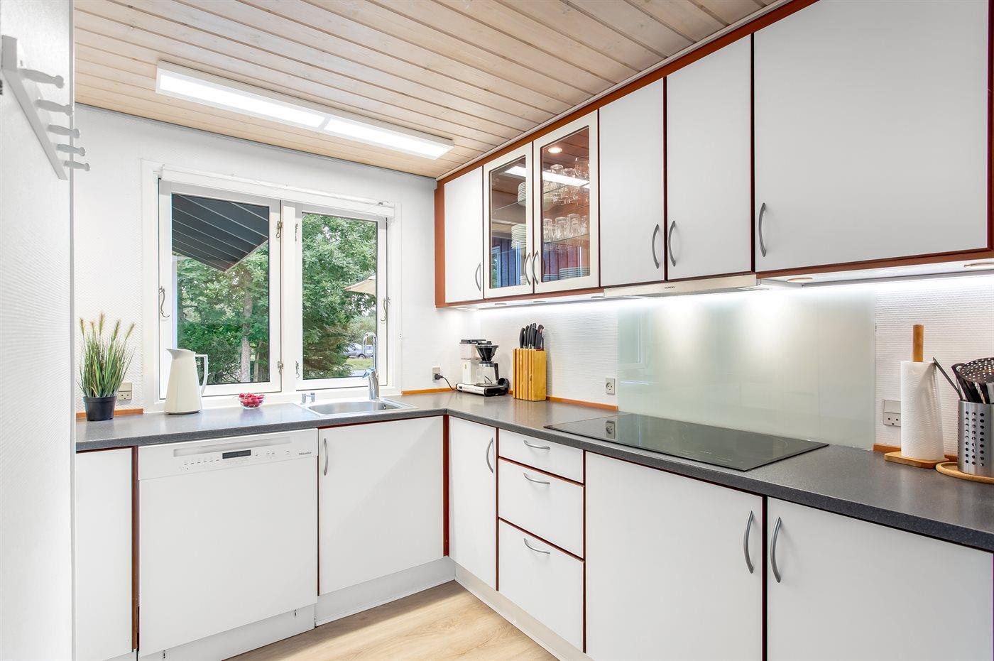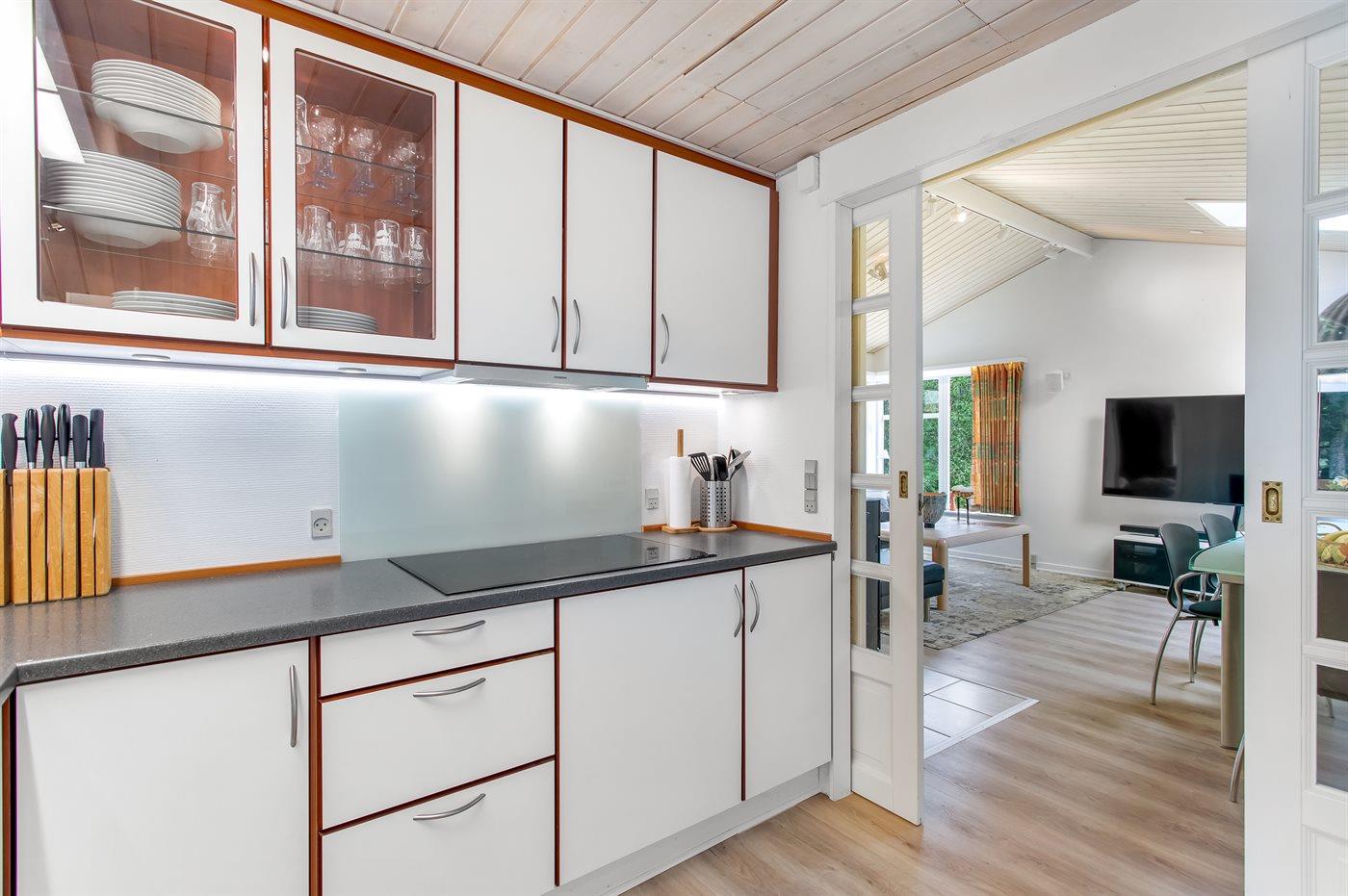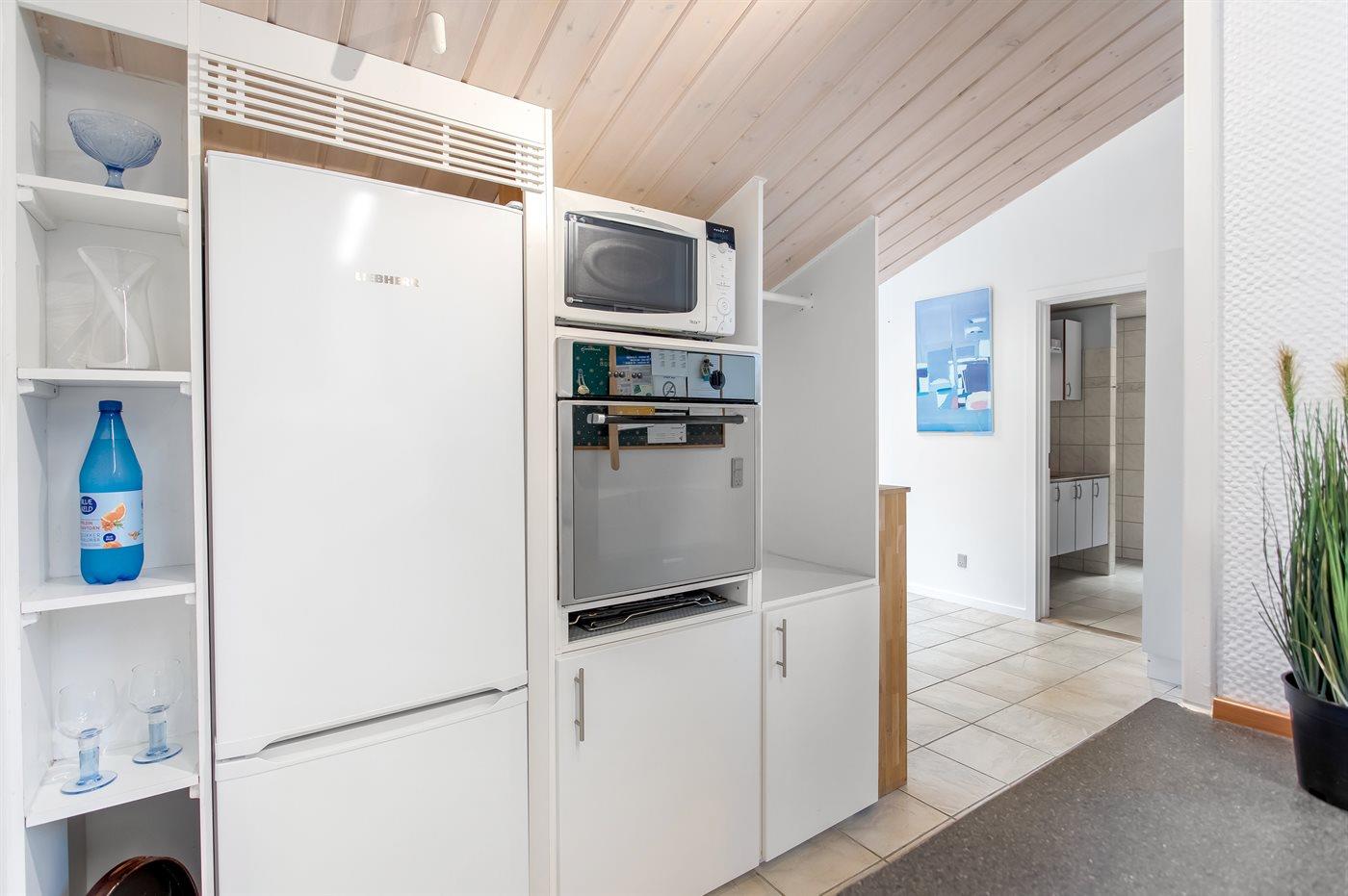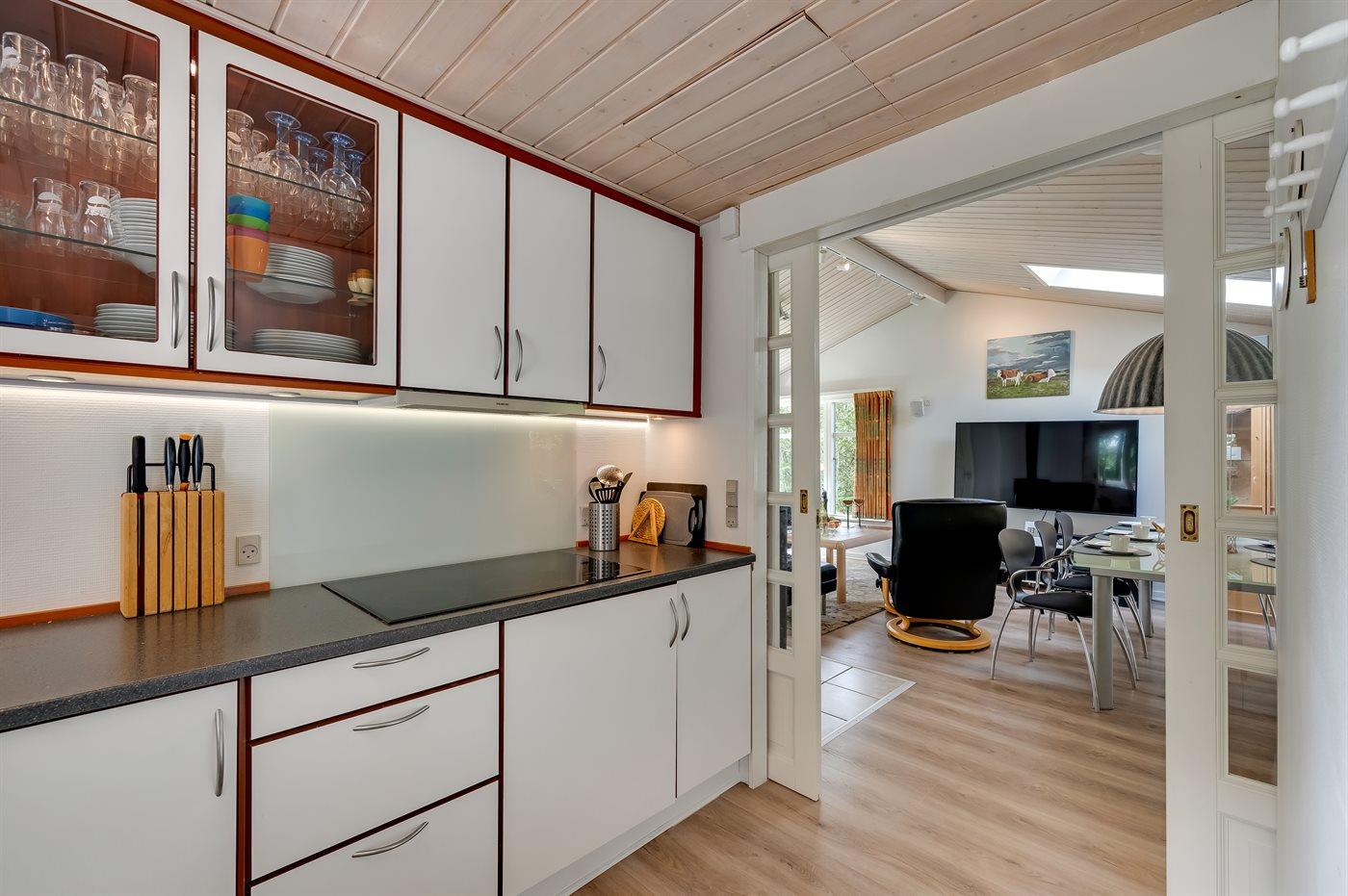 Køkkenet er udstyret med 1 køleskab. Der er 4 induktionskogeplader, varmluftovn, mikrobølgeovn samt opvaskemaskine.