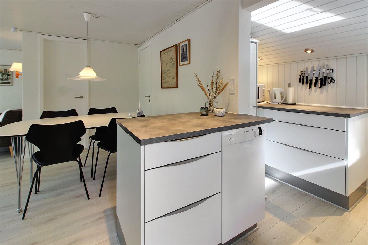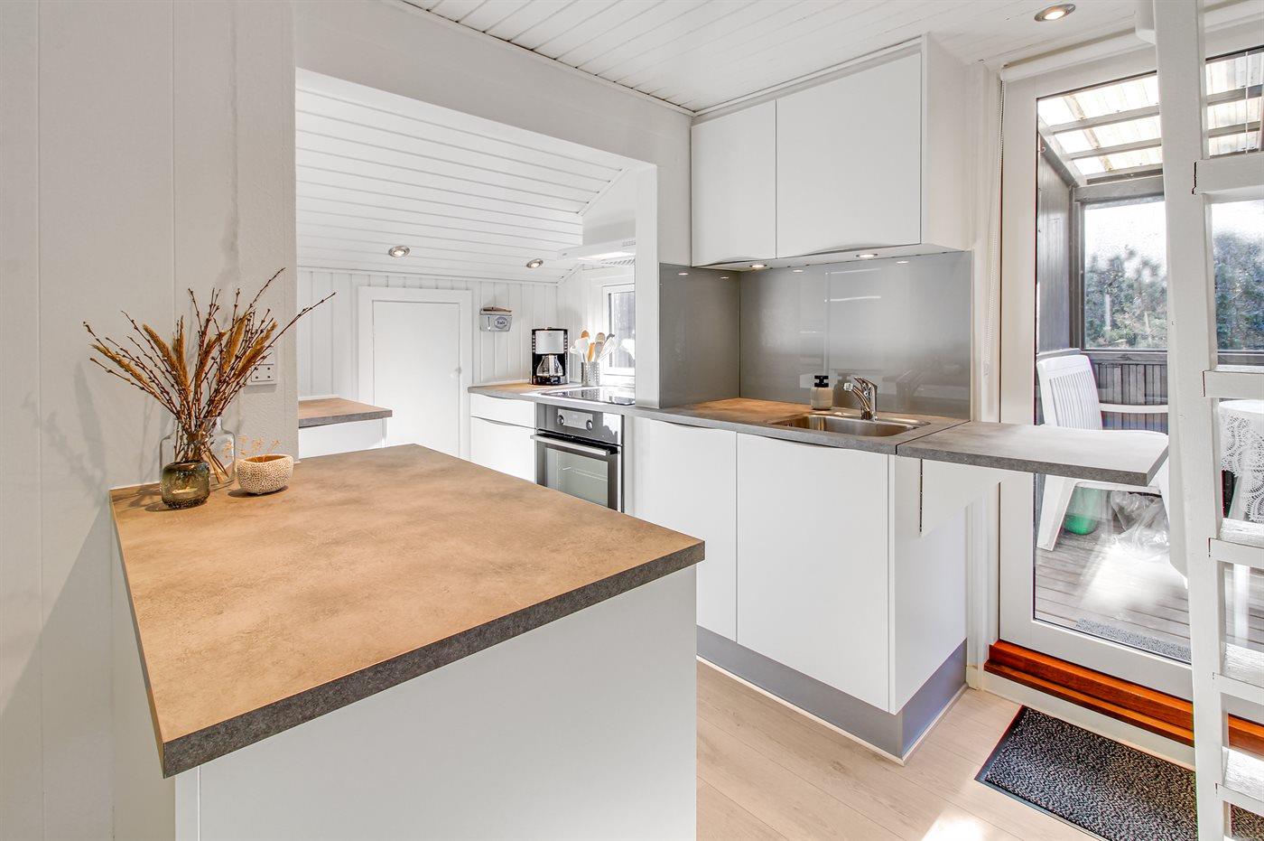 Køkkenet er udstyret med 1 køleskab. Der er 4 keramiske kogeplader, bageovn, mikrobølgeovn samt opvaskemaskine.
