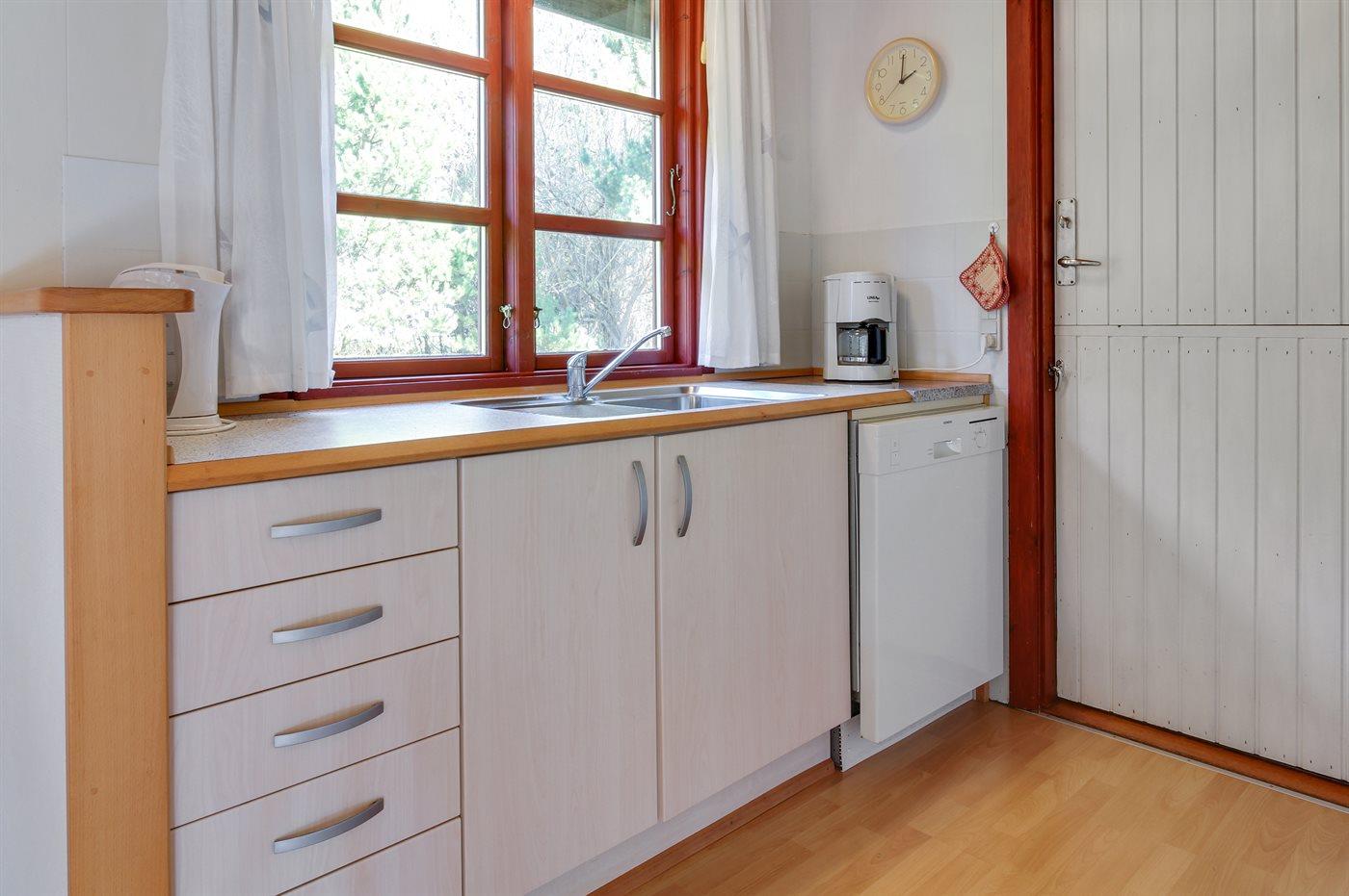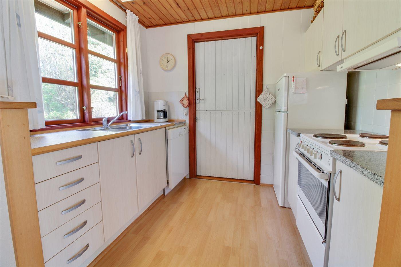 Køkkenet er udstyret med 1 køleskab. Der er 4 elkogeplader, bageovn samt opvaskemaskine.