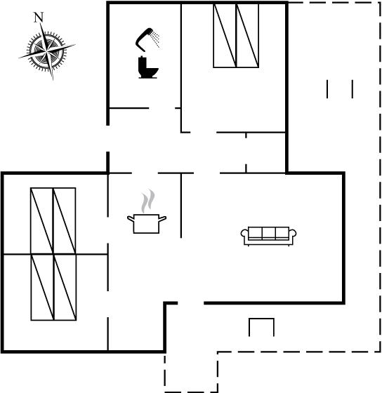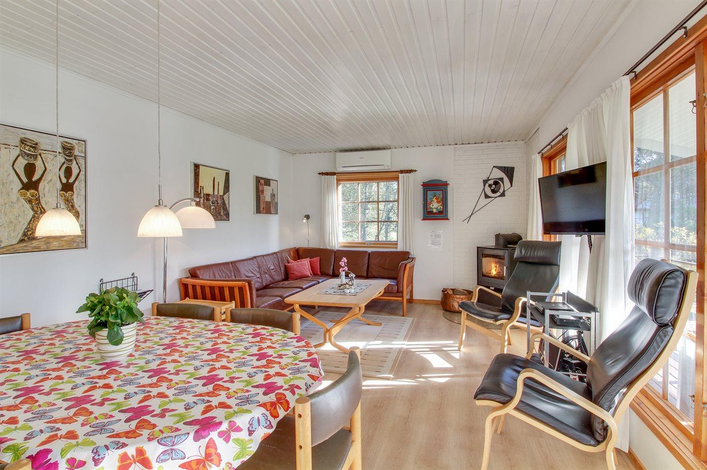 Hyggeligt feriehus på dejlig stor grund, omkranset af træer. I stuen forefindes spiseplads til 6 personer, sofa og lænestol. Til huset hører redskabsrum/cykelskur, som kan låses samt 1 dame- og 1 herrecykel (service er gæsternes eget ansvar – der garanteres ikke for cyklernes tilstand).