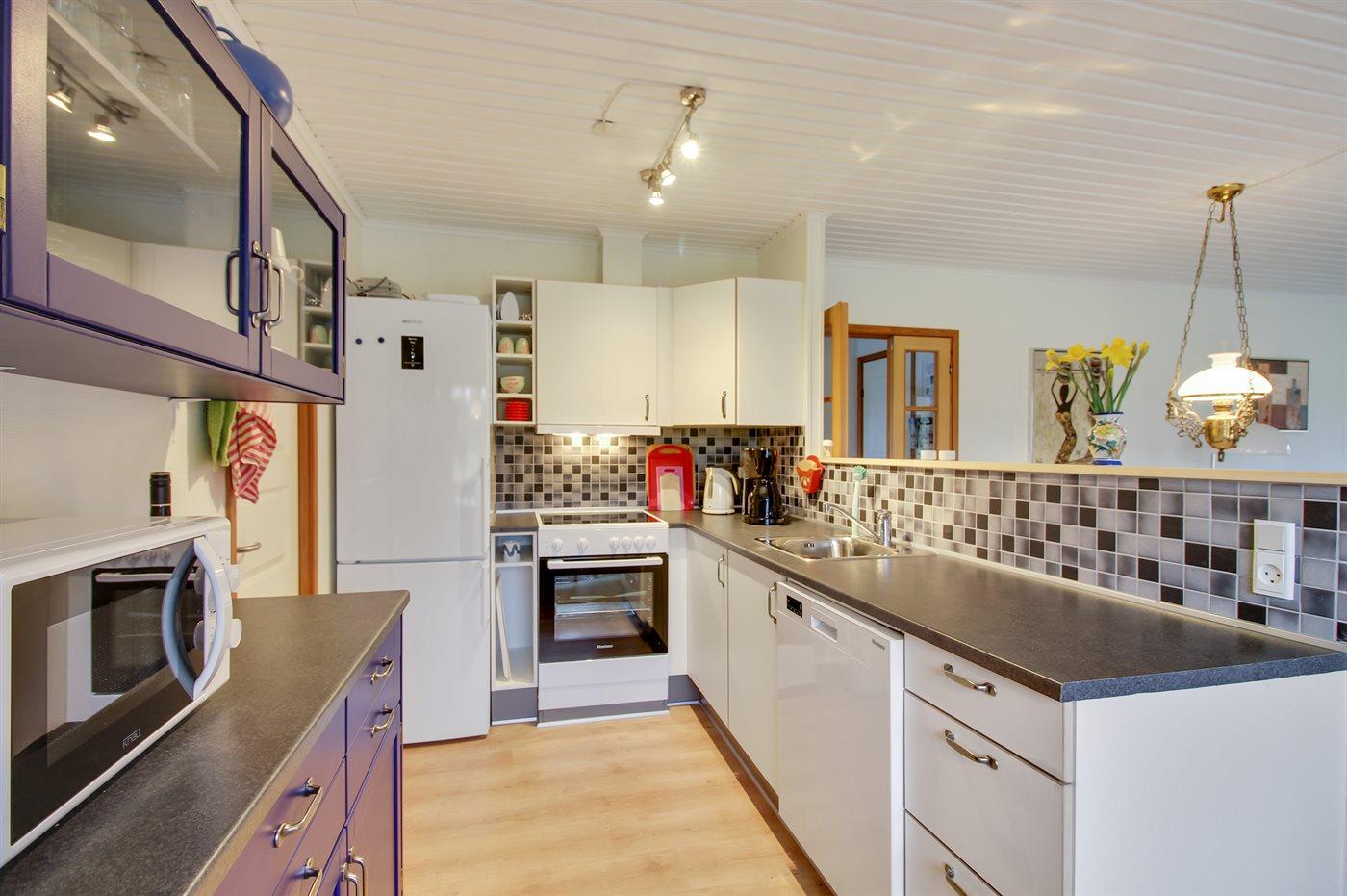 Køkkenet er udstyret med 1 køleskab. Der er 4 keramiske kogeplader, varmluftovn, mikrobølgeovn samt opvaskemaskine.