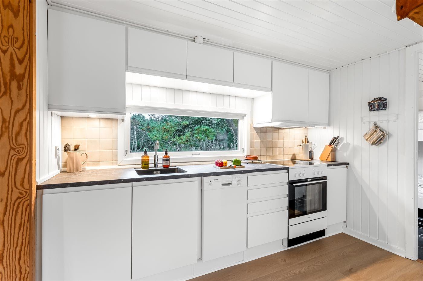 Køkkenet er udstyret med 1 køleskab. Der er 4 elkogeplader, bageovn samt opvaskemaskine.
