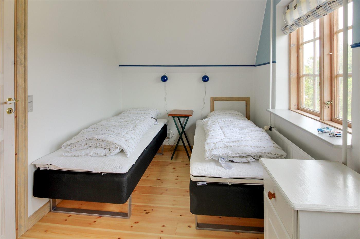 Der er i alt 3 soveværelser. Sovepladserne fordeler sig på: 2 sovepladser i dobbeltseng. 4 sovepladser i enkeltsenge. Derudover er der 1 stk. barneseng.