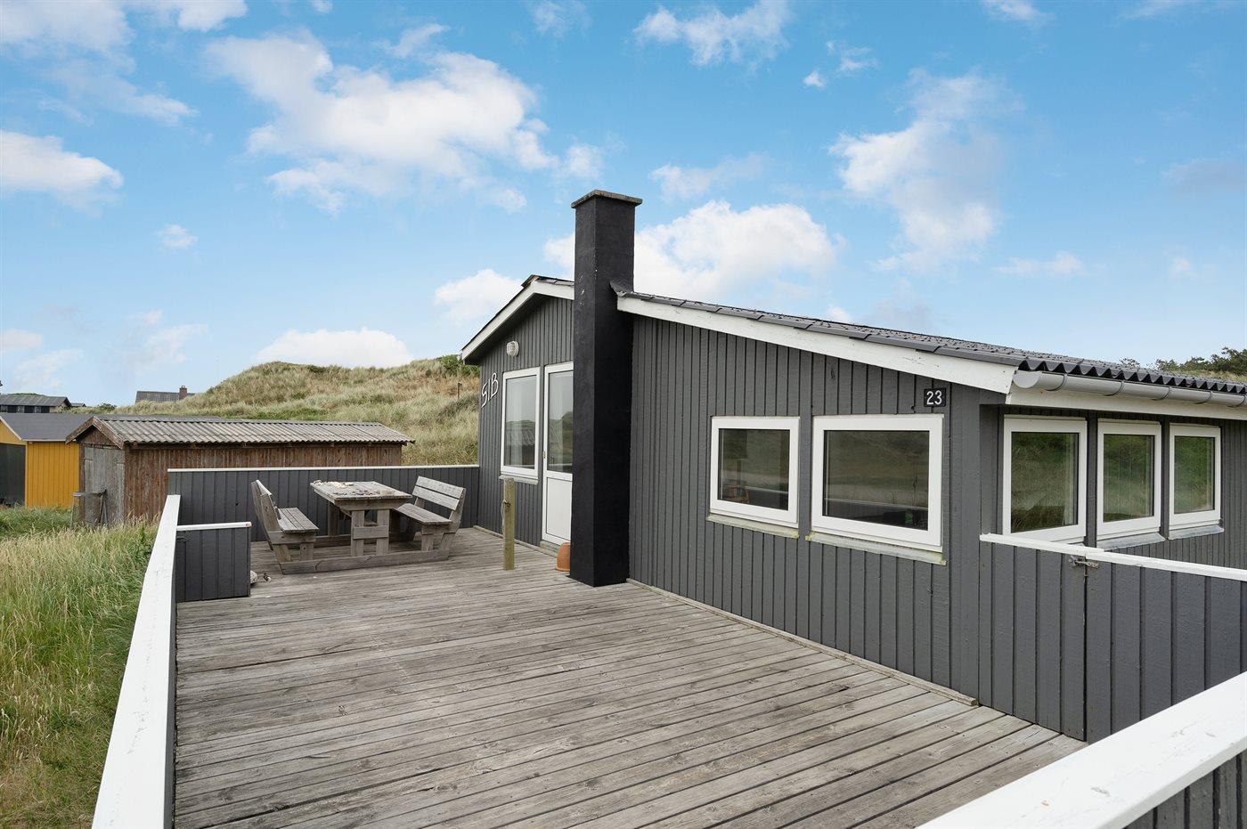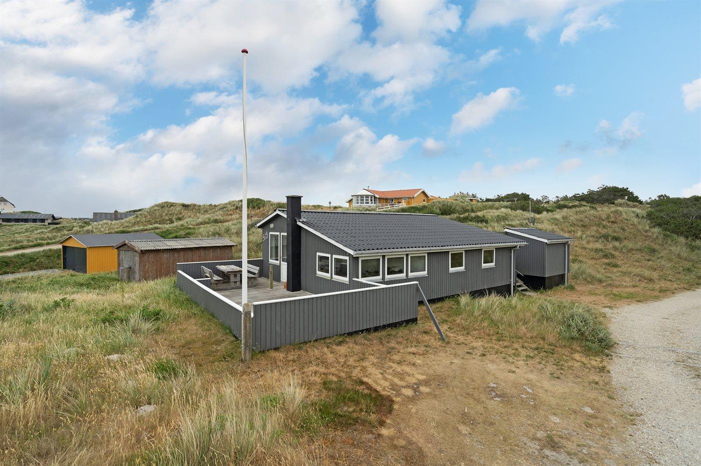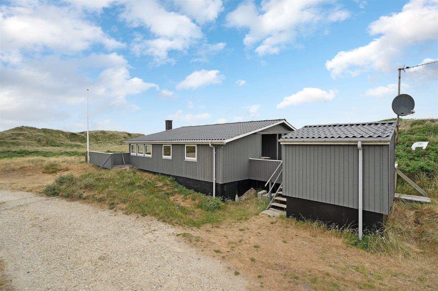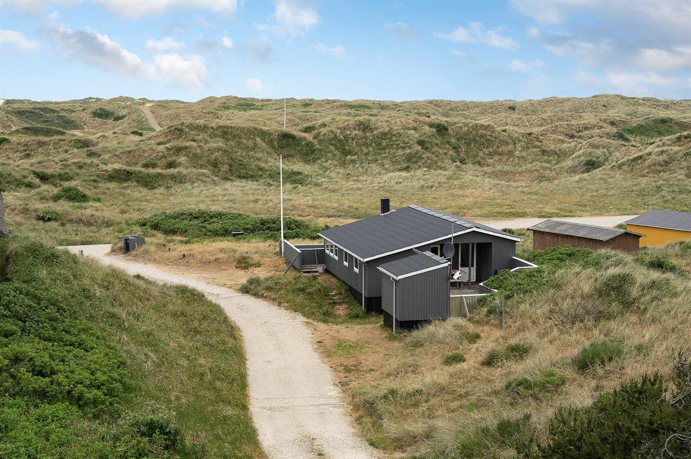 Enkelt og hyggeligt feriehus i klitterne ikke langt fra stranden. Fra stuen og den ene af terrasserne har man en dejlig udsigt over klitterne, bag hvilke stranden ligger. 2 soveværelser med dobbeltseng samt 1 gennemgangsrum med køjeseng. Til huset hører 2 lukkede terrasser.