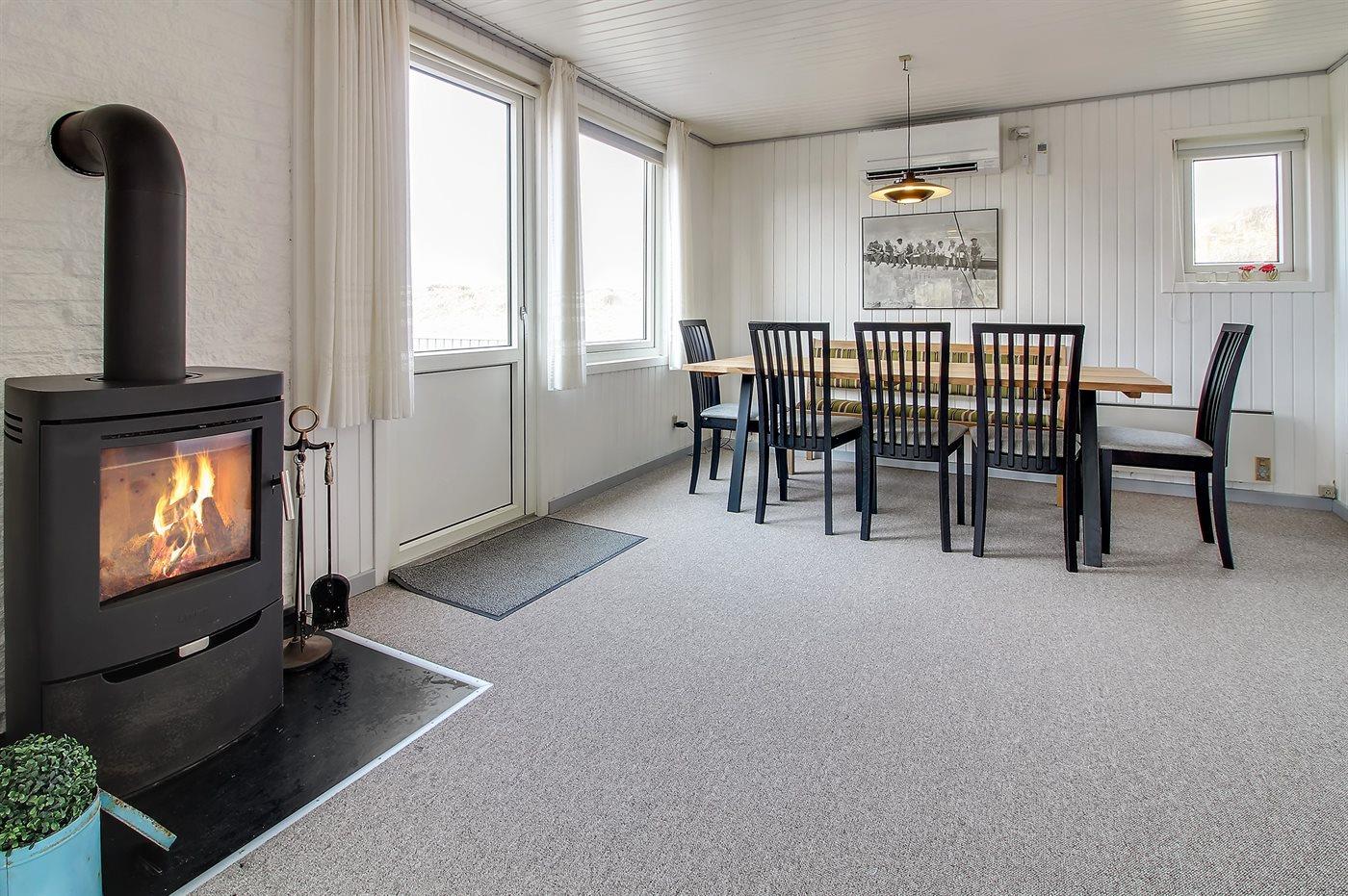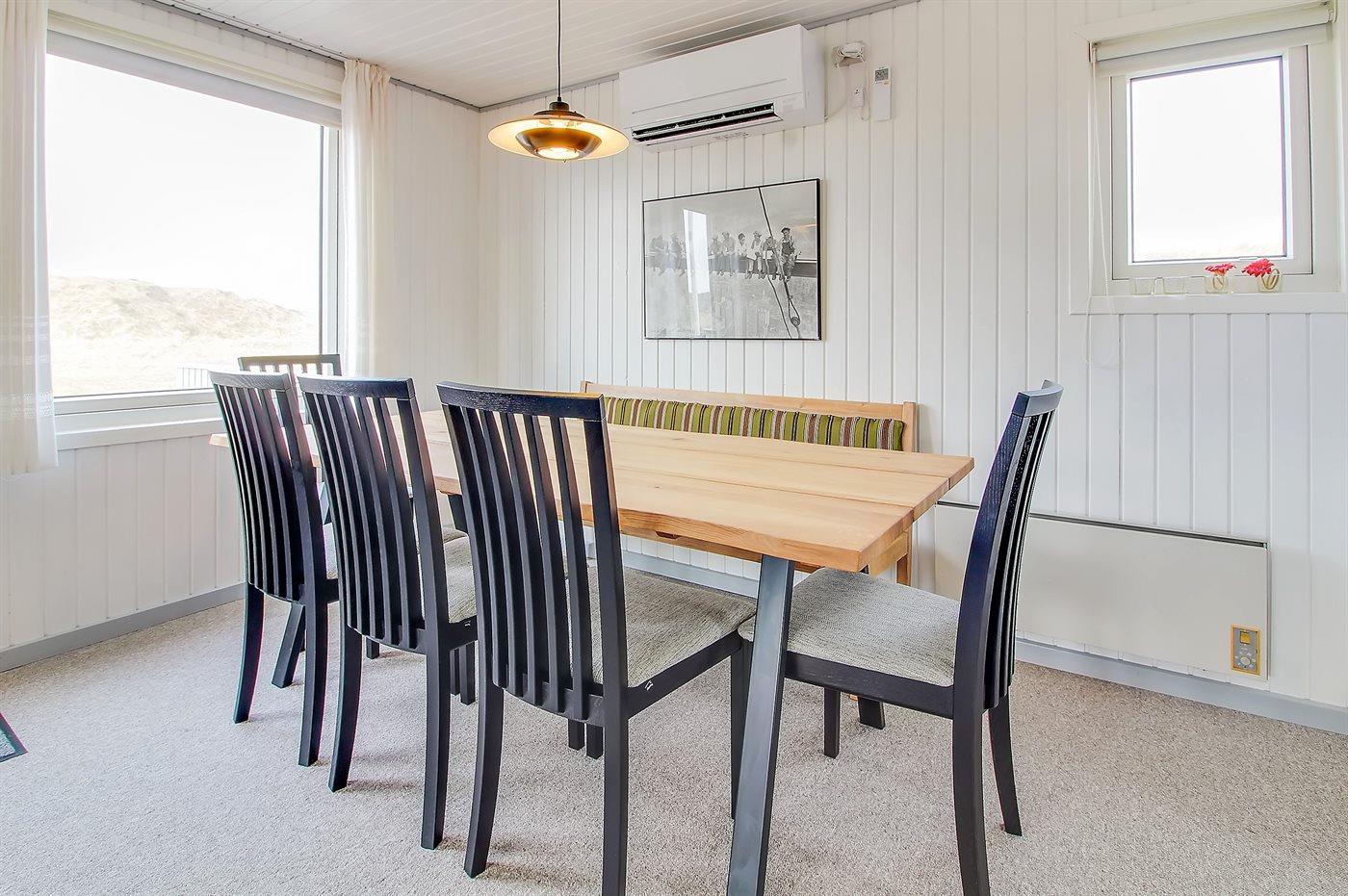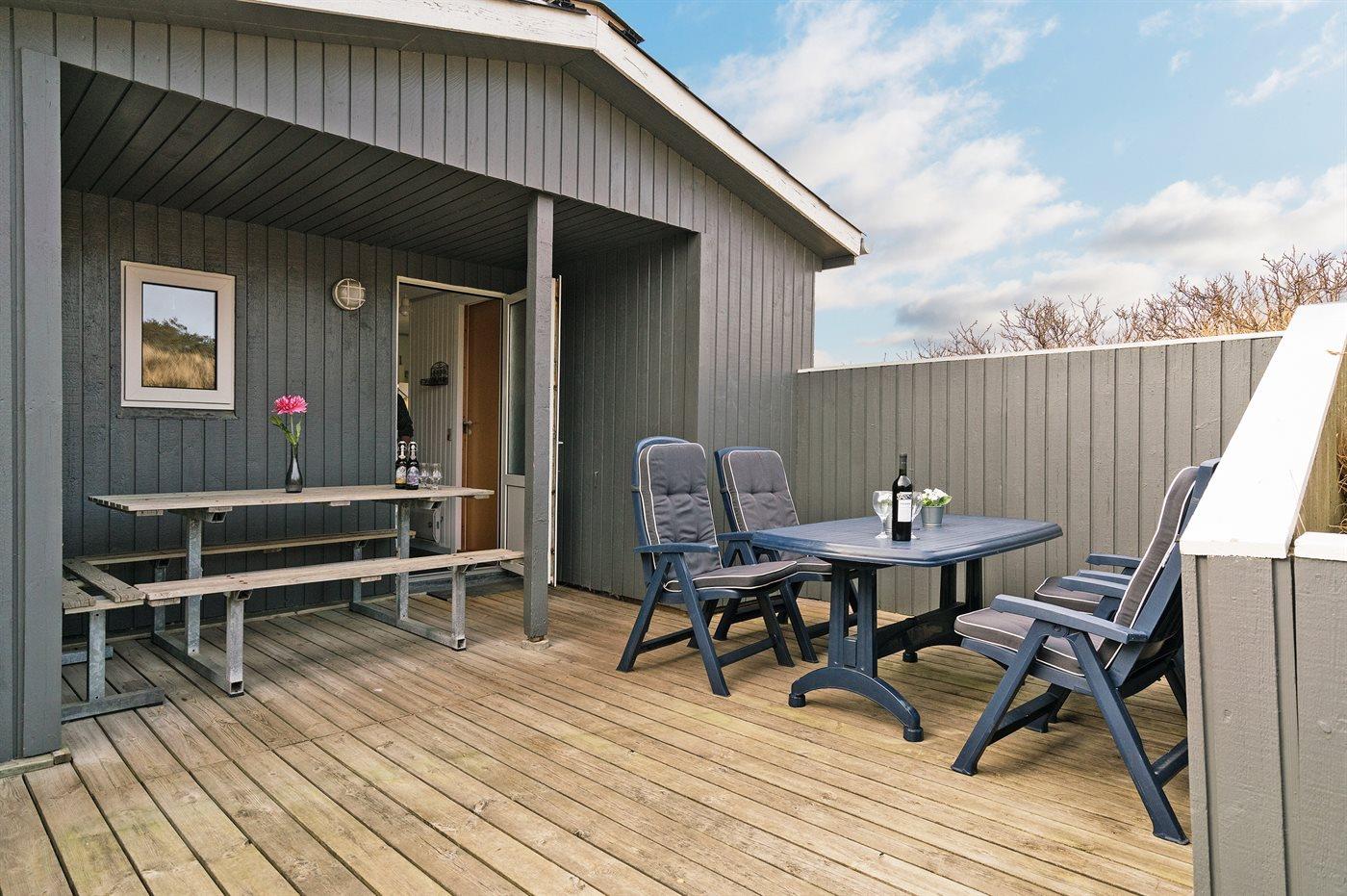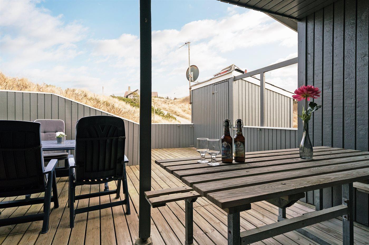 Enkelt og hyggeligt feriehus i klitterne ikke langt fra stranden. Fra stuen og den ene af terrasserne har man en dejlig udsigt over klitterne, bag hvilke stranden ligger. 2 soveværelser med dobbeltseng samt 1 gennemgangsrum med køjeseng. Til huset hører 2 lukkede terrasser.