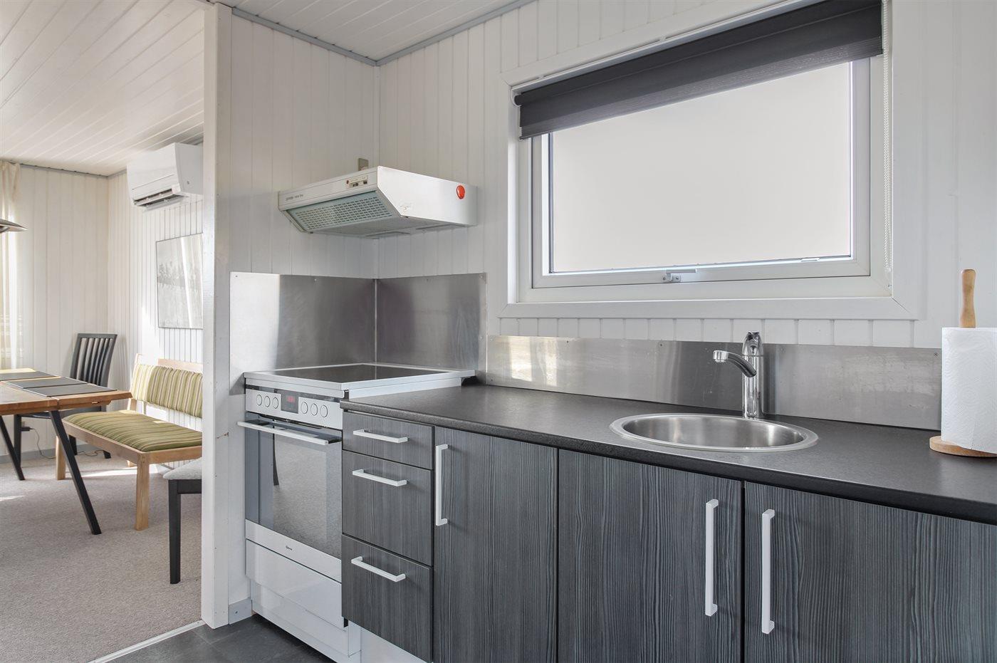 Køkkenet er udstyret med 1 køleskab. Der er 4 keramiske kogeplader, varmluftovn.