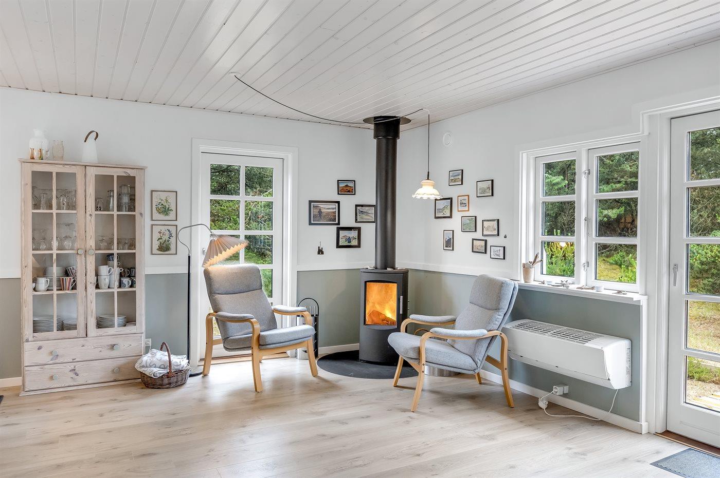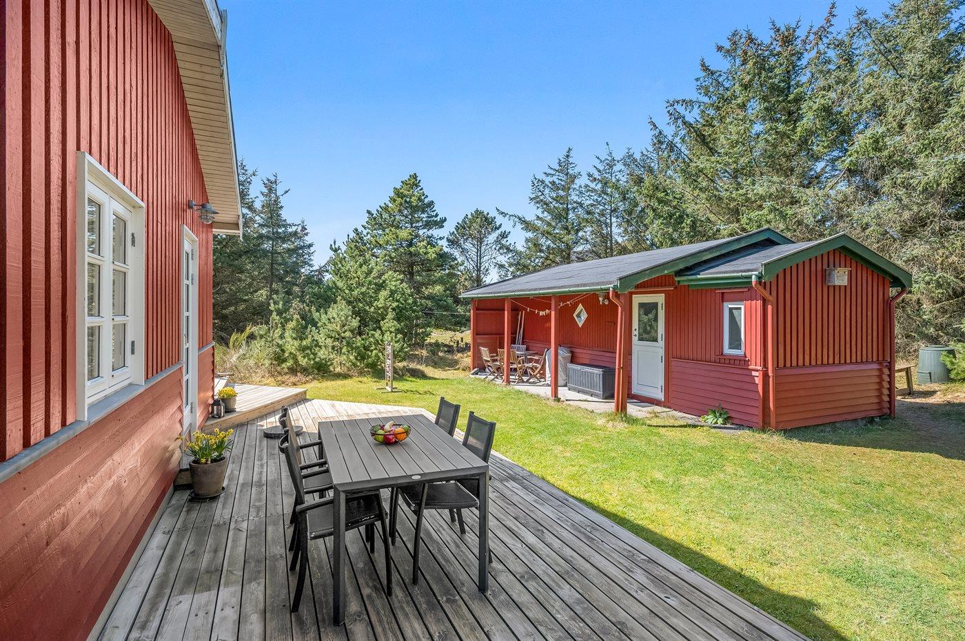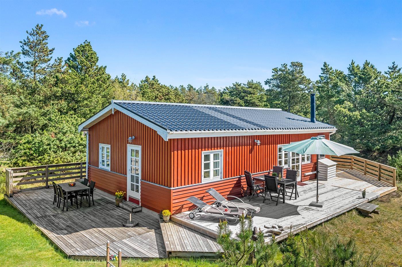 Hyggeligt sommerhus med moderne køkken, brændeovn og stor terrasse i rolige omgivelser nær Vejers Strand.