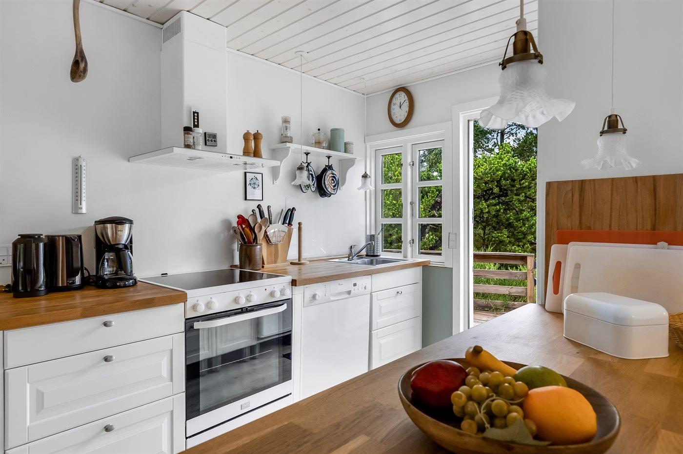 Køkkenet er udstyret med 1 køleskab. Der er 4 keramiske kogeplader, bageovn, varmluftovn samt opvaskemaskine.