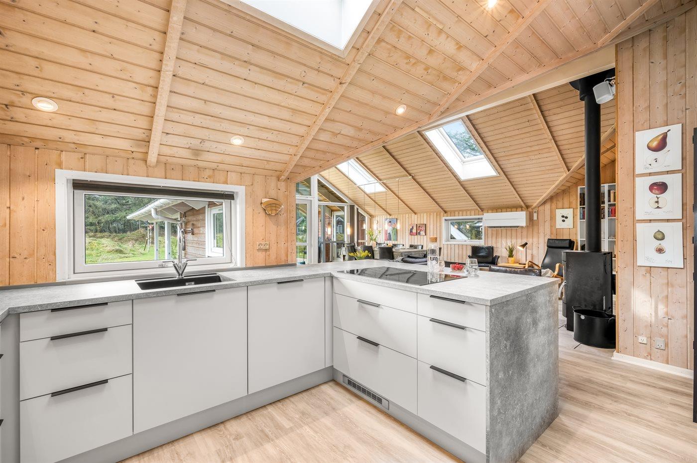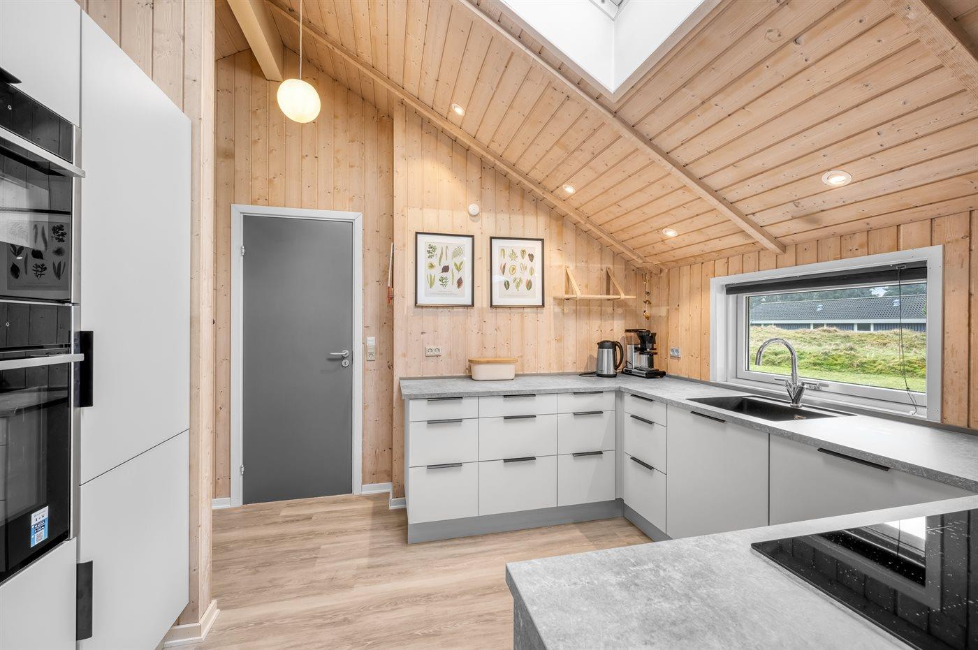 Køkkenet er udstyret med 1 køleskab. Der er 4 keramiske kogeplader, varmluftovn, mikrobølgeovn samt opvaskemaskine.
