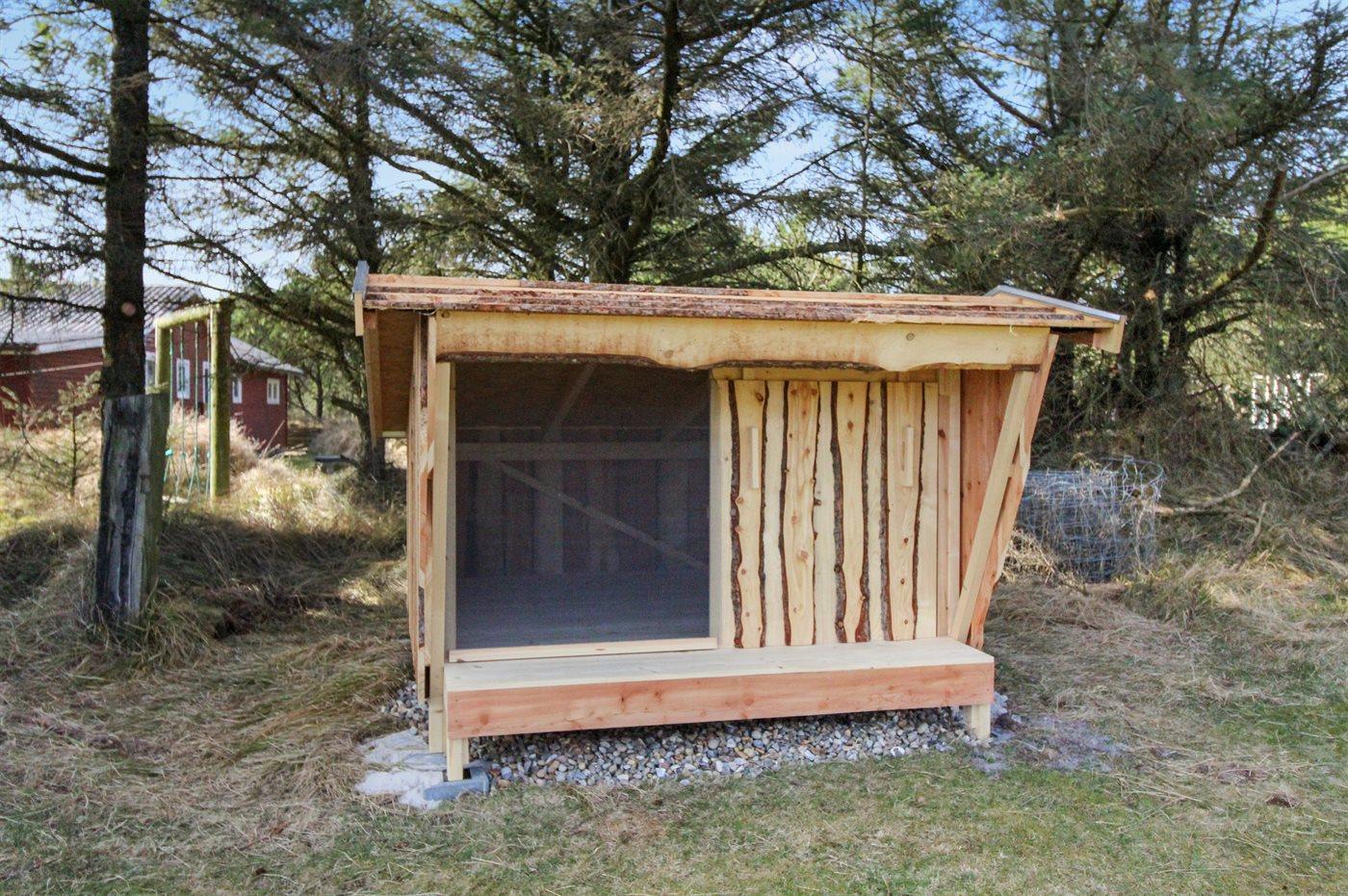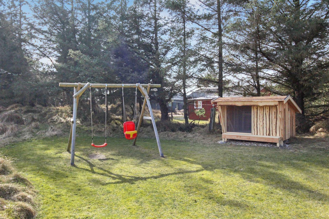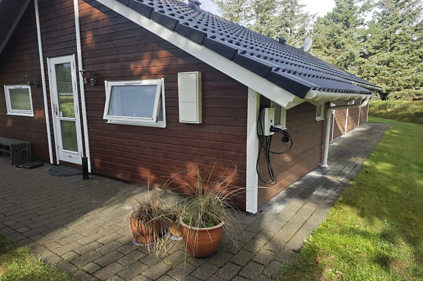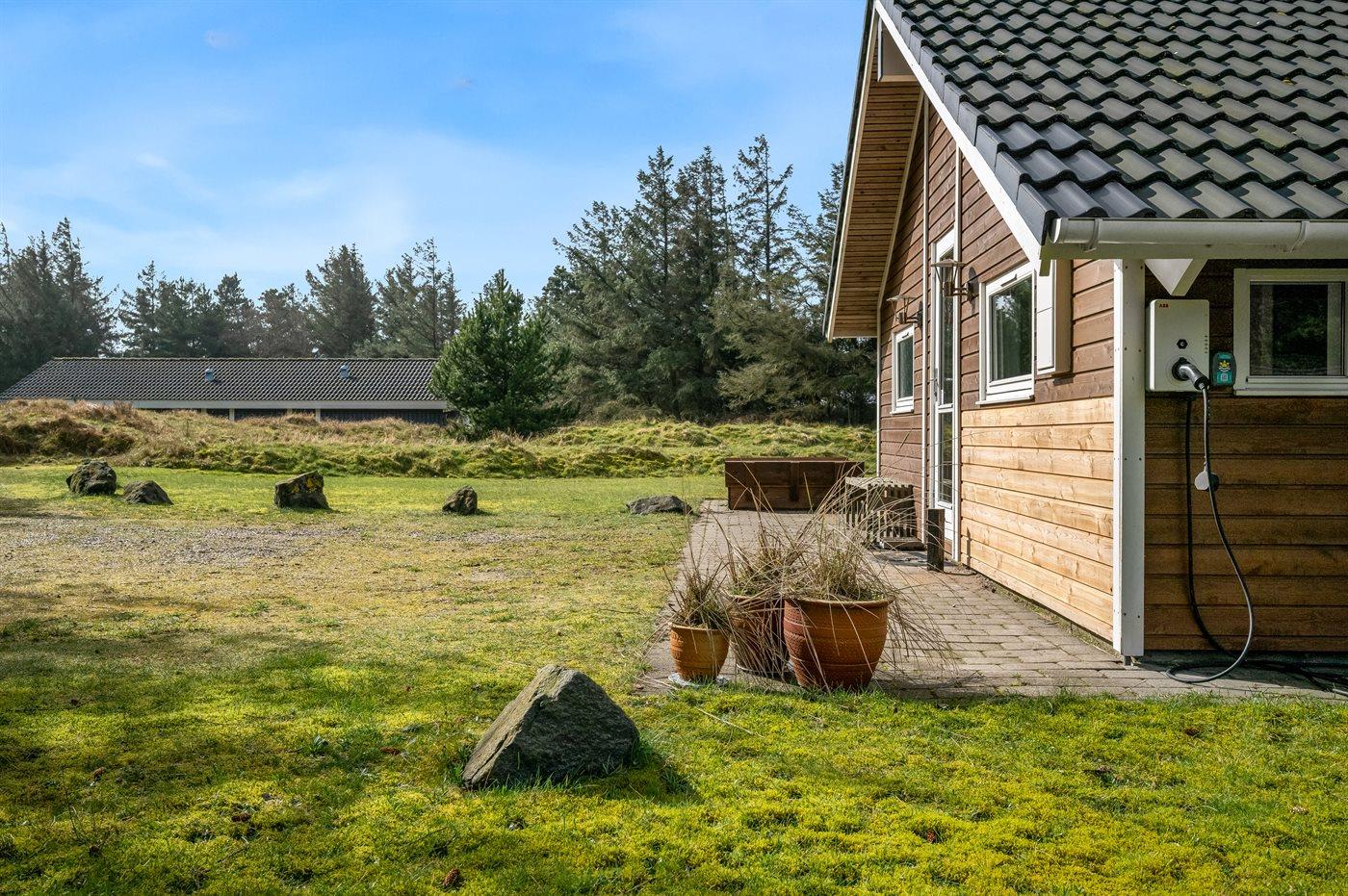 Ferieboligen er beliggende på en 1800 m² stor naturgrund. Der er 1000 m til havet. Nærmeste forretning er beliggende i en afstand af 300 m. Til ferieboligen hører 48 m² terrasseareal. Desuden er der 30 m² overdækket terrasse. Der er redskabsrum. Gynge. Sandkasse. Udendørs bruser med varmt og koldt vand. Der er installeret stik til opladning af elbil. Type 2 stik. Parkering ved ferieboligen.