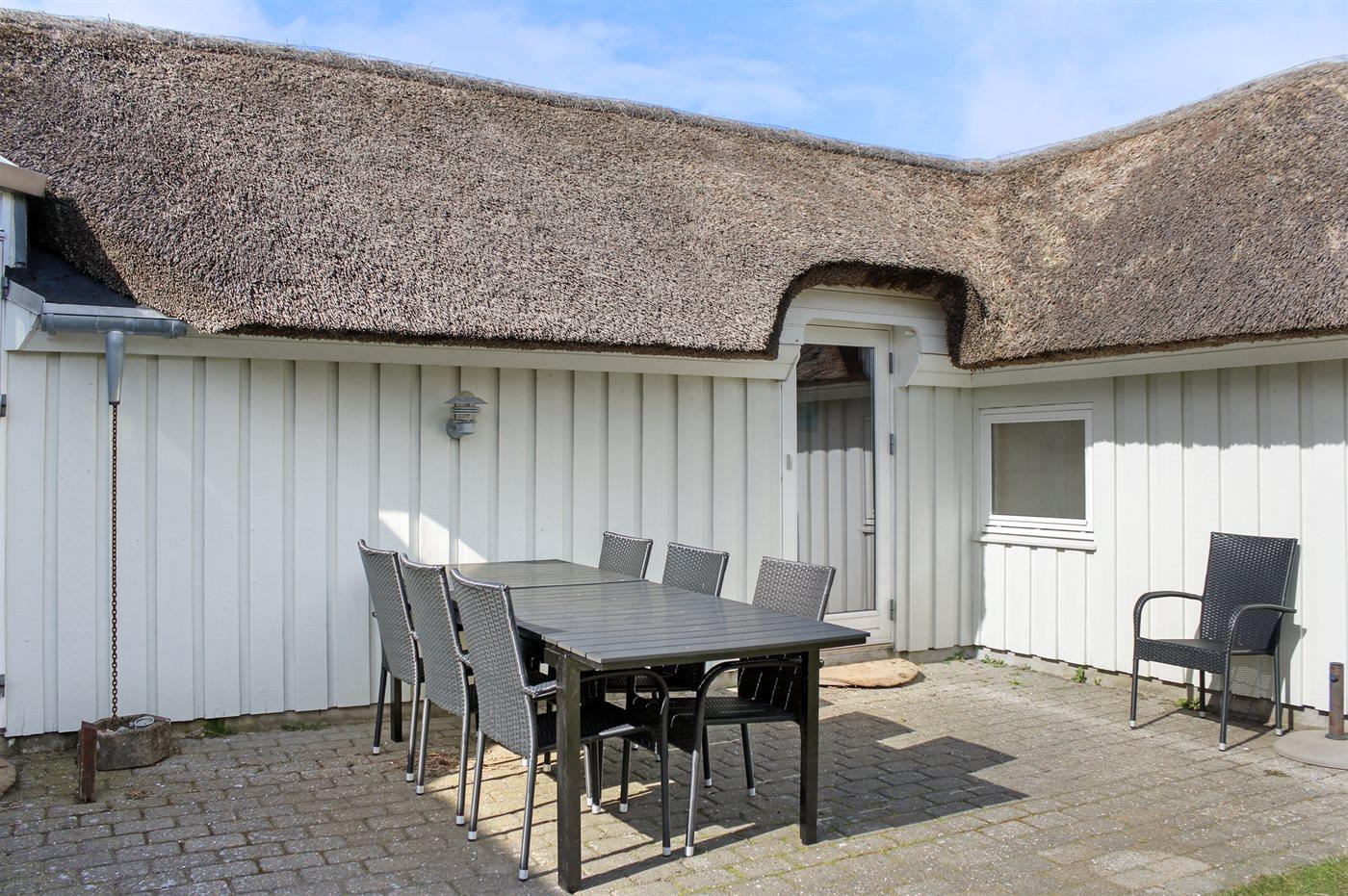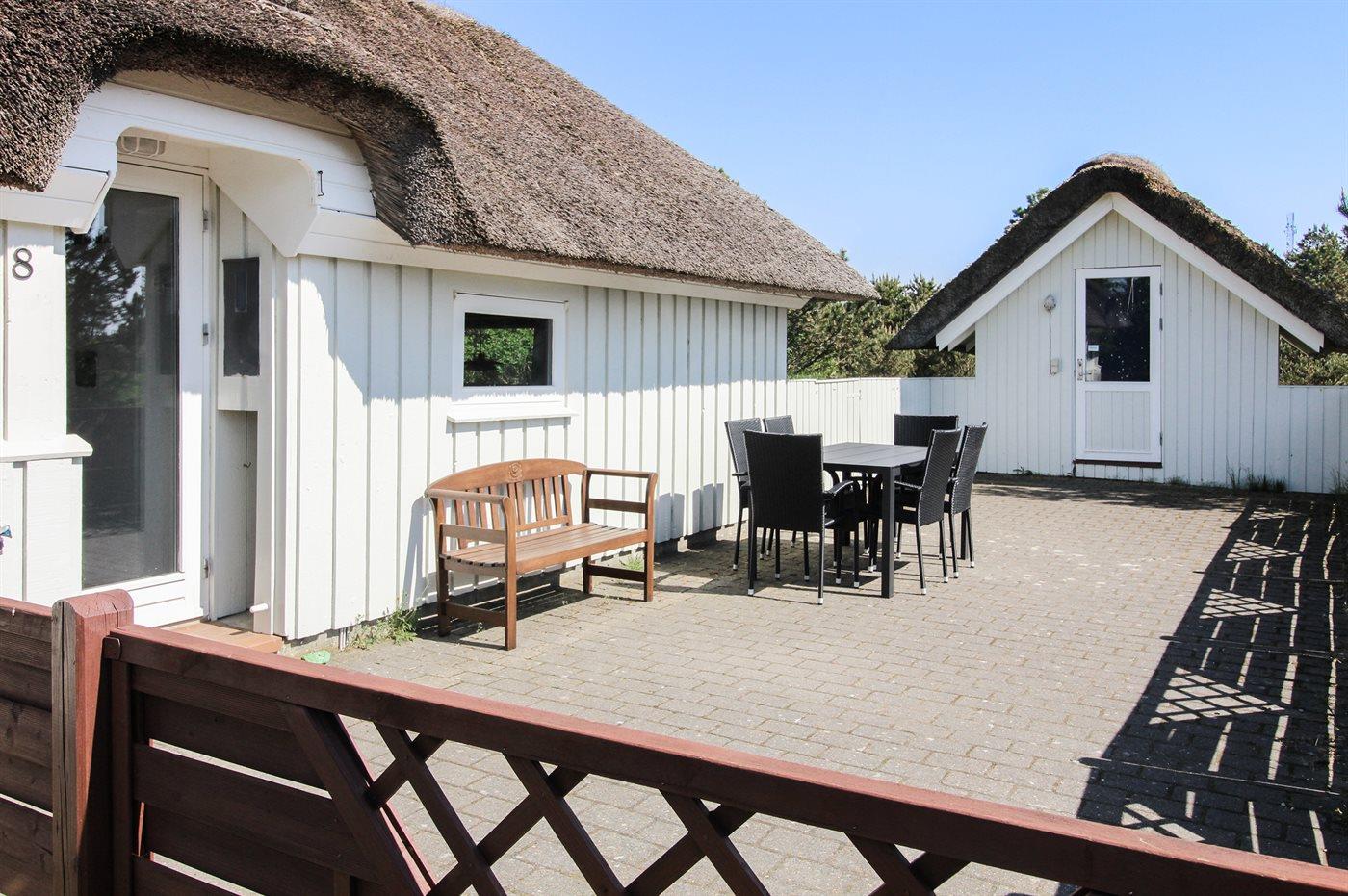Dejligt sommerhus i Vejers Strand med stråtag, stor naturgrund og indendørs spa til afslapning.