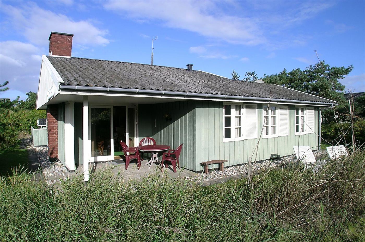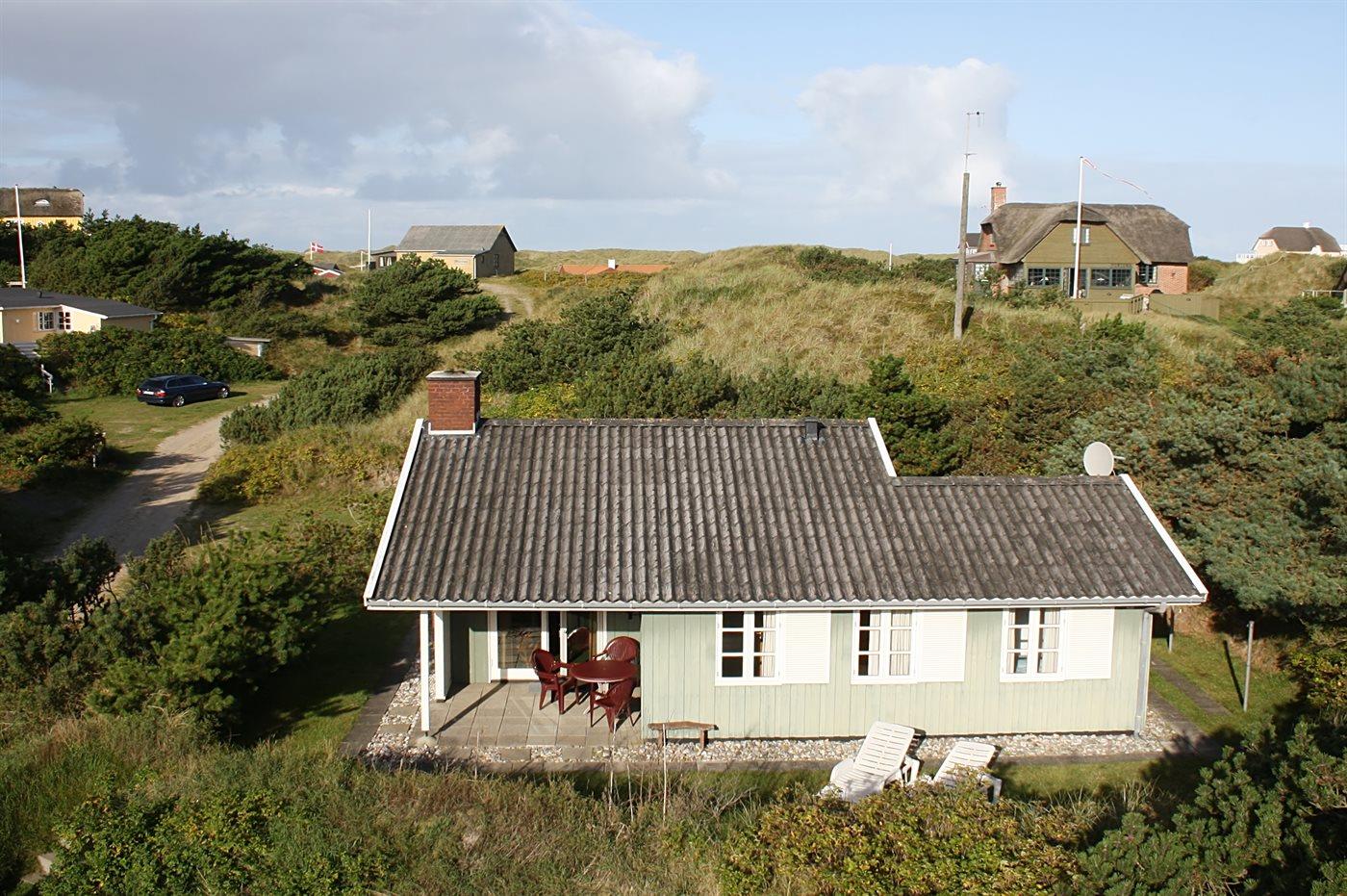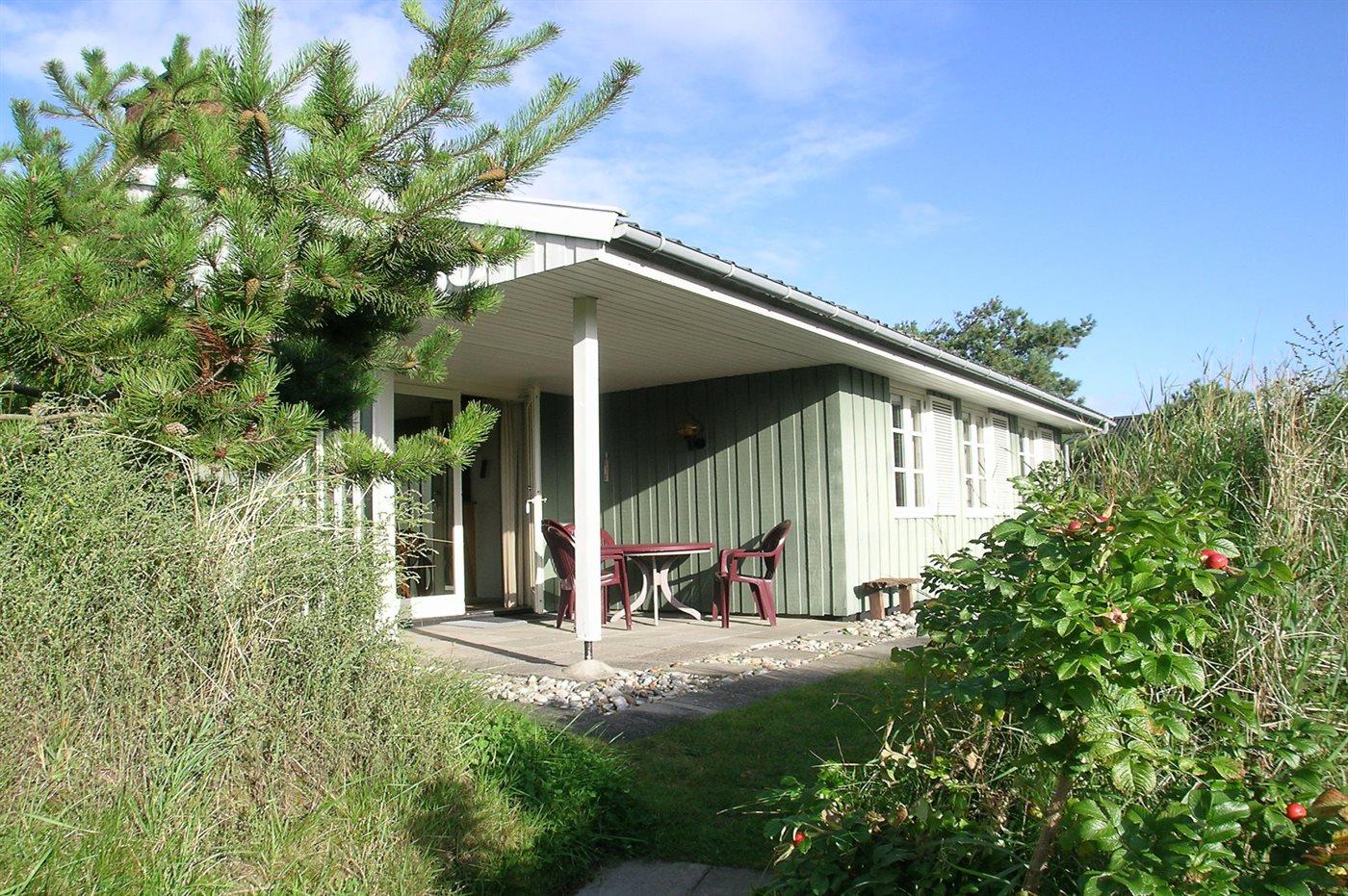 Fritidshus belligende tæt på strand og indkøb. Ligger i læ ved stor klit. Store møblerede terrasser, heraf en overdækket. Gratis internetadgang.