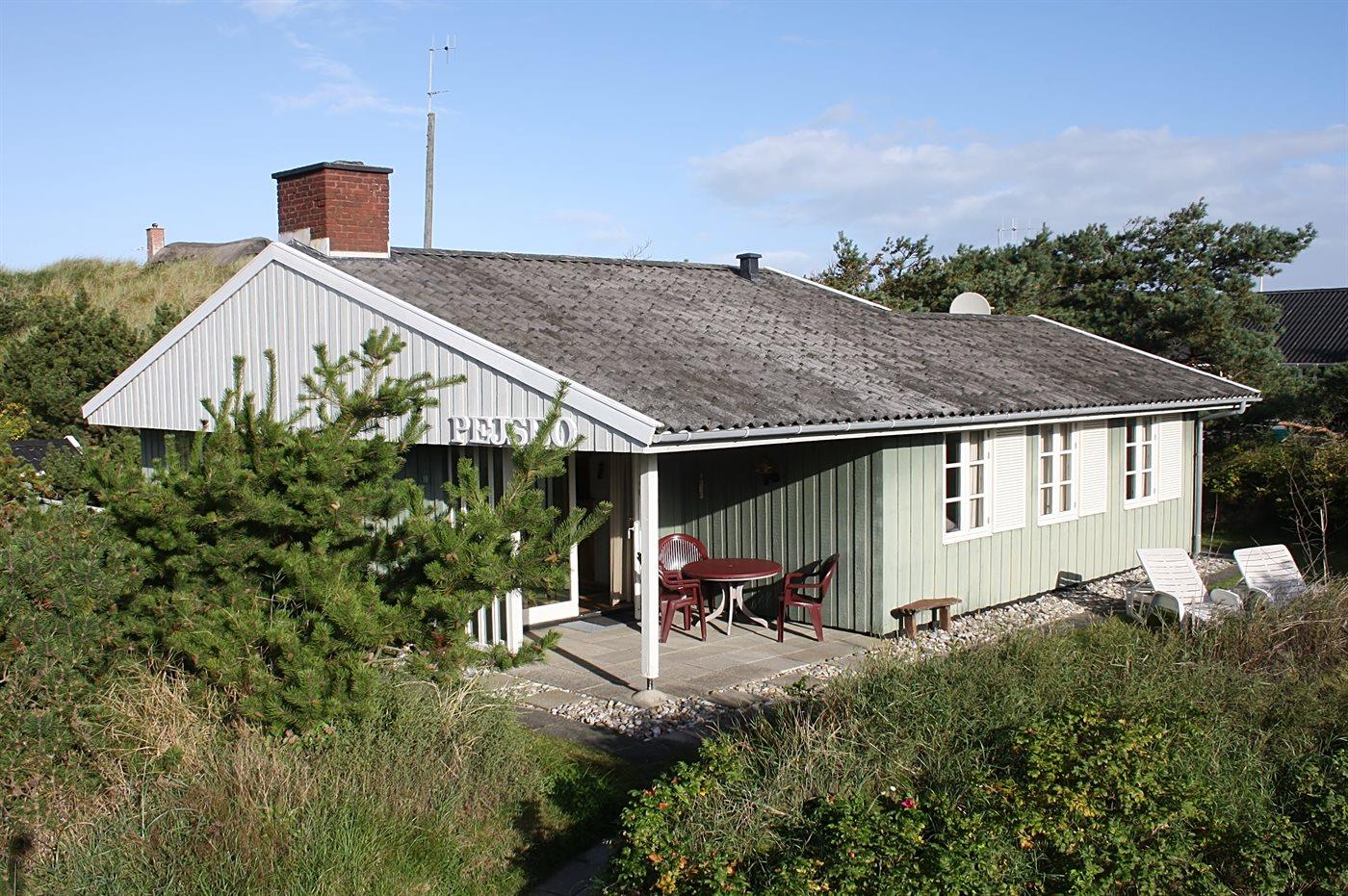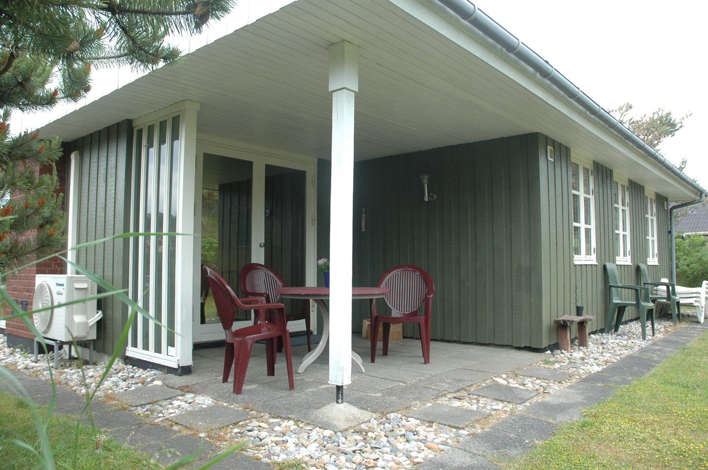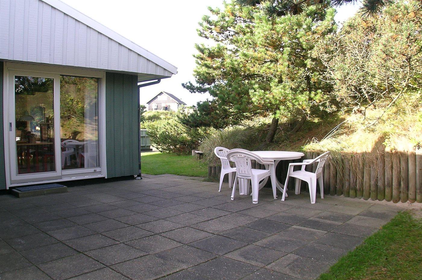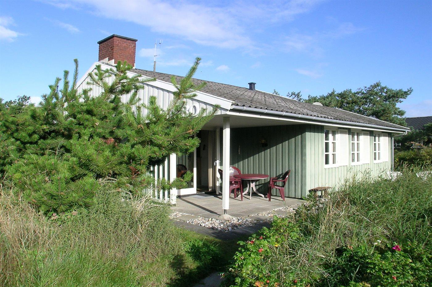 Fritidshus belligende tæt på strand og indkøb. Ligger i læ ved stor klit. Store møblerede terrasser, heraf en overdækket. Gratis internetadgang.