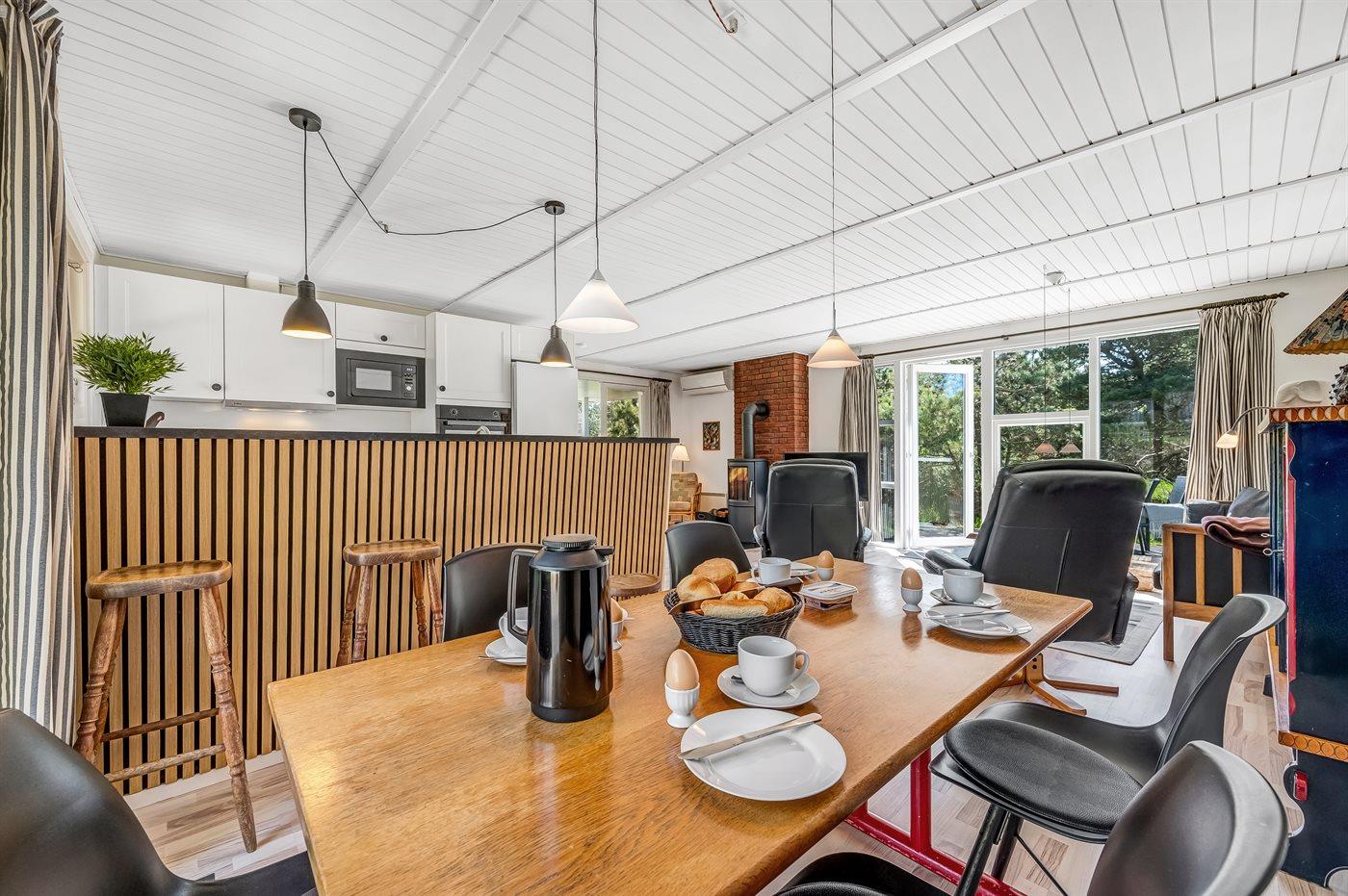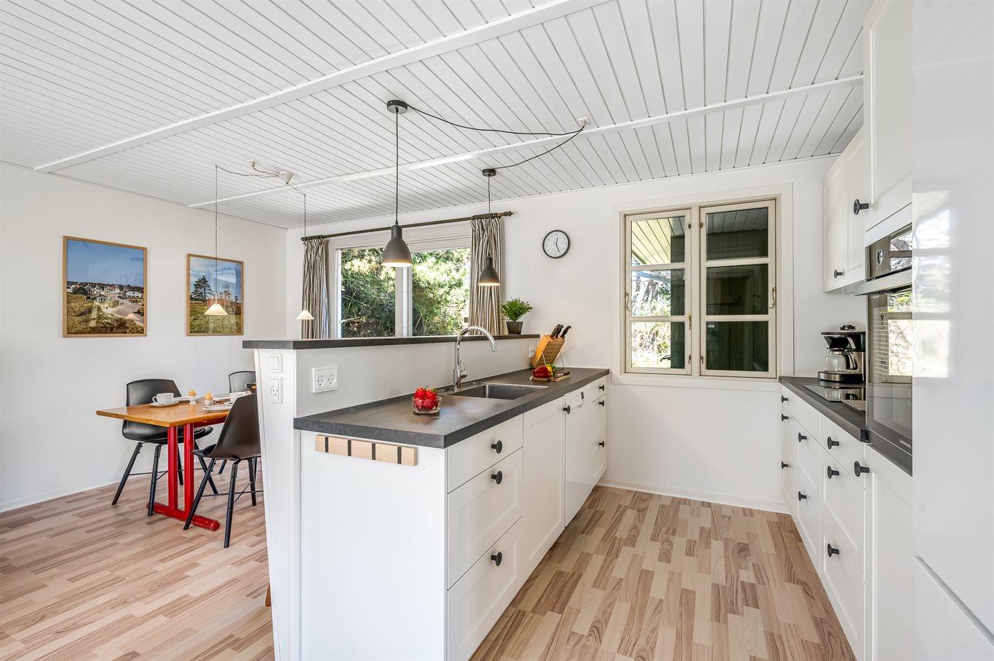 Køkkenet er udstyret med 1 køleskab. Der er 4 keramiske kogeplader, varmluftovn, mikrobølgeovn samt opvaskemaskine.