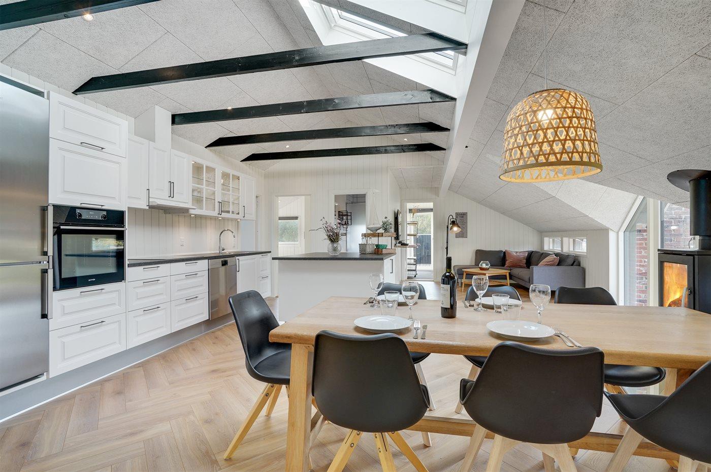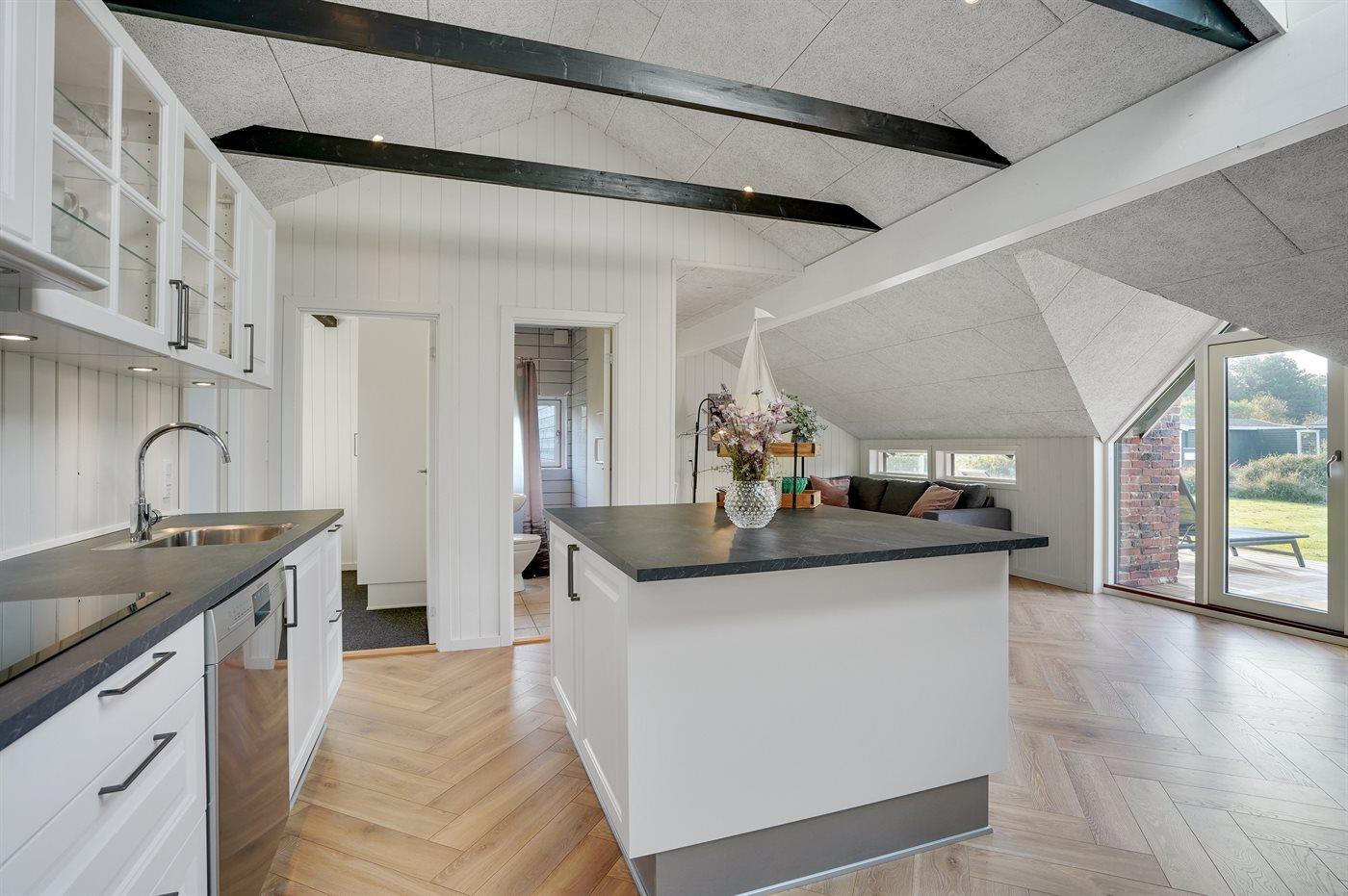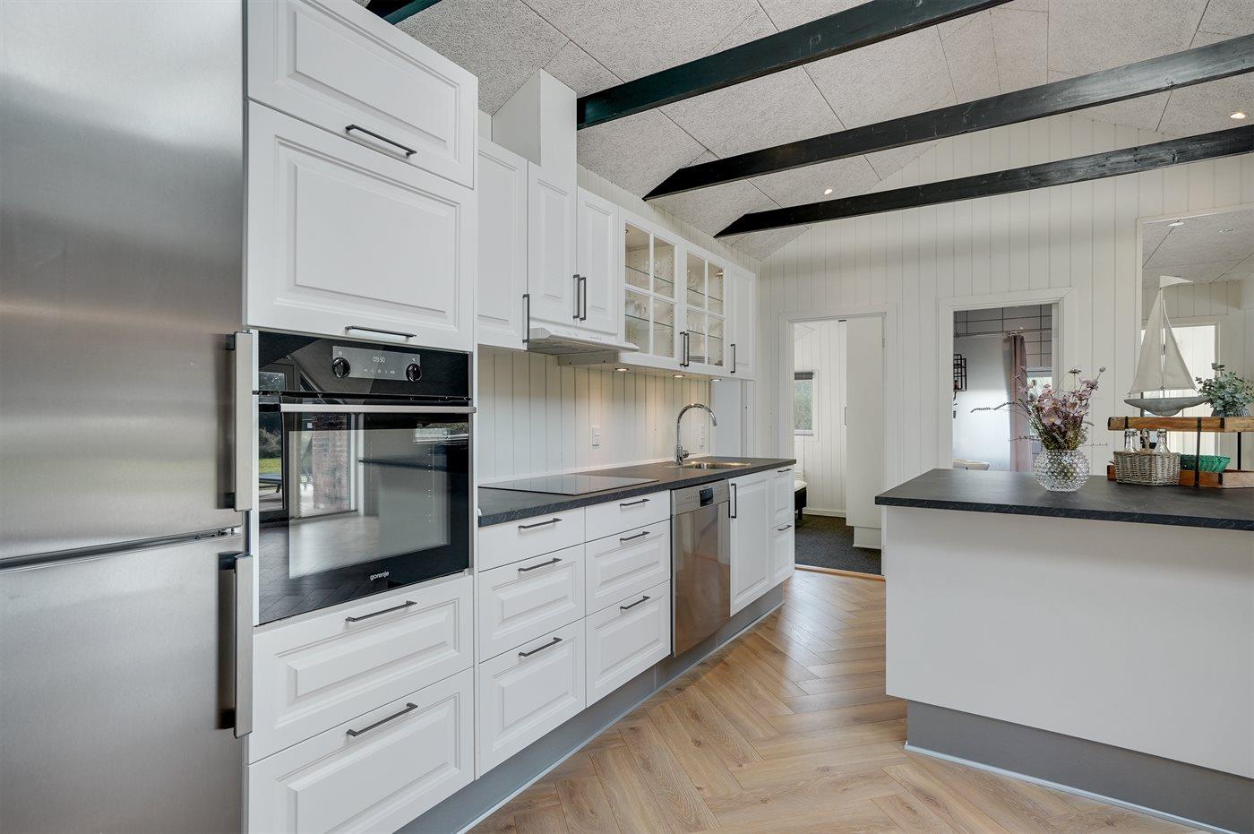 Køkkenet er udstyret med 1 køleskab. Der er 4 keramiske kogeplader, bageovn, varmluftovn, mikrobølgeovn samt opvaskemaskine.