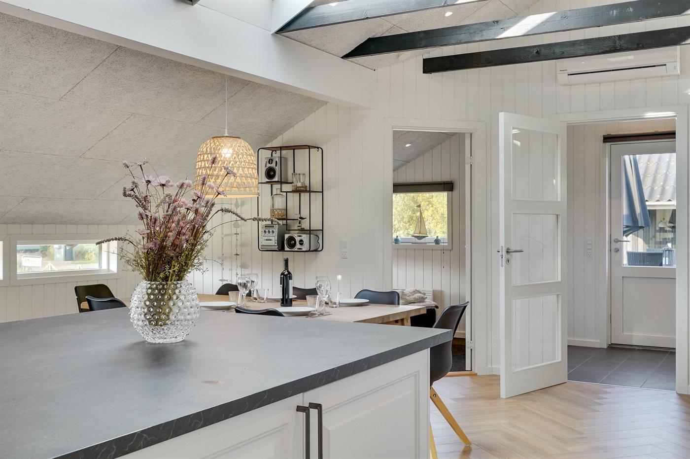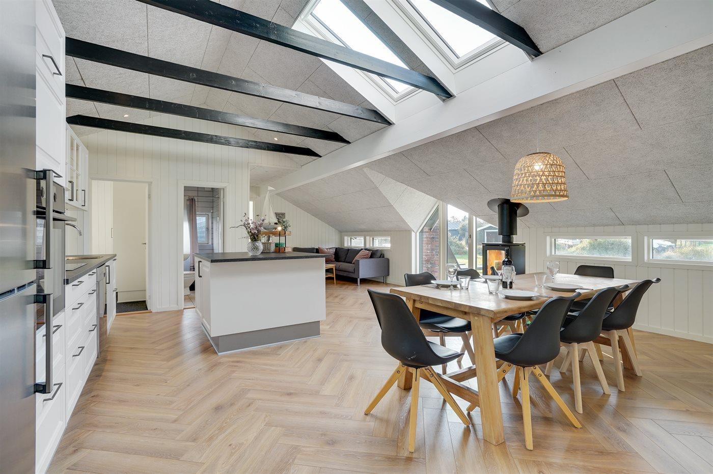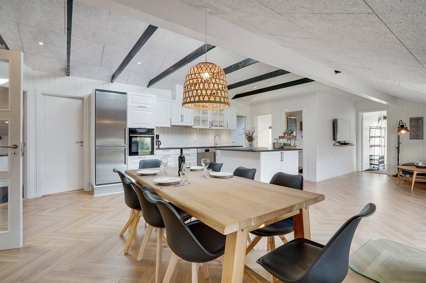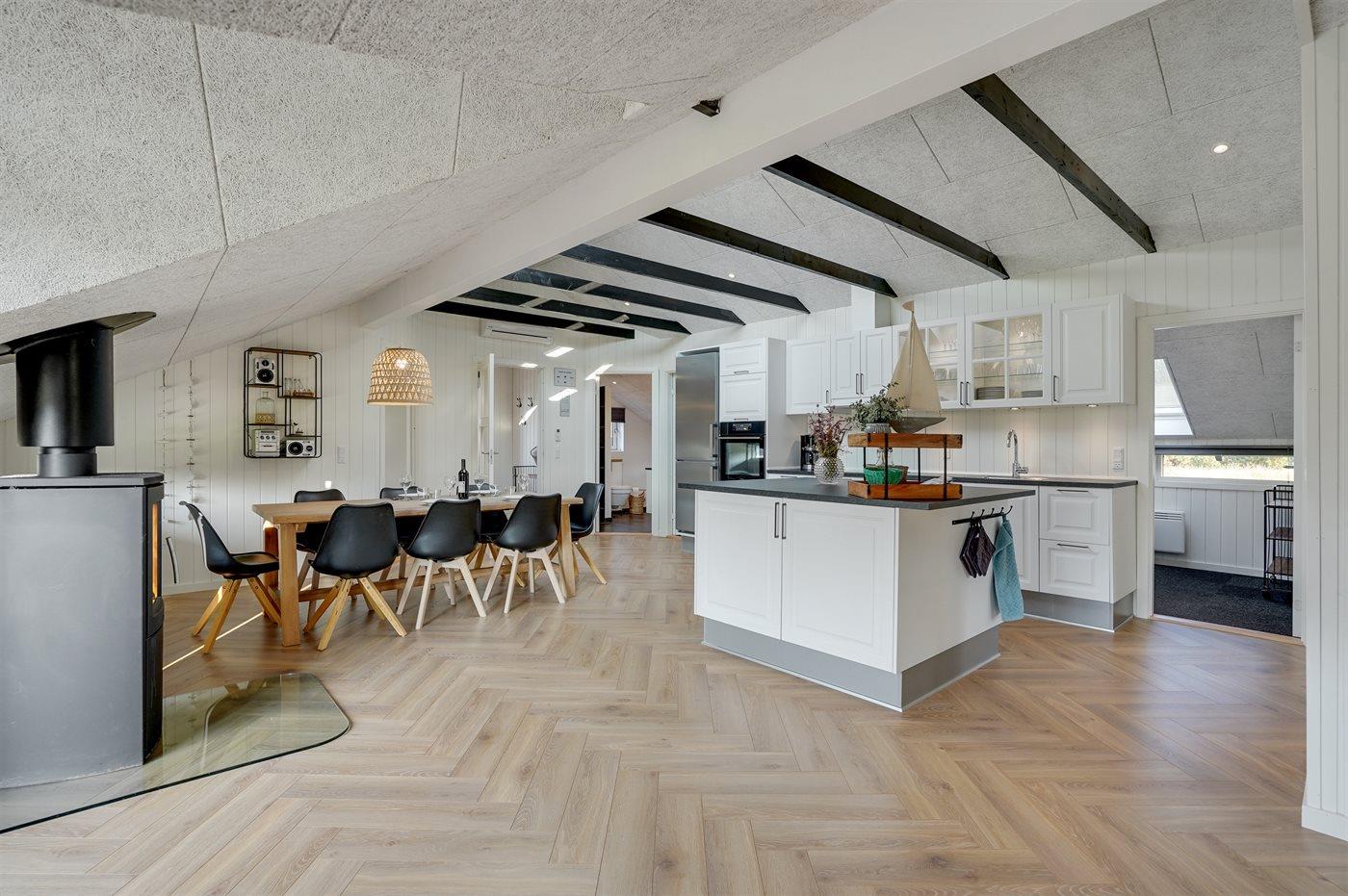 Køkkenet er udstyret med 1 køleskab. Der er 4 keramiske kogeplader, bageovn, varmluftovn, mikrobølgeovn samt opvaskemaskine.
