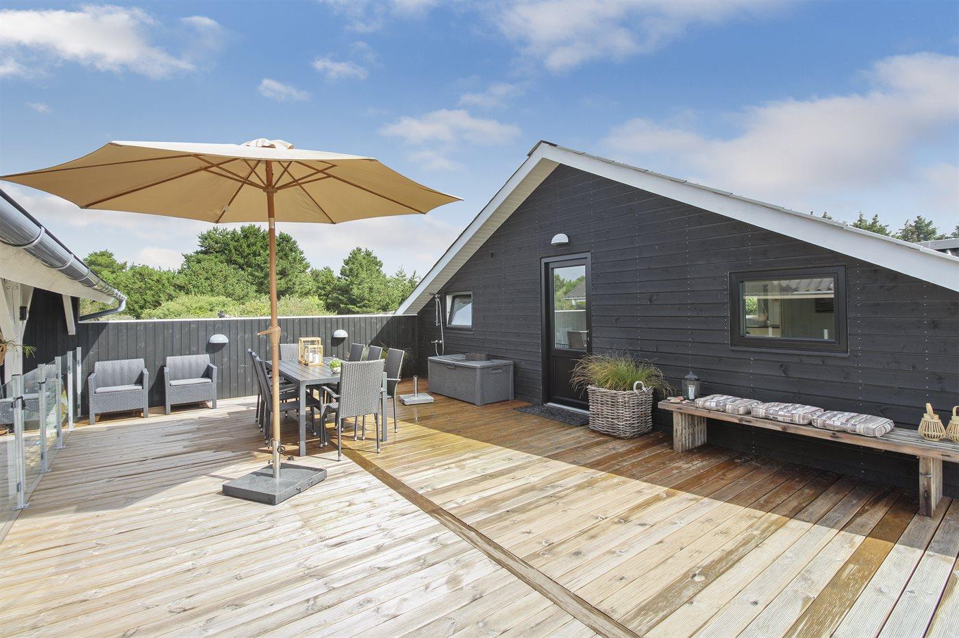 Ferieboligen er beliggende på en 2300 m² stor naturgrund. Der er 1000 m til havet. Nærmeste forretning er beliggende i en afstand af 500 m. Til ferieboligen hører 100 m² terrasseareal. Udendørs bruser. Der er 2 grill til rådighed. (1 til kul + 1 til gas). Der er carport til rådighed. Parkering ved ferieboligen.