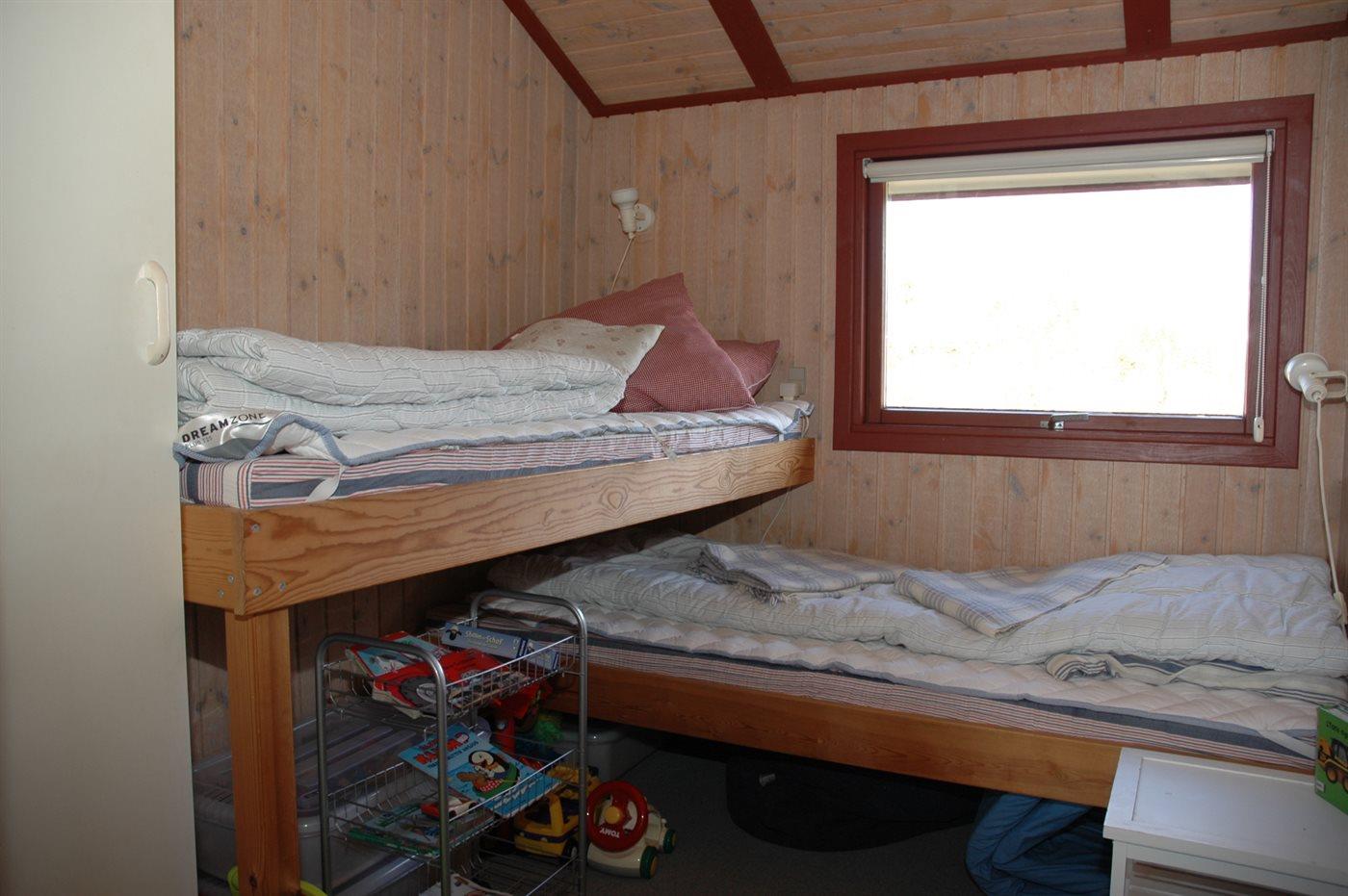 Der er i alt 3 soveværelser. Sovepladserne fordeler sig på: 4 sovepladser i dobbeltsenge. 1 soveplads i enkeltseng.1 soveplads i køjeseng. Derudover er der 1 stk. barneseng.