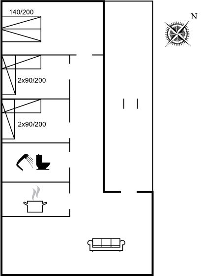 Der er i alt 3 soveværelser. Sovepladserne fordeler sig på: 2 sovepladser i dobbeltseng. 2 sovepladser i enkeltsenge. 2 sovepladser i køjeseng.