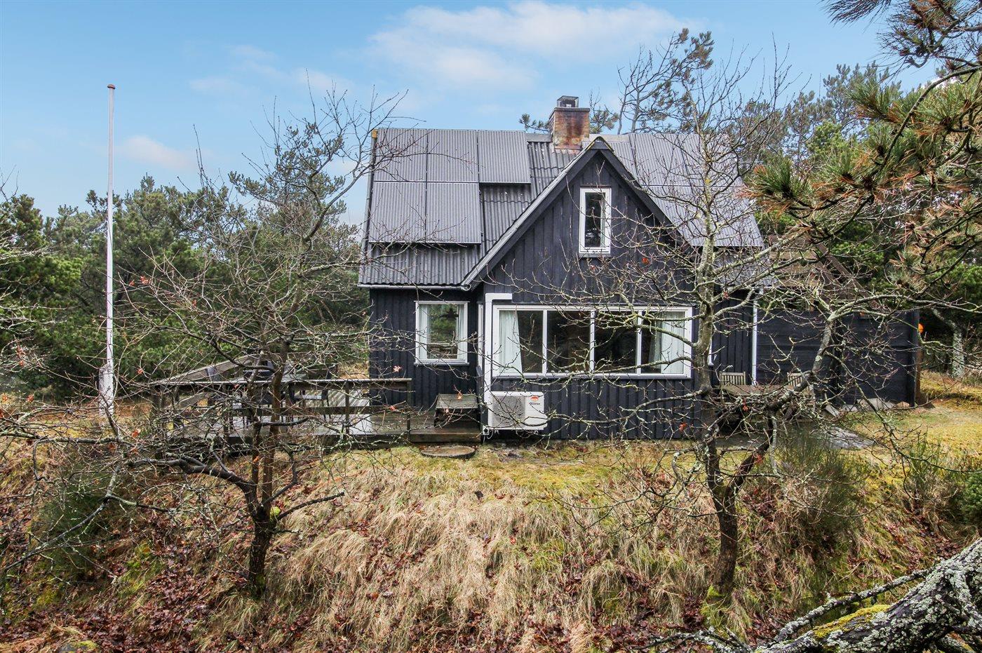 Hyggeligt sommerhus i skoven ved Vejers Strand med terrasse, brændeovn og tæt på havet.