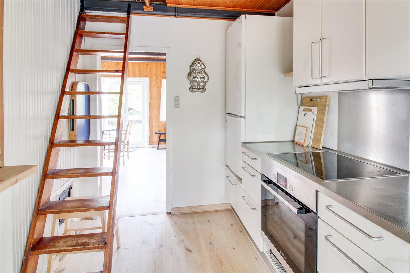 Køkkenet er udstyret med 1 køleskab. Der er 4 keramiske kogeplader, varmluftovn, mikrobølgeovn samt opvaskemaskine.