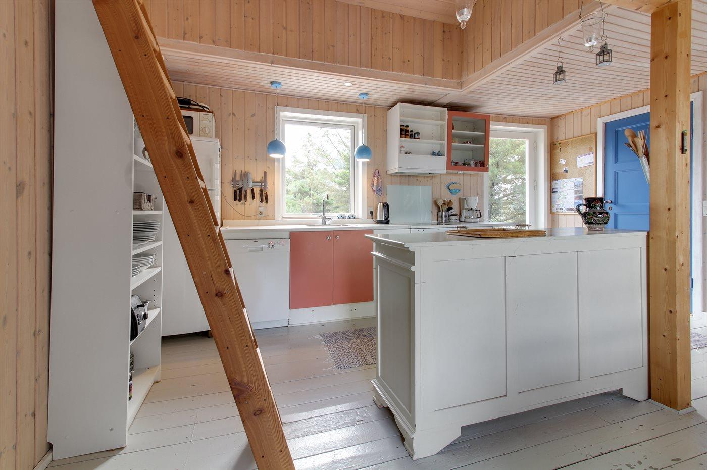 Køkkenet er udstyret med 1 køleskab. Der er 4 elkogeplader, bageovn, mikrobølgeovn samt opvaskemaskine.
