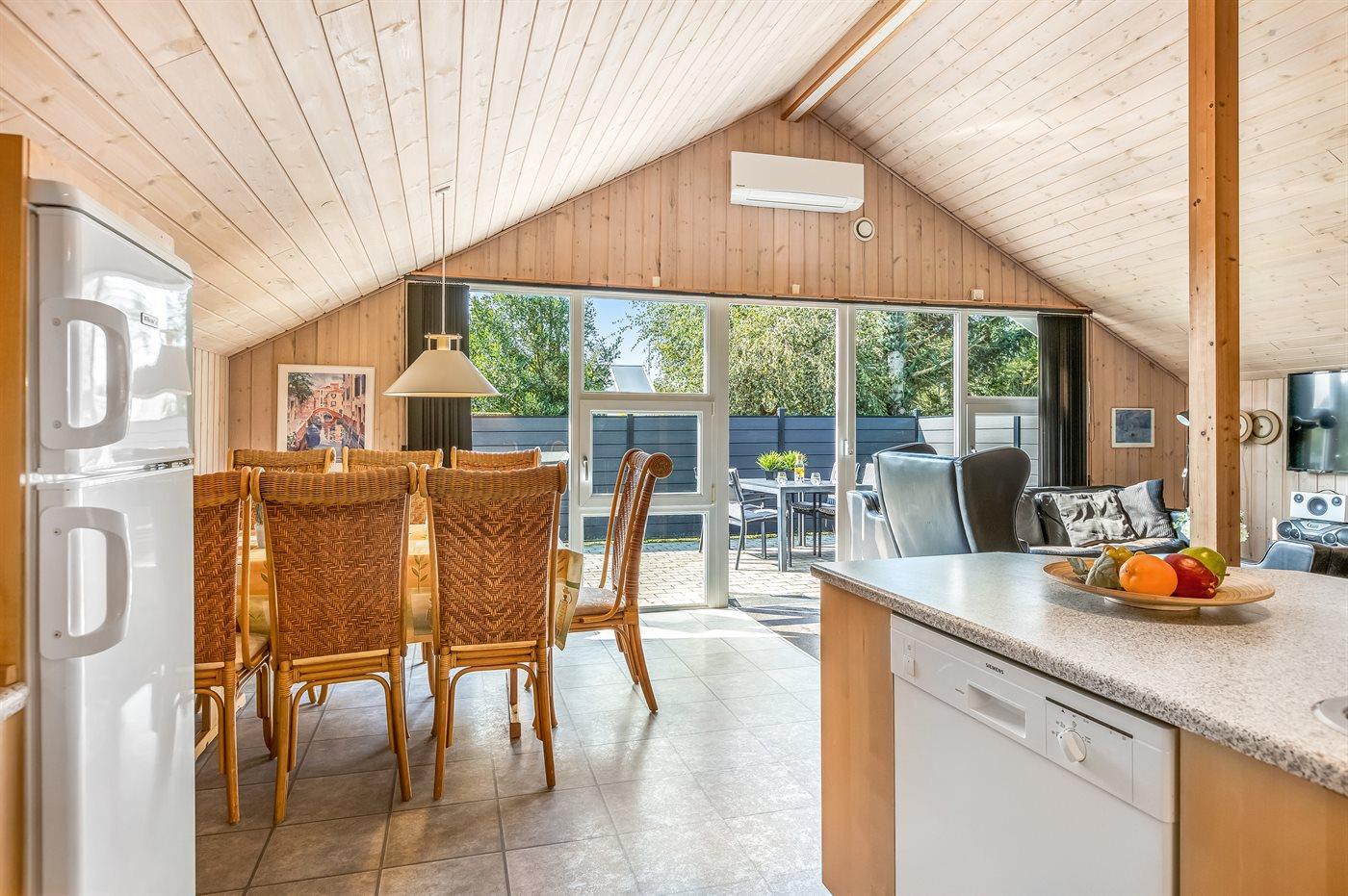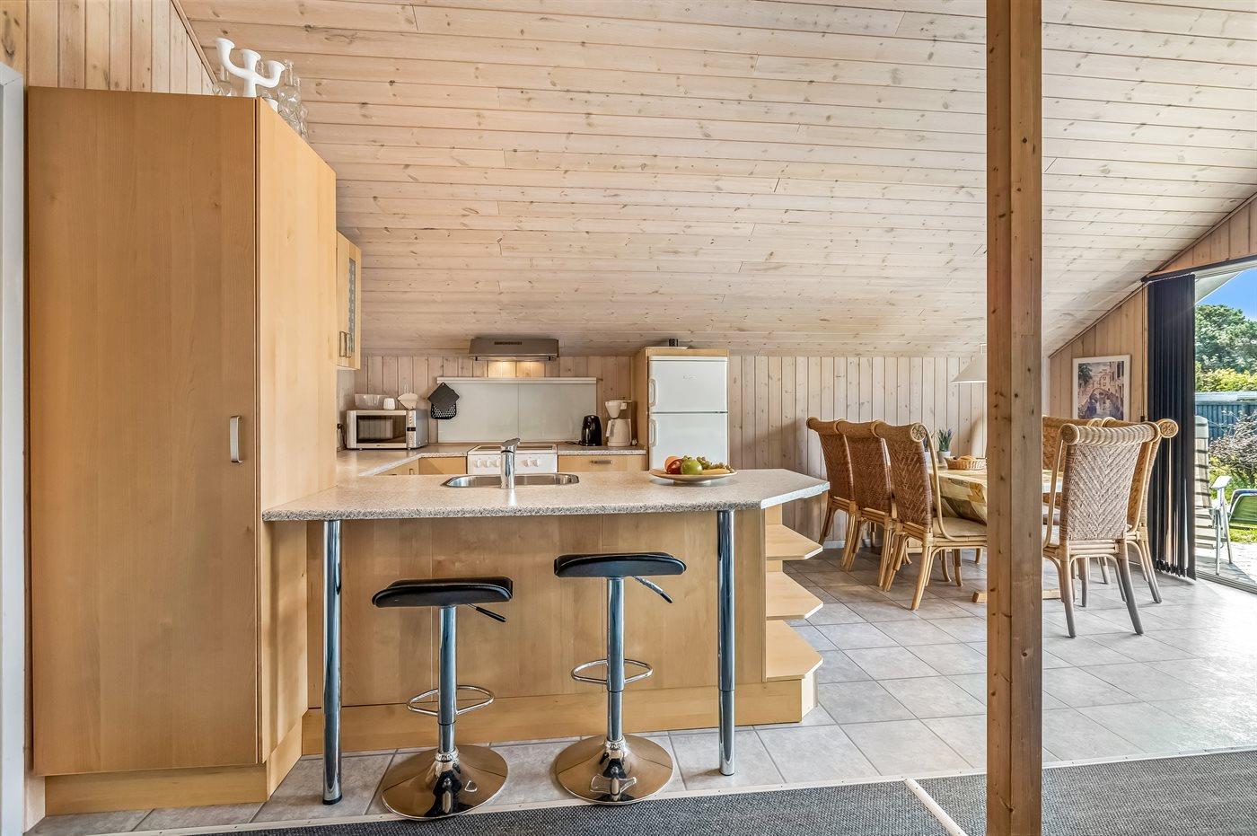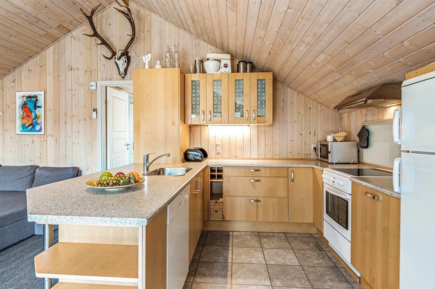 Køkkenet er udstyret med 1 køleskab. Der er 4 keramiske kogeplader, varmluftovn, mikrobølgeovn samt opvaskemaskine.