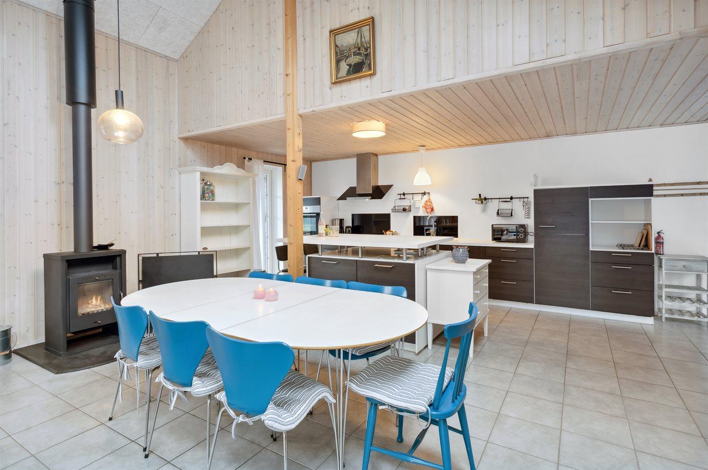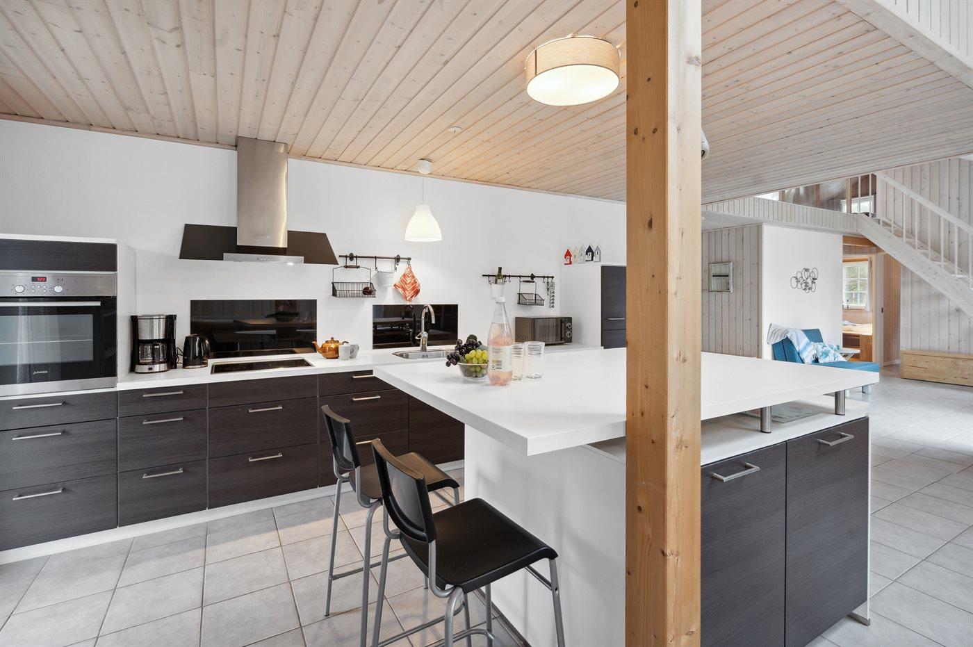 Køkkenet er udstyret med 1 køleskab. Der er 4 induktionskogeplader, varmluftovn, mikrobølgeovn samt opvaskemaskine.