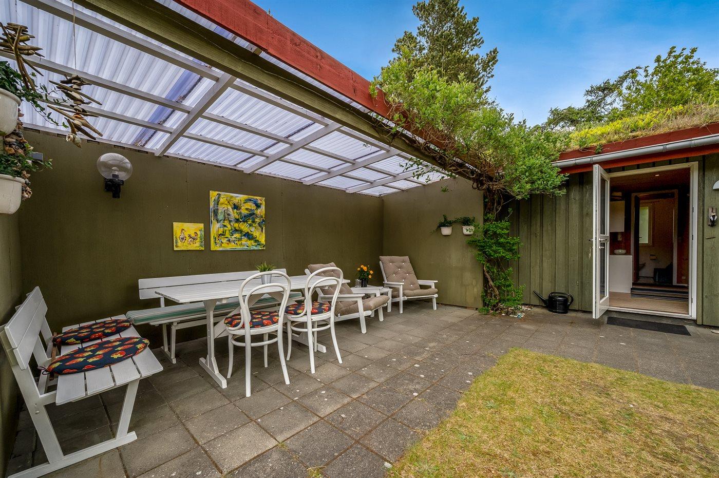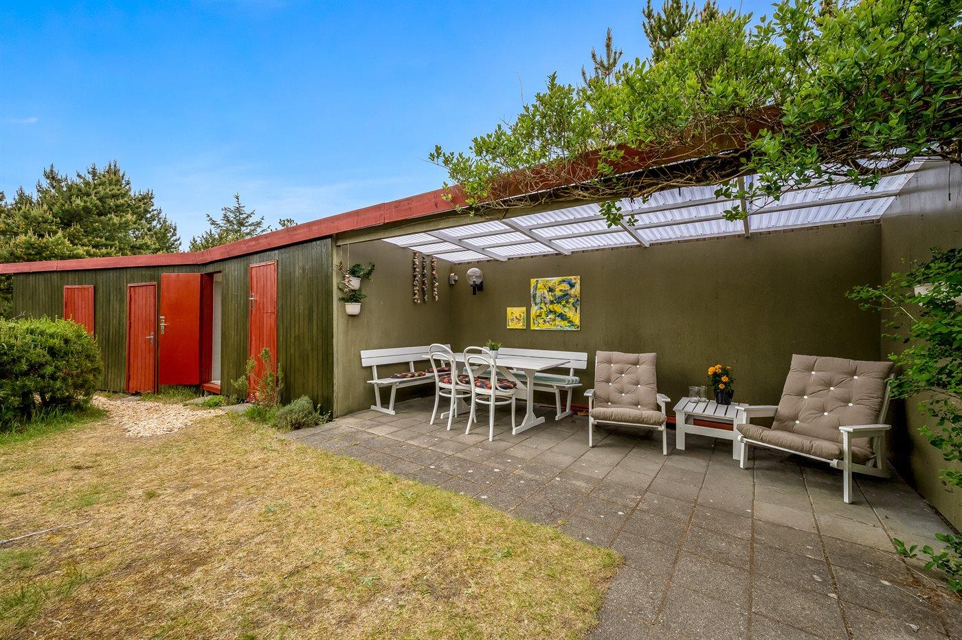 Charmerende sommerhus tæt på vandet i Vejers Strand med ugeneret have og hyggelig overdækket terrasse.