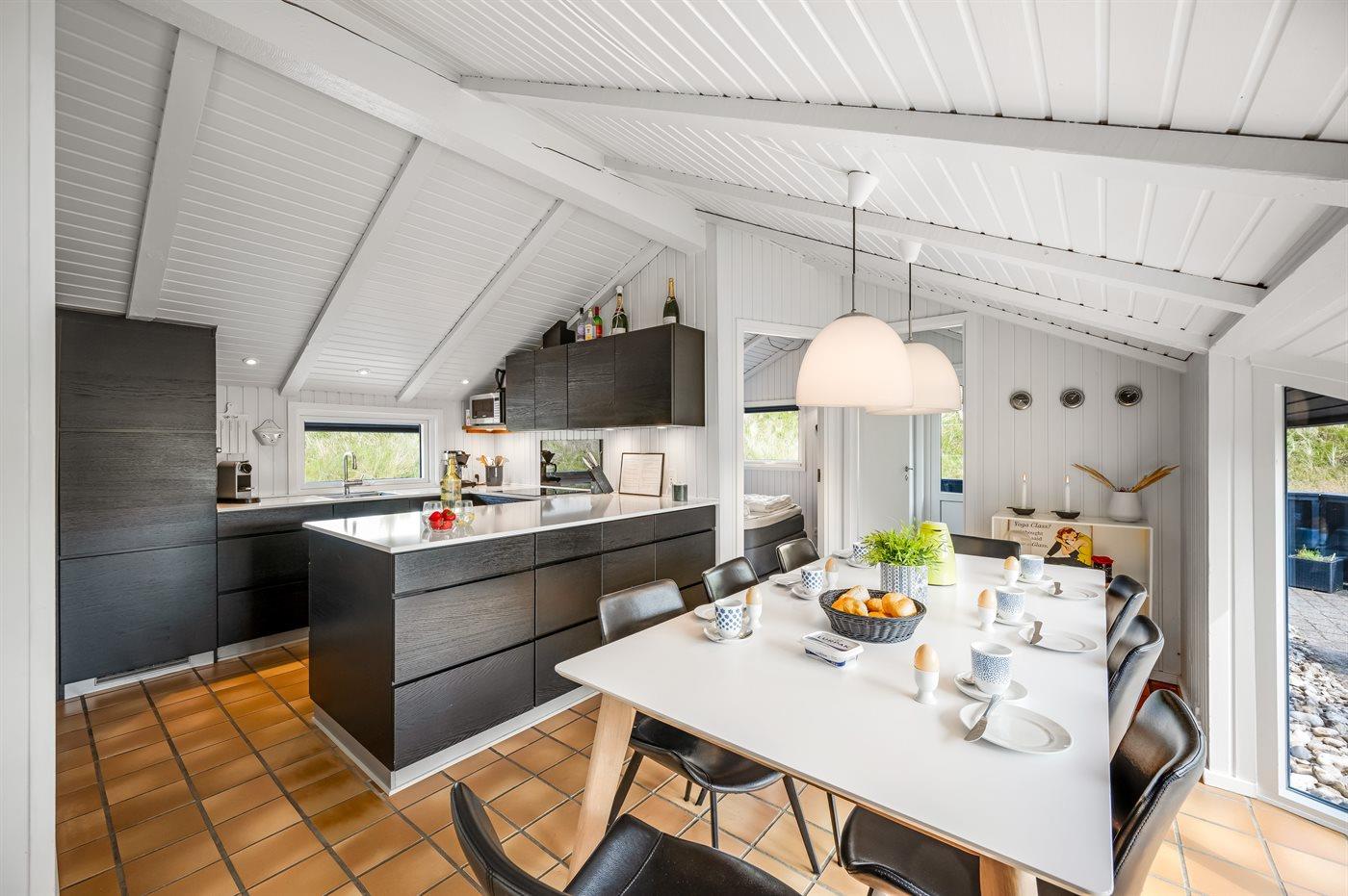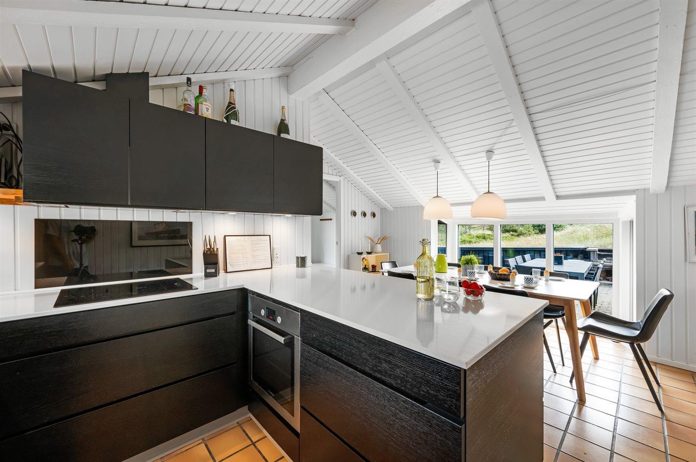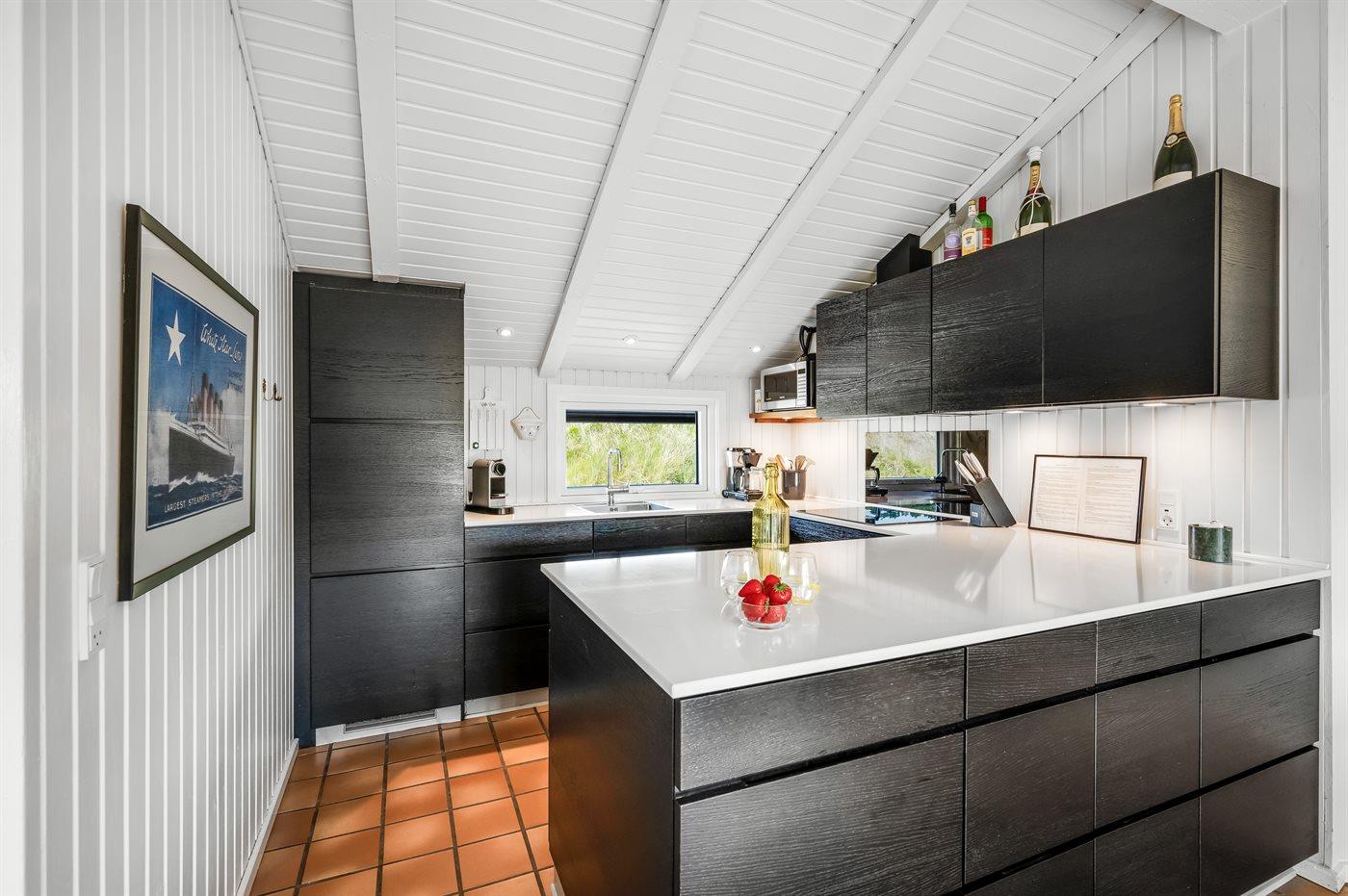 Køkkenet er udstyret med 1 køleskab. Der er 4 keramiske kogeplader, varmluftovn, mikrobølgeovn, espressomaskine, toaster samt opvaskemaskine Der er gulvvarme i køkkenet.