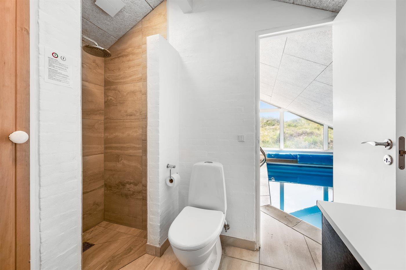 Der er 2 badeværelser med bruseniche og 2 toiletter. Der er gulvvarme på 2 badeværelser. I saunaen er der mulighed for afslapning.