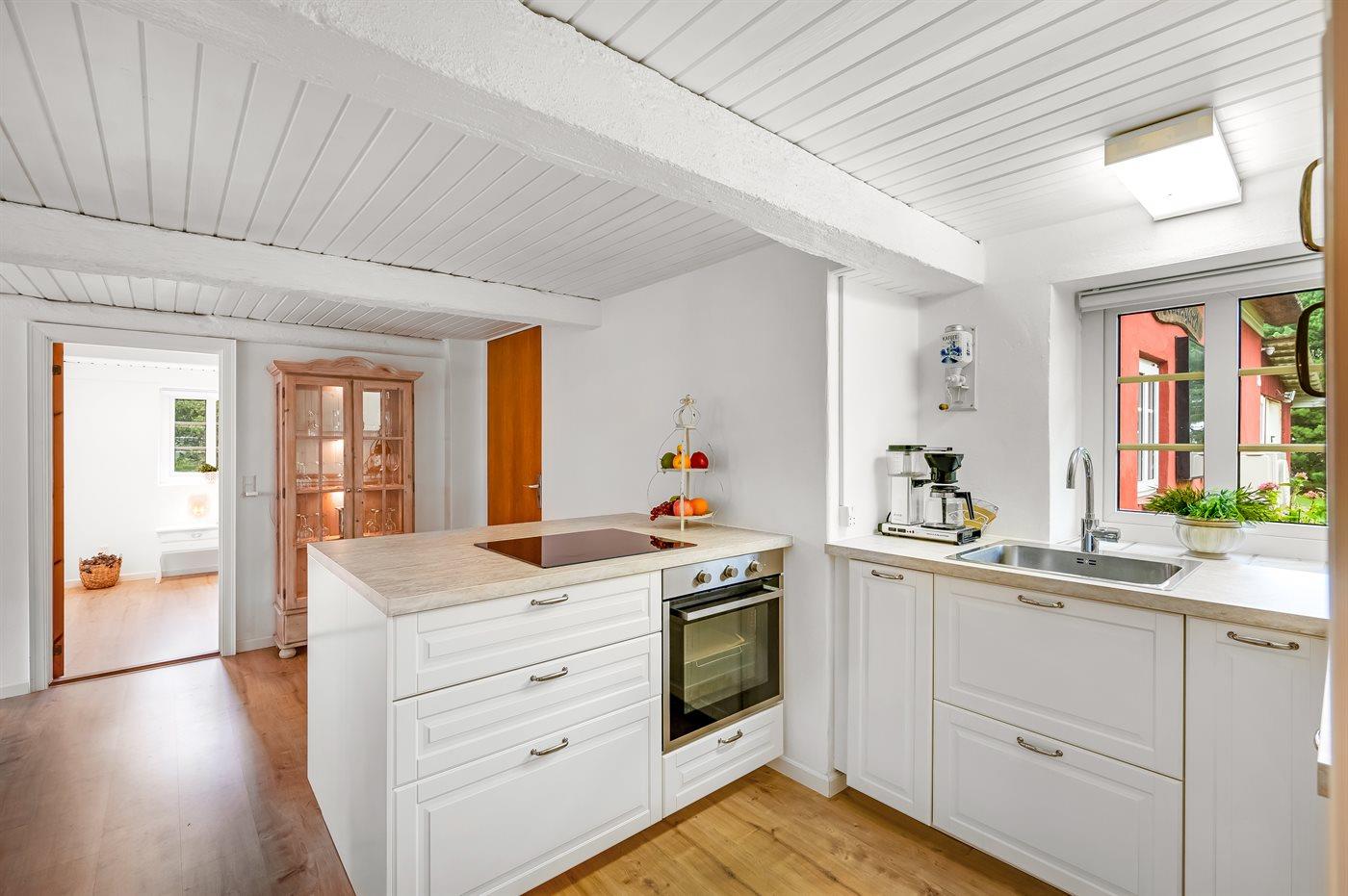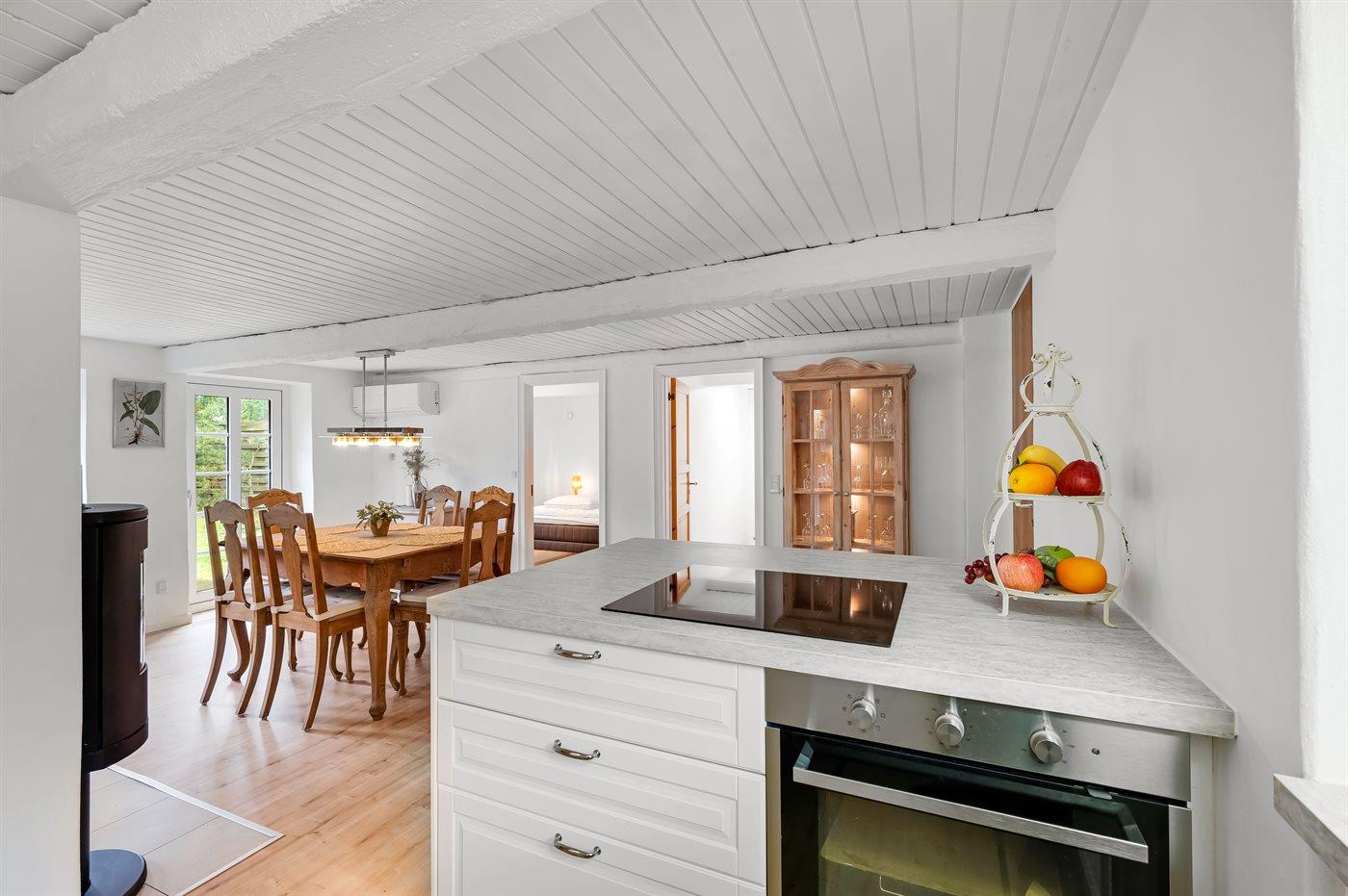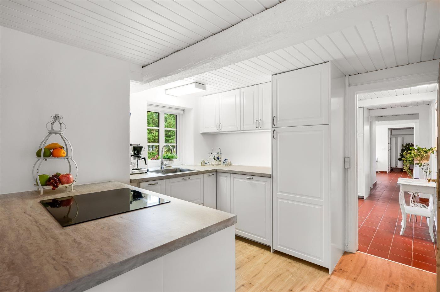 Køkkenet er udstyret med 1 køleskab. Der er 4 keramiske kogeplader, varmluftovn, mikrobølgeovn samt opvaskemaskine.