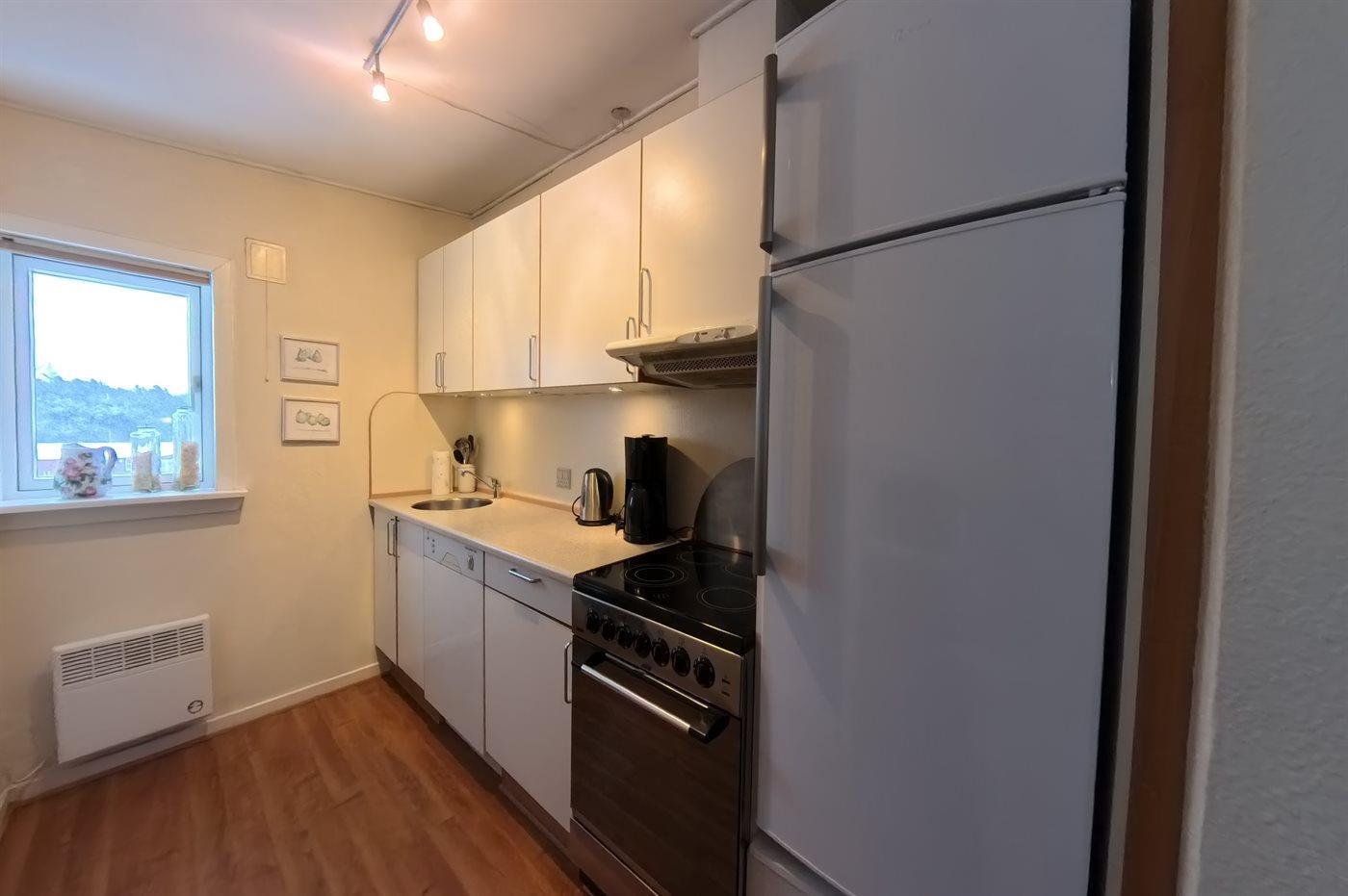 Køkkenet er udstyret med 1 køleskab. Der er 4 keramiske kogeplader, varmluftovn, mikrobølgeovn samt opvaskemaskine.
