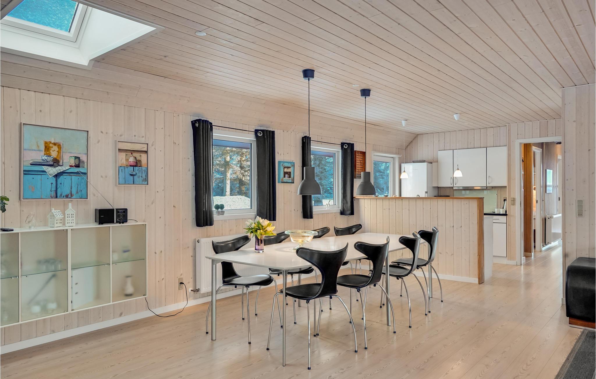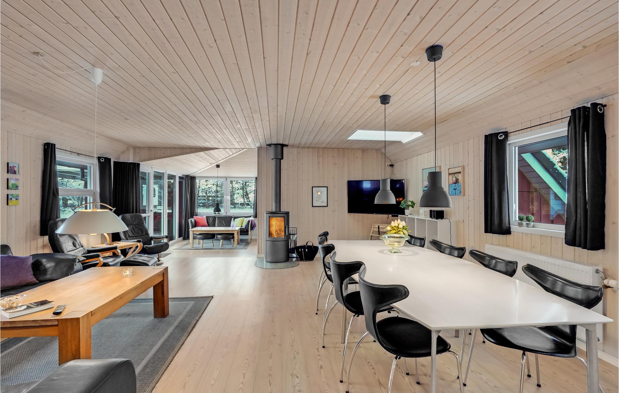Dette komfortable feriehus nær Vejers Strand har alt, hvad I skal bruge til et afslappende ophold. Her kan I ikke mindst se frem til et rummeligt poolområde med spabad og sauna. Det hyggelige køkken-alrum med brændeovn lægger op til en masse hyggestunder, mens de store terrasser - hvoraf nogle er overdækkede - giver jer et herligt sted at nyde den friske luft. Huset ligger på en ugeneret naturgrund med have lige ud til et skønt skovområde og har lave energiomkostninger. Mærk freden og roen i de lyse rum med smagfuld indretning og sæt hverdagen helt på pause.