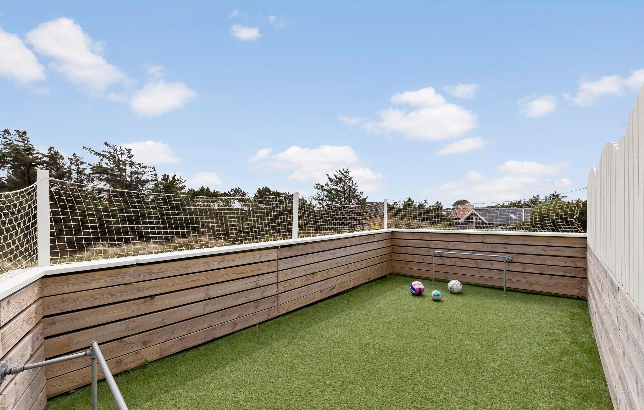 Huset er komfortabelt møbleret og fuldt udstyret med faciliteter til ferien. Den store hævede træterrasse giver jer masser af muligheder for at nyde udelivet. Den formidable udsigt mod syd og vest vil I kunne glæde jer over uanset årstid og vejr. Når børnene vil ud at boltre sig i haven, kan de se frem til et skønt område med kunstgræs og fodboldmål, hvor de kan tage et spil bold eller have det sjovt med andre udendørslege.