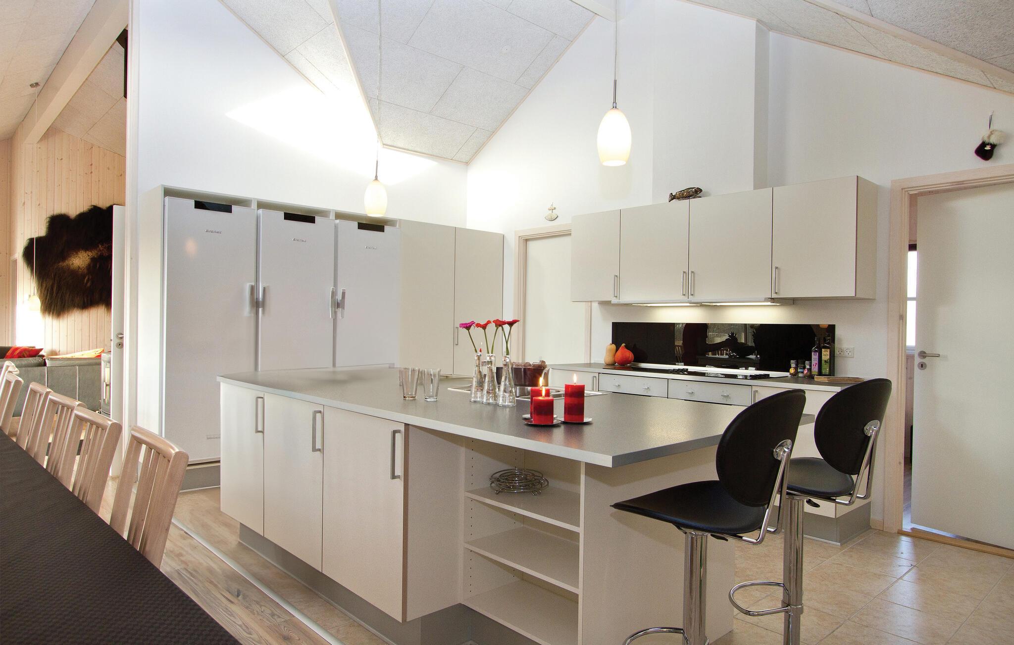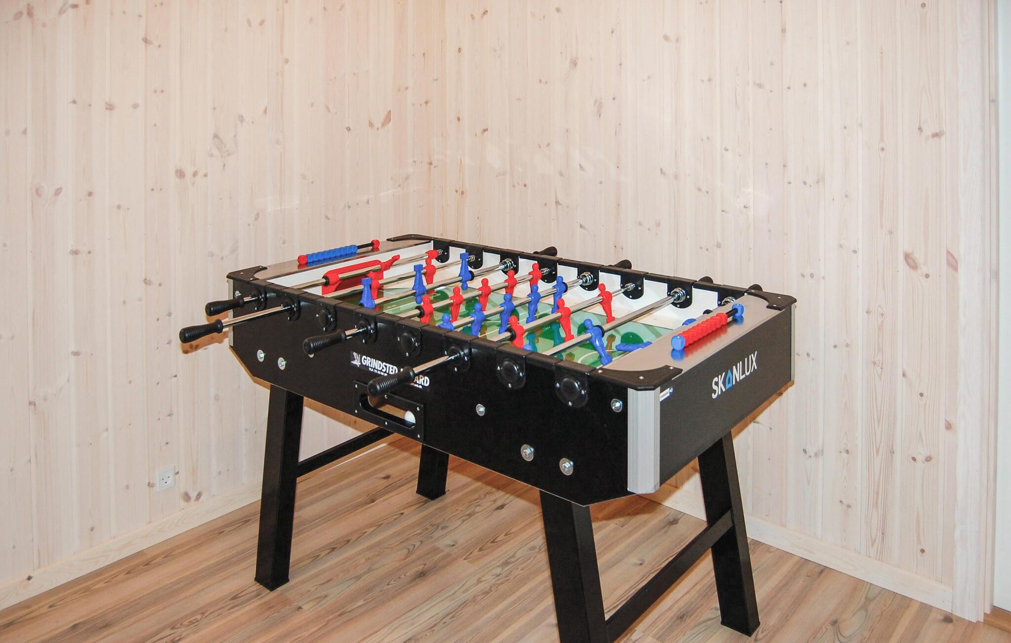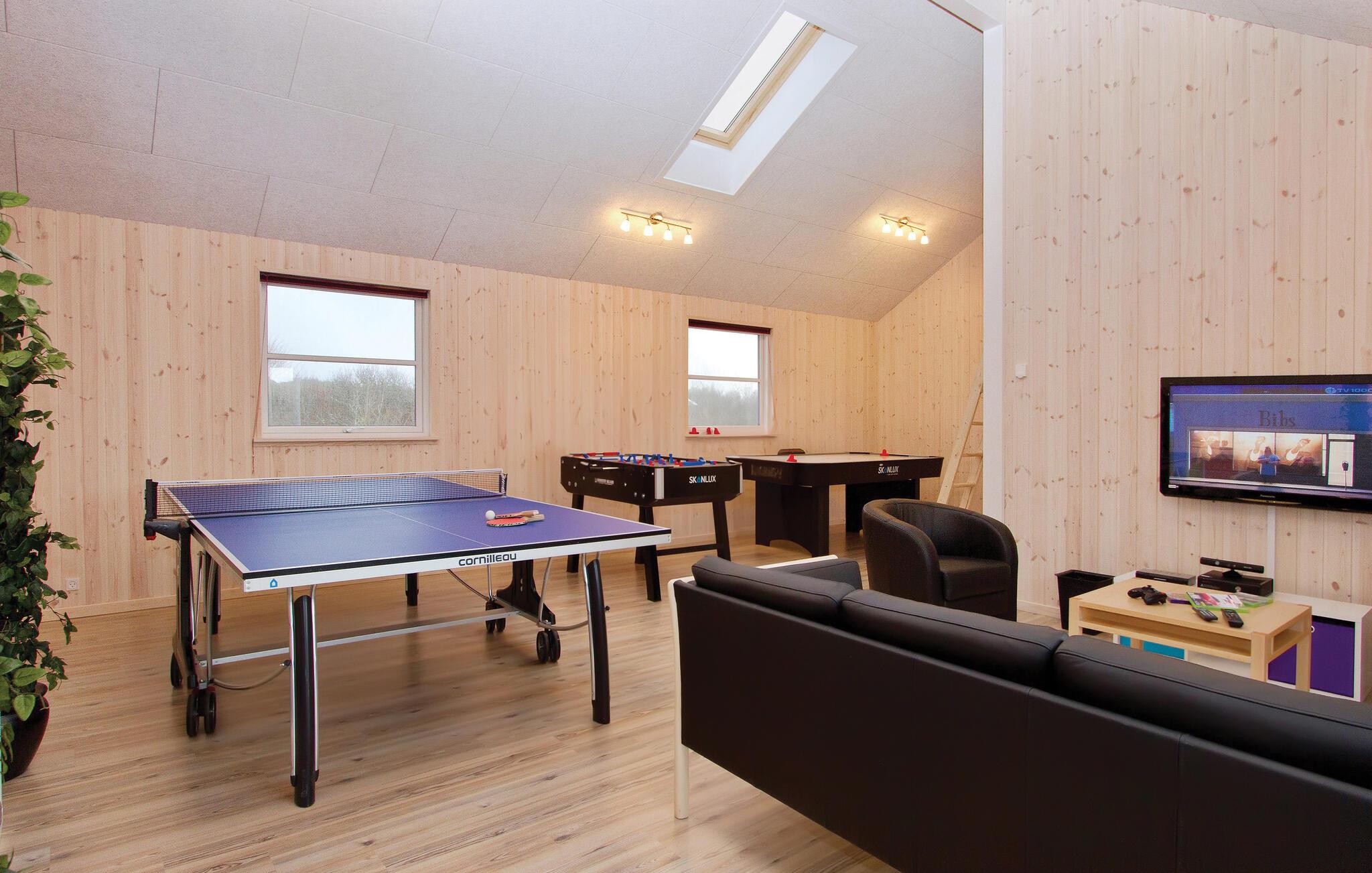 I feriehuset er alt optimeret til at forkæle mange gæster. Ti flotte og rummelige værelser i tre afdelinger med hver sit badeværelse og fire madrasser på en stor og højloftet hems. Stor stue med brændeovn samt meget rummeligt køkken/alrum med direkte udgang til en delvis overdækket terrasse. Desuden en aktivitetshems samt to aktivitetsrum, der er store nok til både flere aktivitetsmuligheder som billard, dart, bar, bordtennis, bordfodbold, airhockey og spillekonsol.