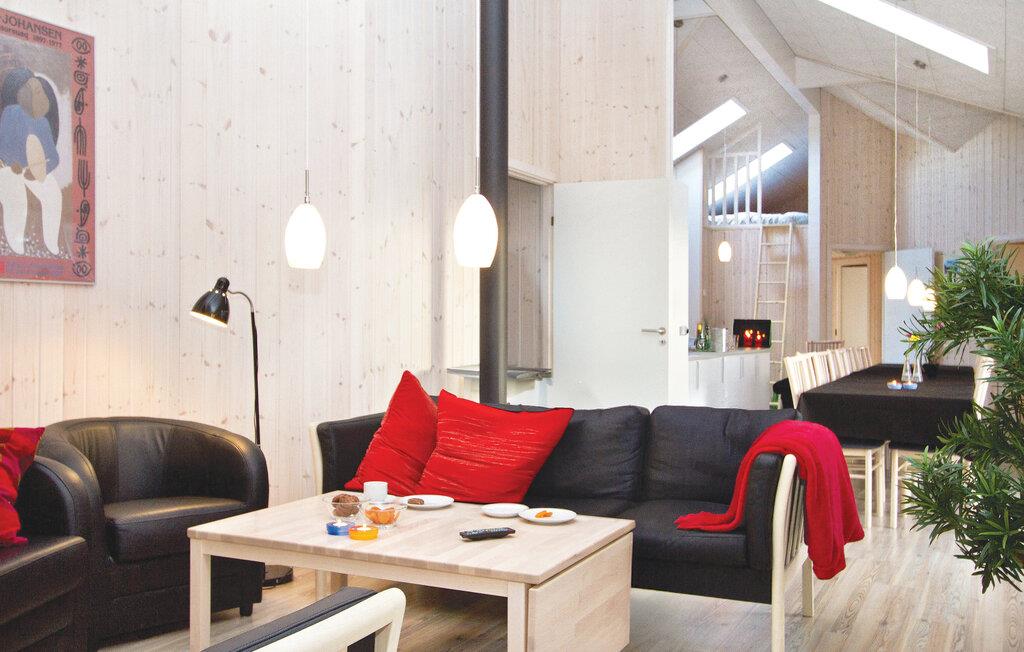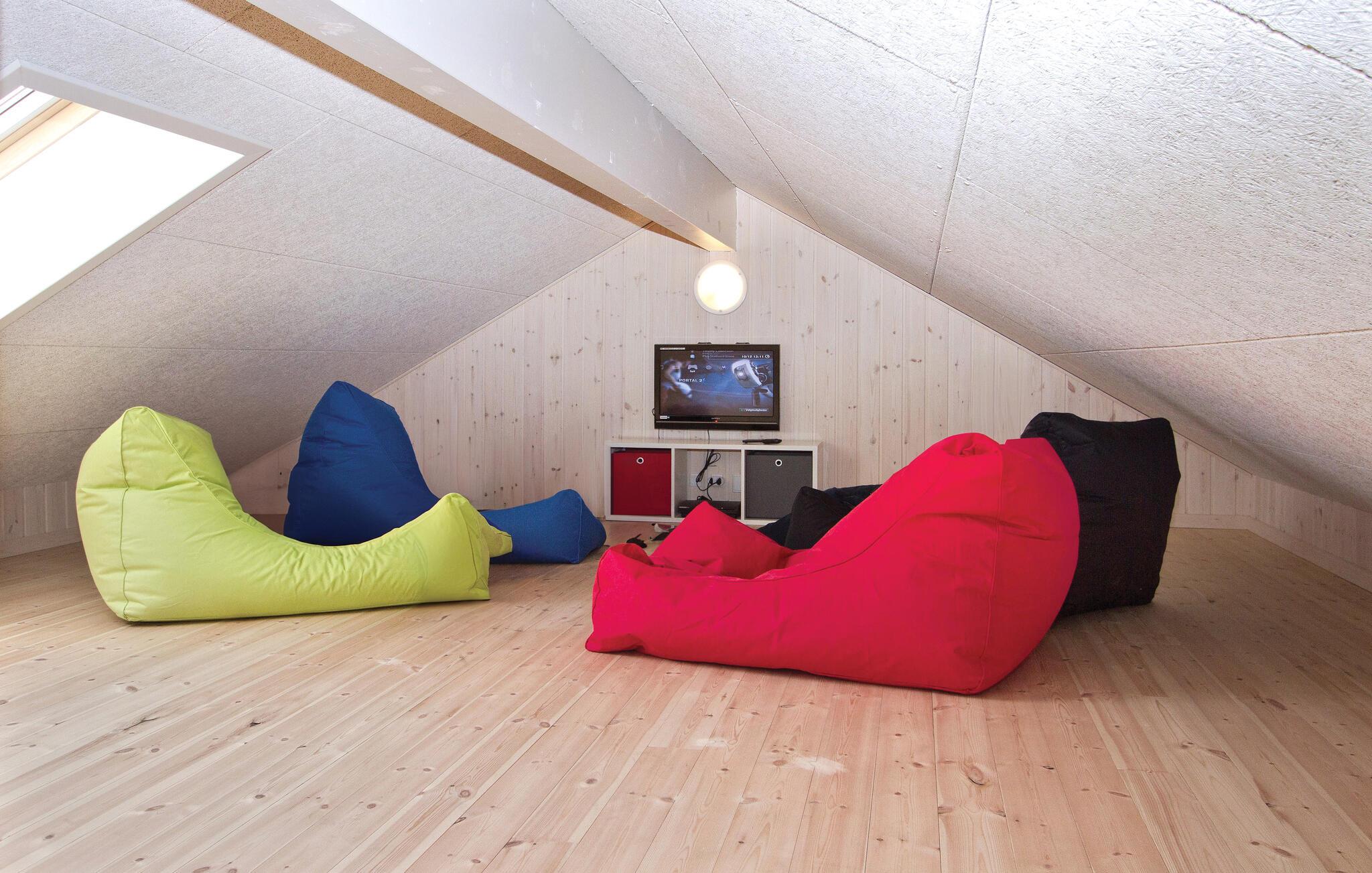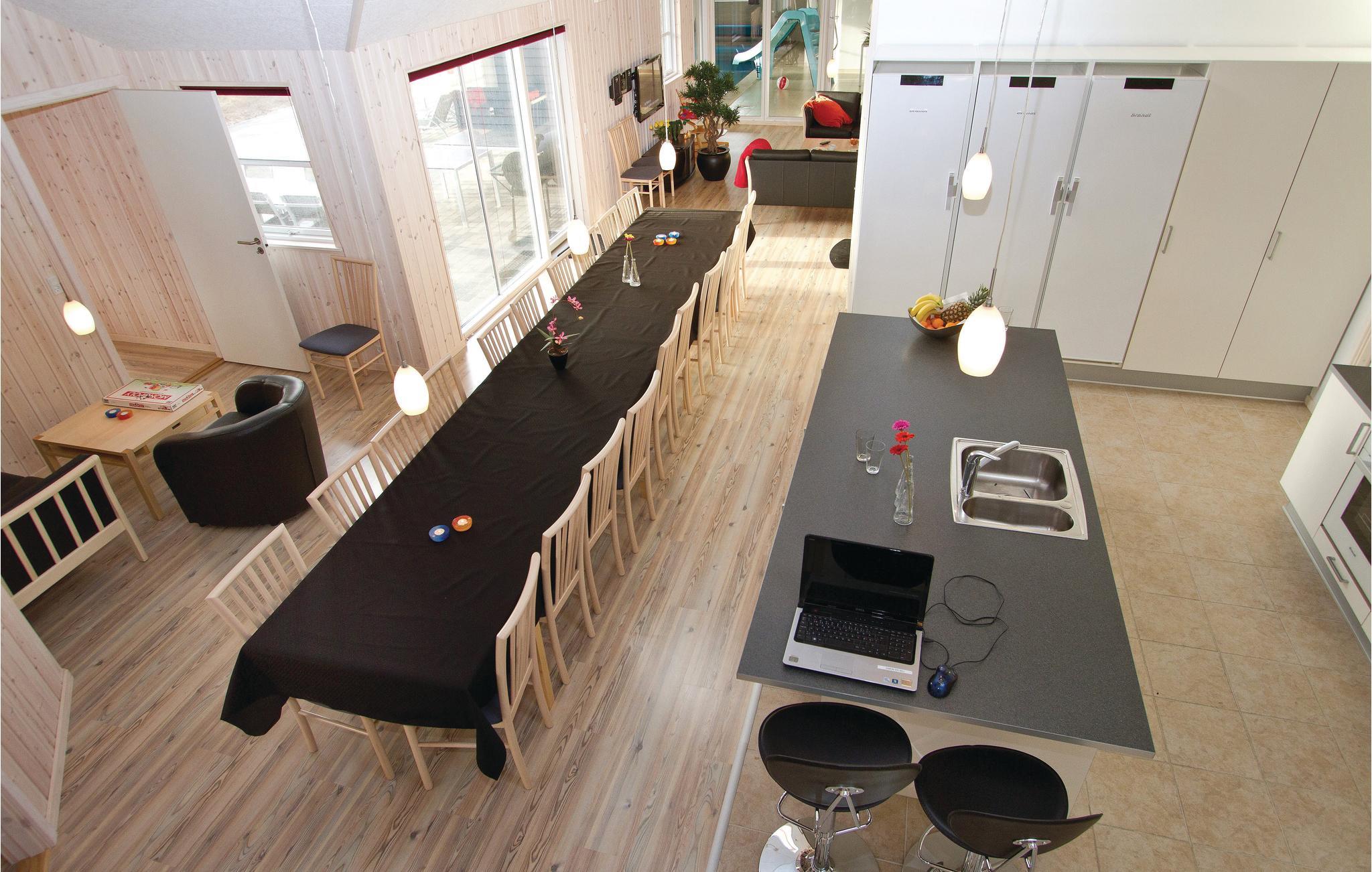I feriehuset er alt optimeret til at forkæle mange gæster. Ti flotte og rummelige værelser i tre afdelinger med hver sit badeværelse og fire madrasser på en stor og højloftet hems. Stor stue med brændeovn samt meget rummeligt køkken/alrum med direkte udgang til en delvis overdækket terrasse. Desuden en aktivitetshems samt to aktivitetsrum, der er store nok til både flere aktivitetsmuligheder som billard, dart, bar, bordtennis, bordfodbold, airhockey og spillekonsol.
