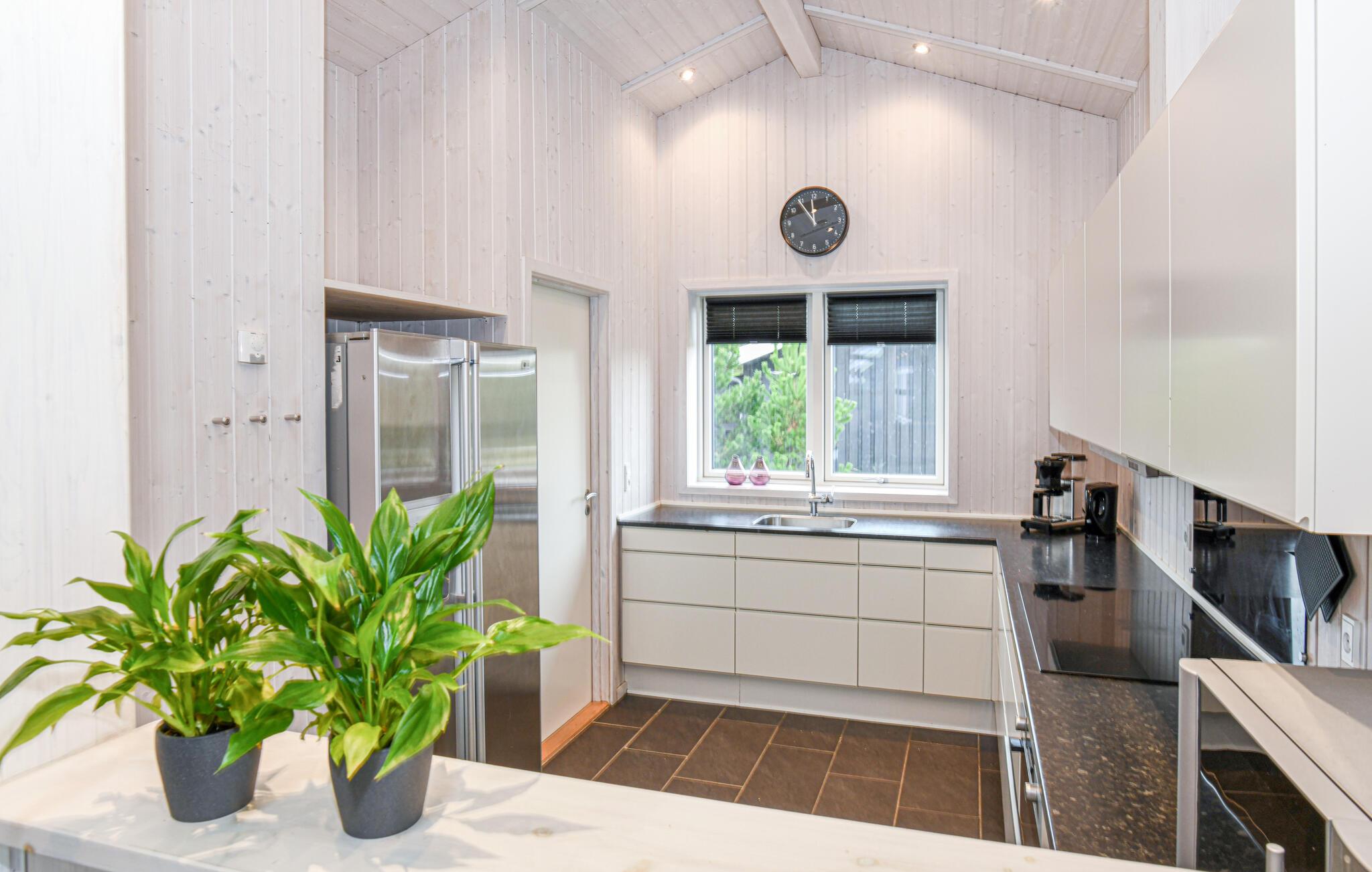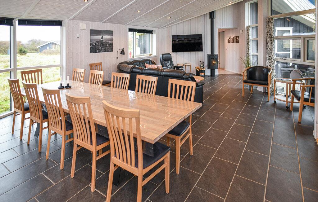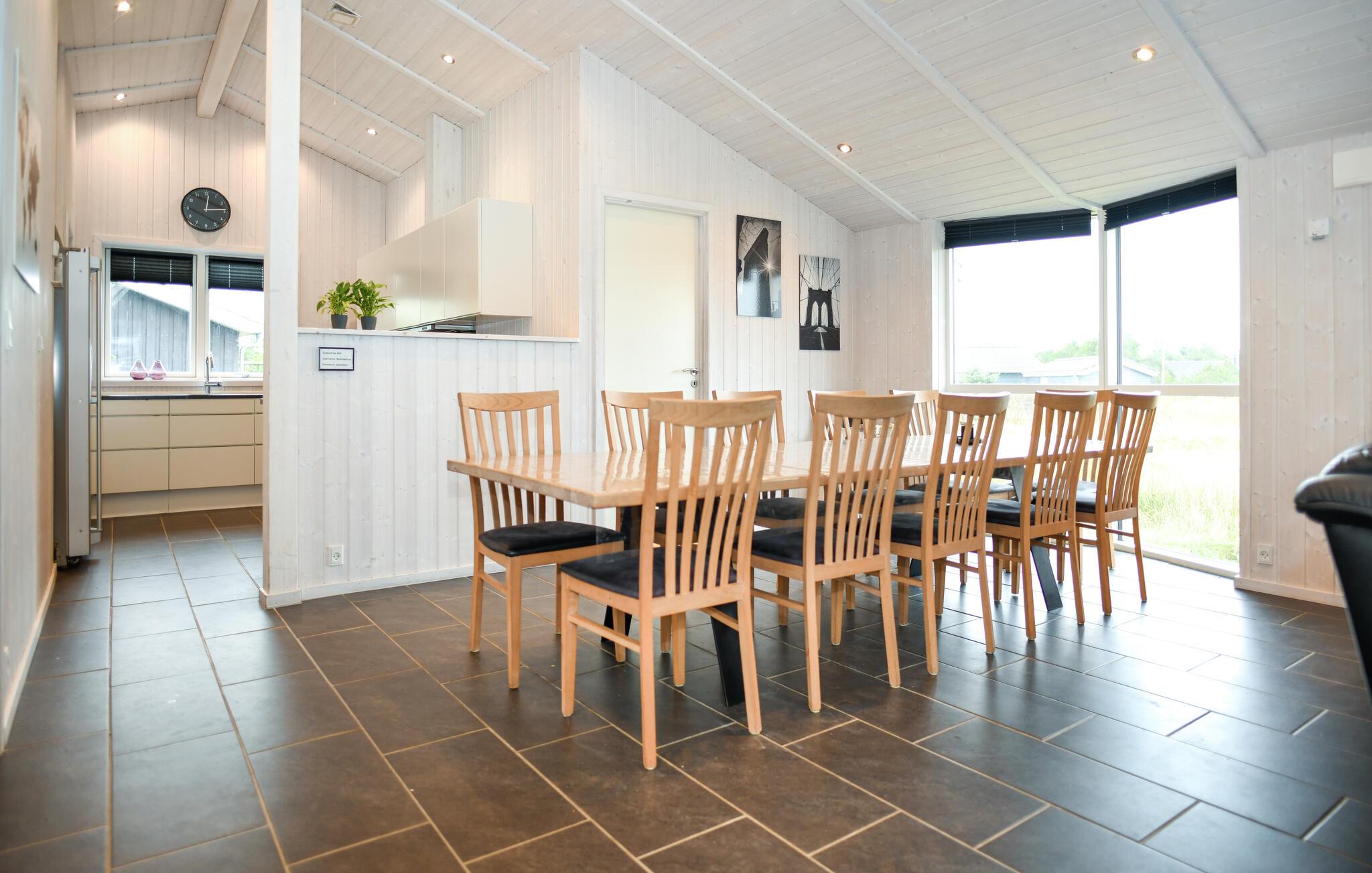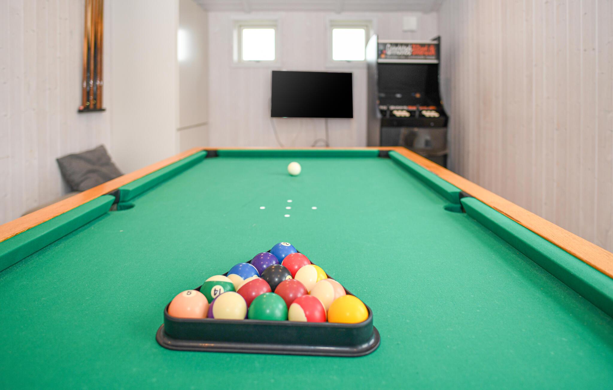 Nyd den lyse opholdsstue med den store sofagruppe. Tilbered jeres måltider i det elegante, moderne køkken, som tilbyder rigeligt med bordplads til fælles madlavning. Brug det lange spisebord til fælles måltider eller til hyggelige aftener med spil og underholdning. Slap af i spabadet, eller nyd varmen fra brændeovnen efter en lang dag på stranden. Tag et spil billard, eller udfordr hinanden ved spillekonsollen.